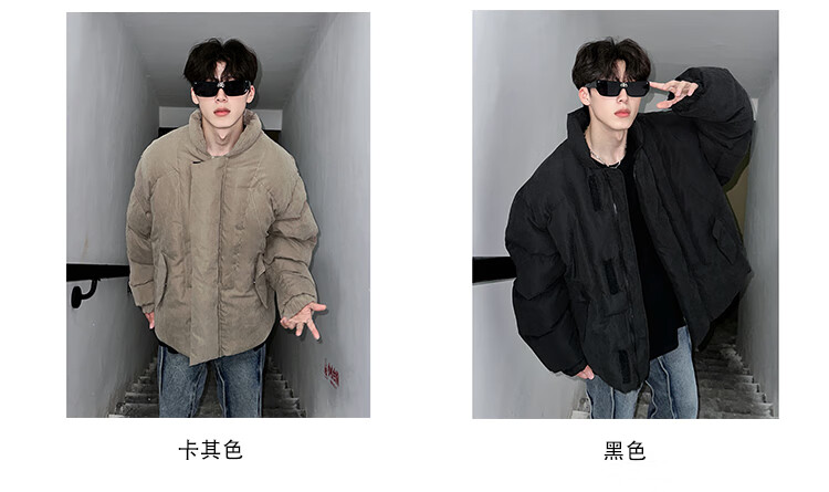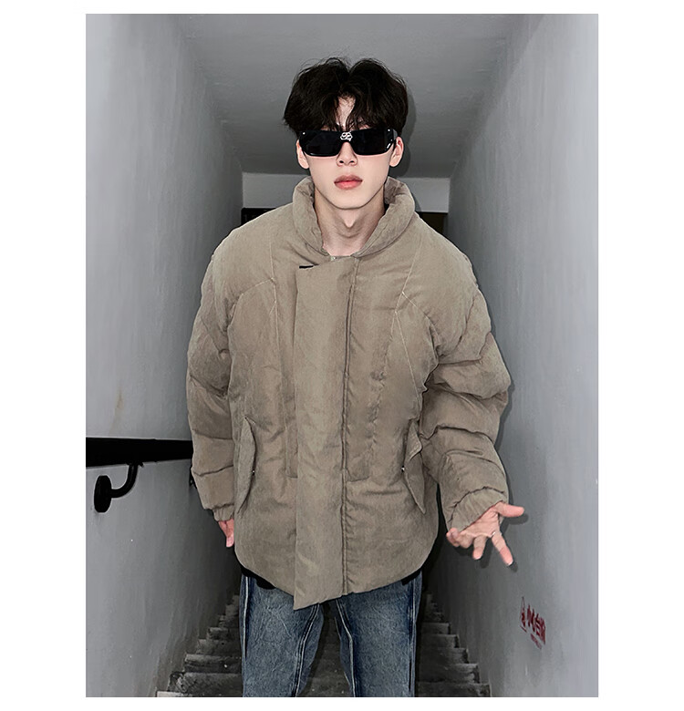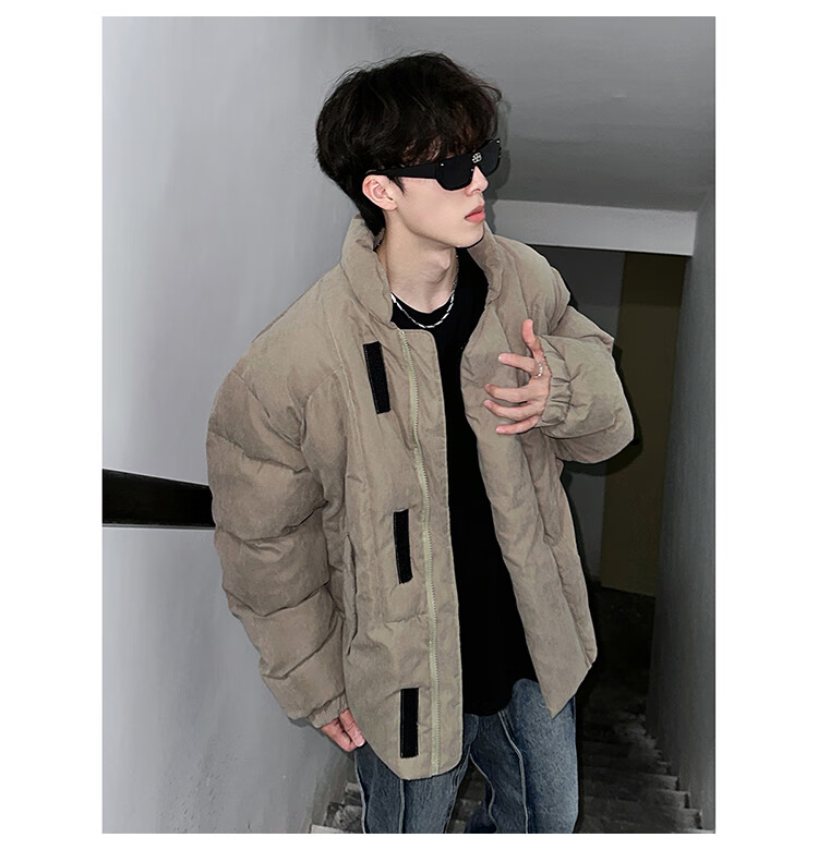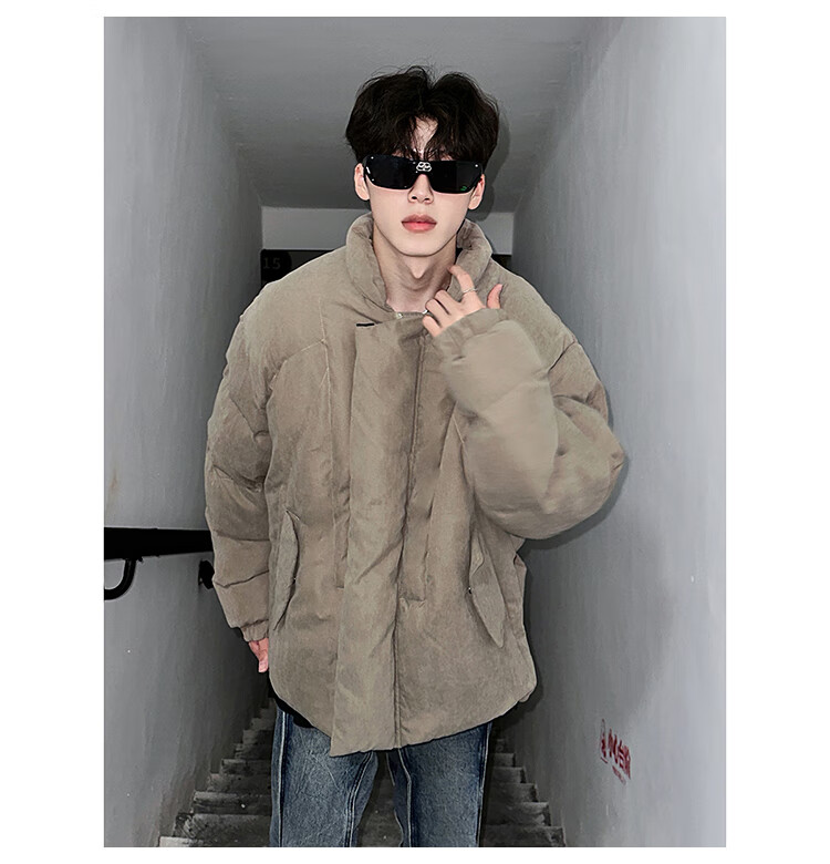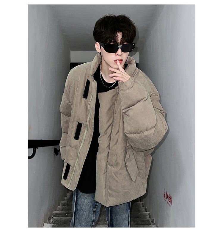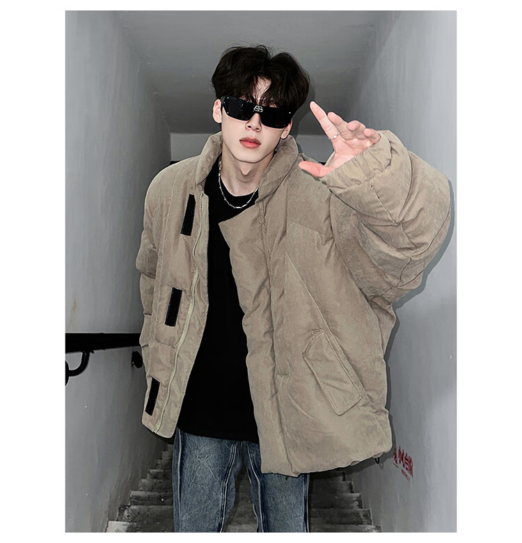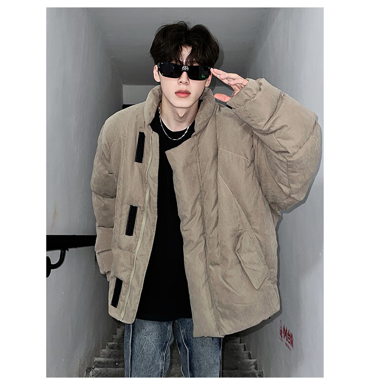 Poke American Suede Cotton Jacket Men's Winter New High Street Fashion Brand Thick Warm Stand-up Collar Cotton Jacket Loose and Versatile Khaki XL