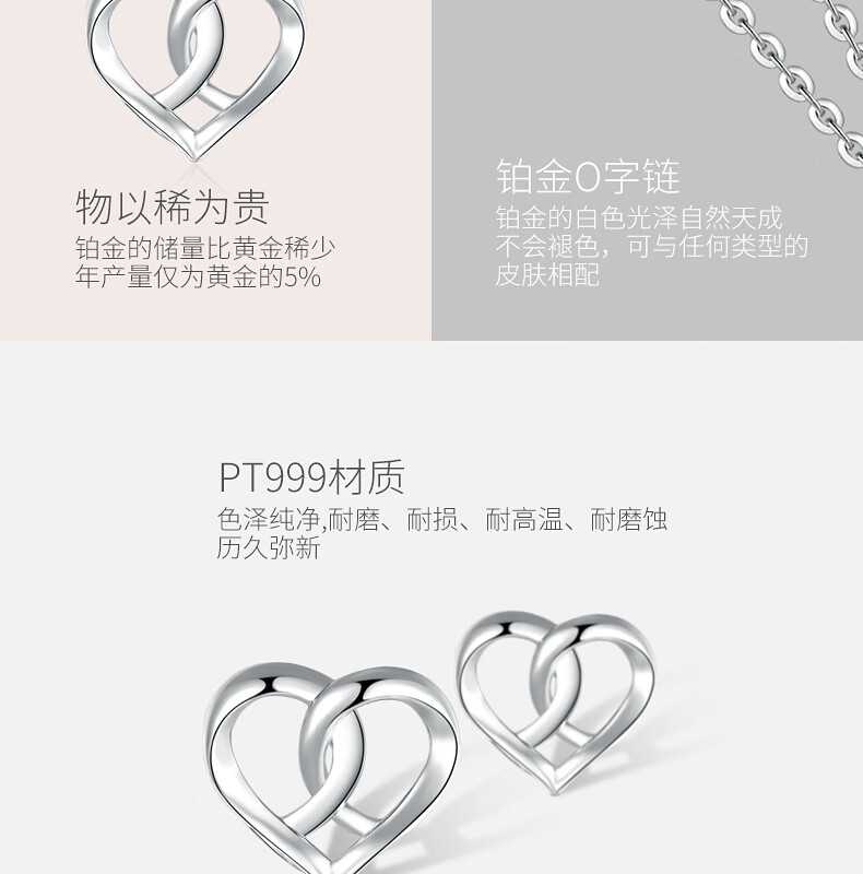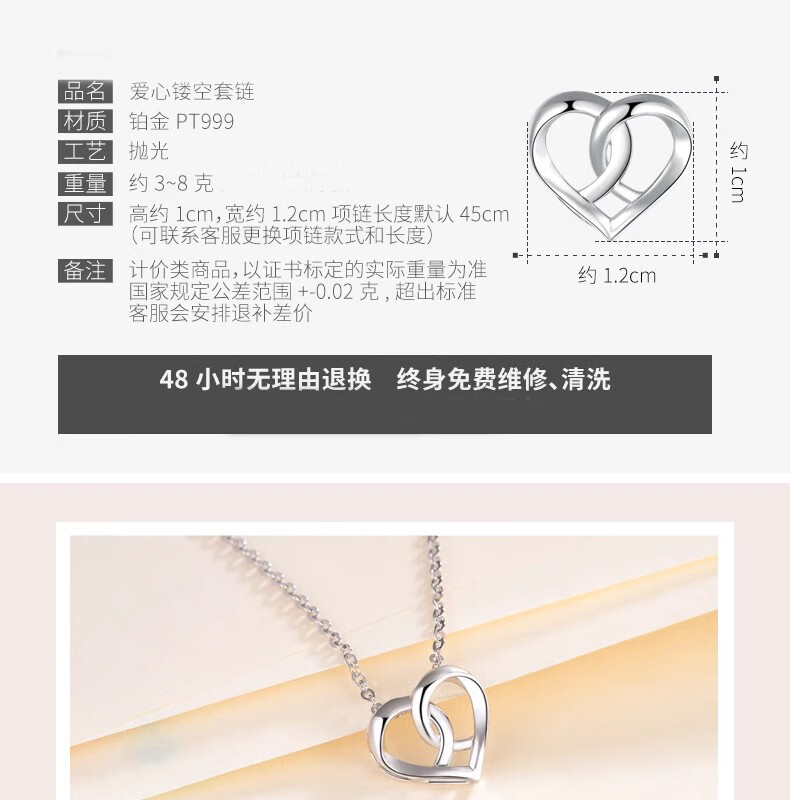 Junhong PT999 Platinum Necklace Women's Necklace Heart-Shaped Boutique Chain Platinum Love Pendant Clavicle Chain Women's Gift PT999 Platinum Chain 4.84g