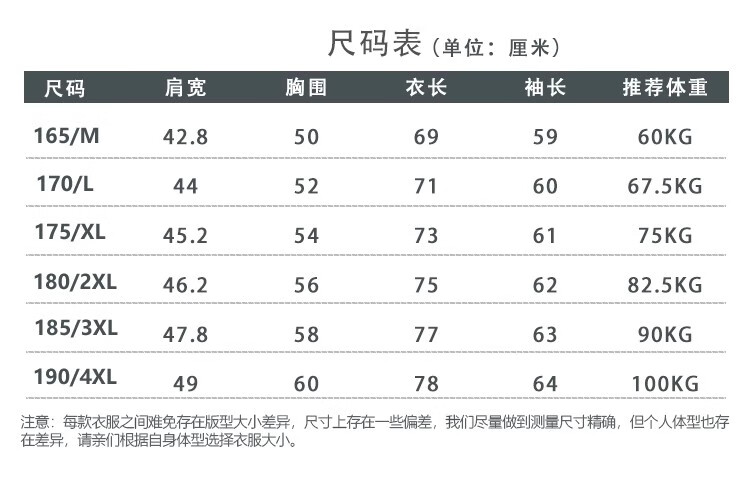 China (cm) 165 / 88-90 170 / 96-98 175 / 108-110 180 / 118-122 185 / 126-130