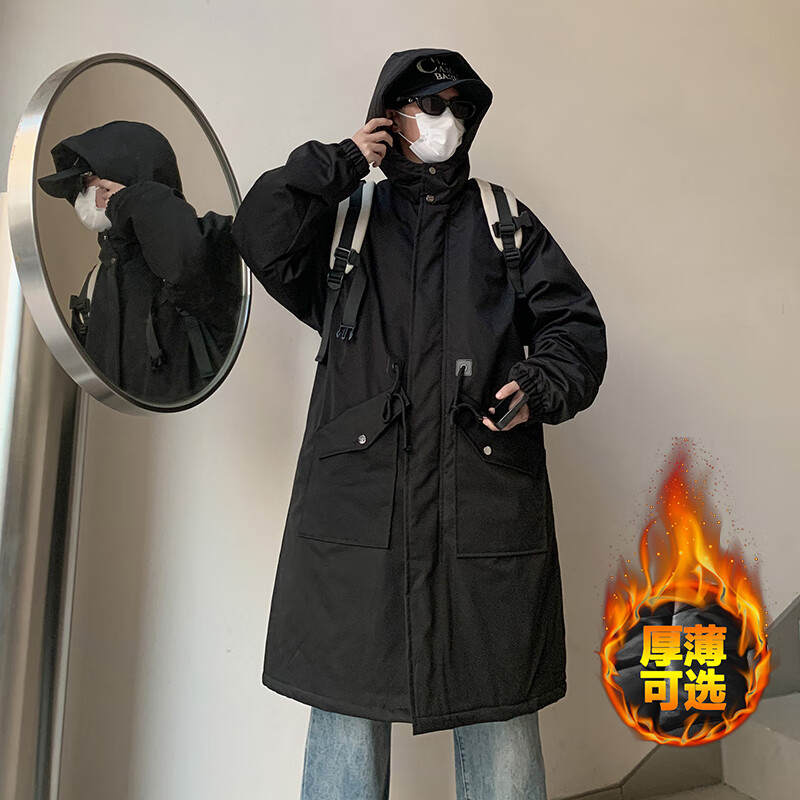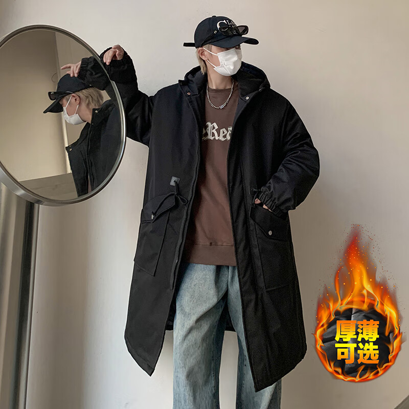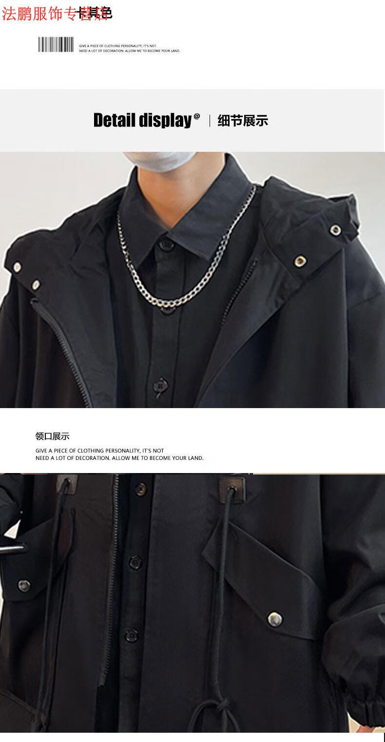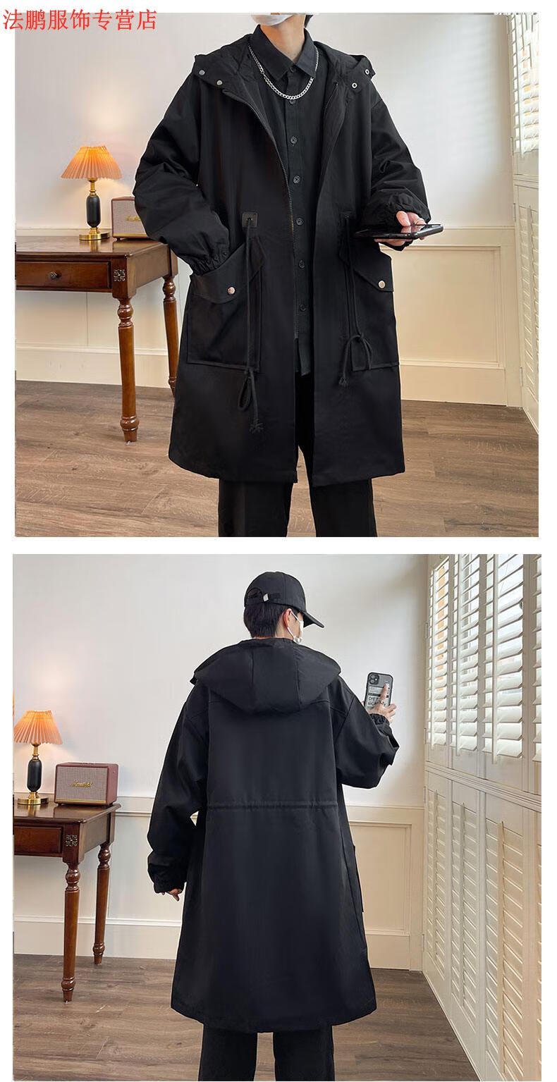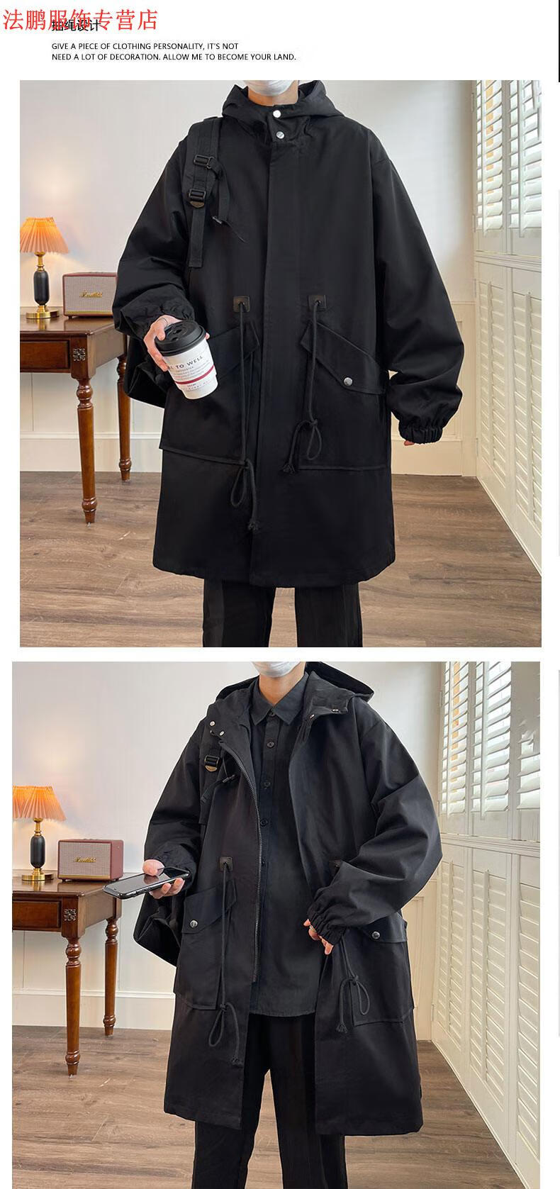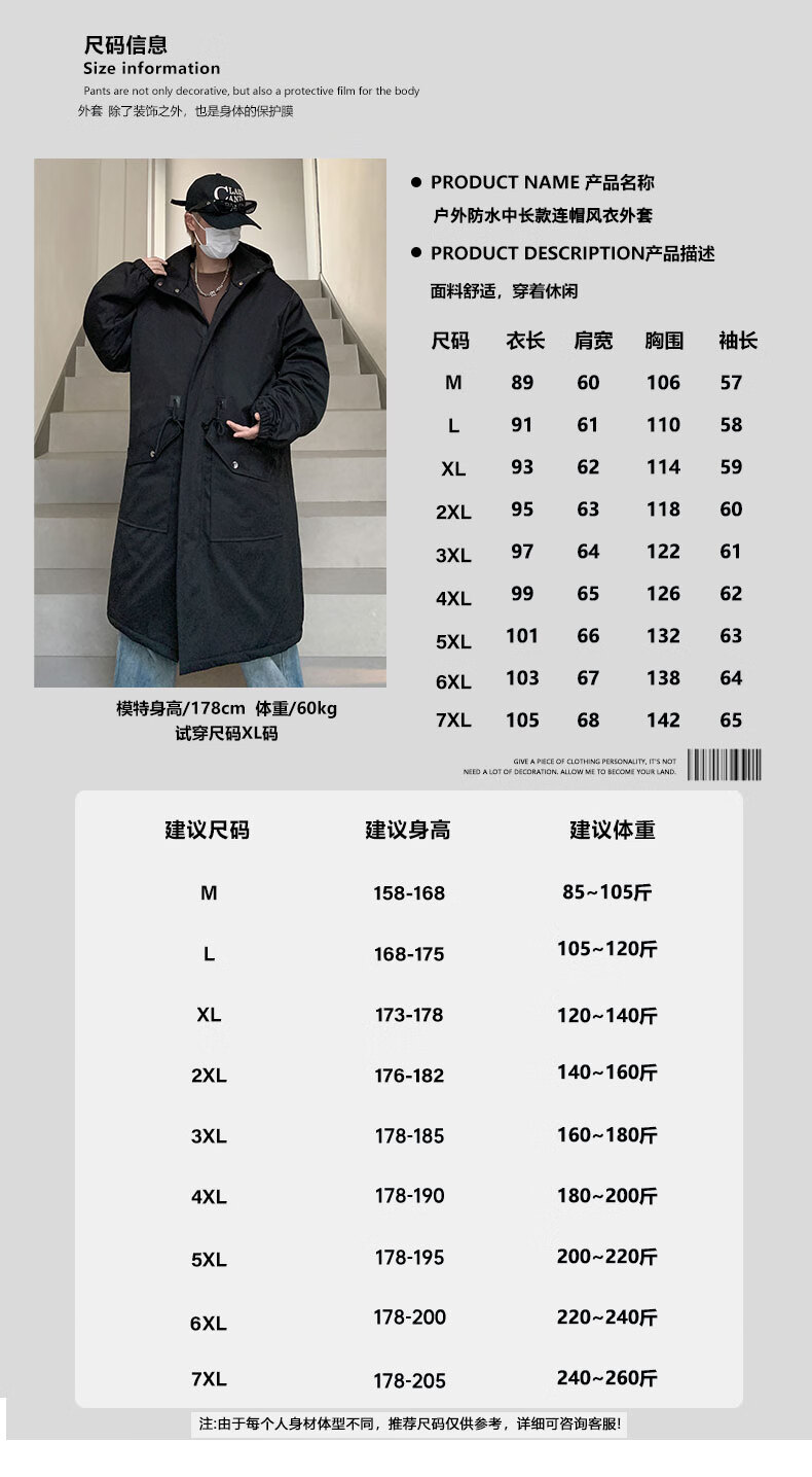 卡鲁微300斤特大码中长款风衣男士胖子连帽加棉外套男2025新款工装大衣 黑色加棉 厚款 5XL 建议200-220斤