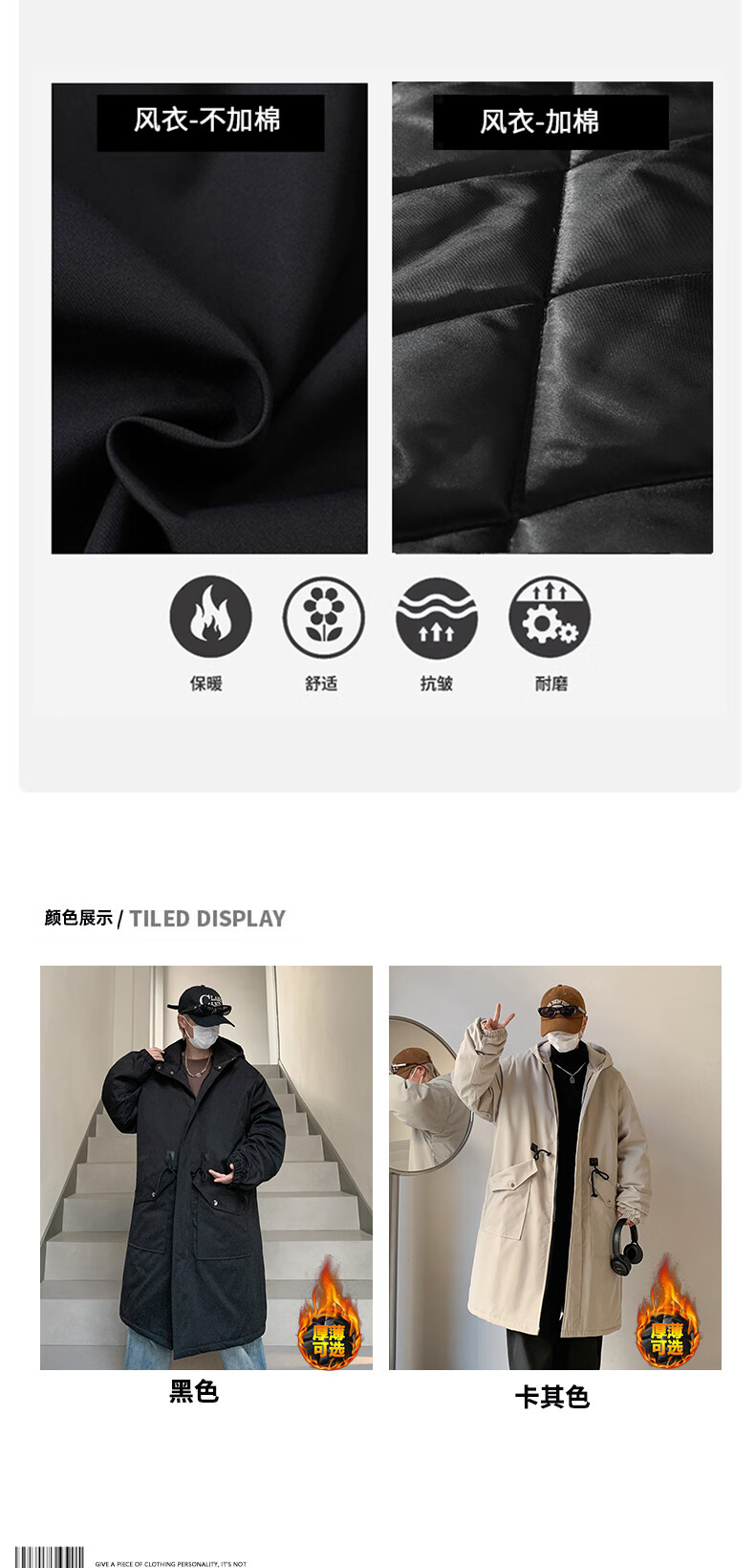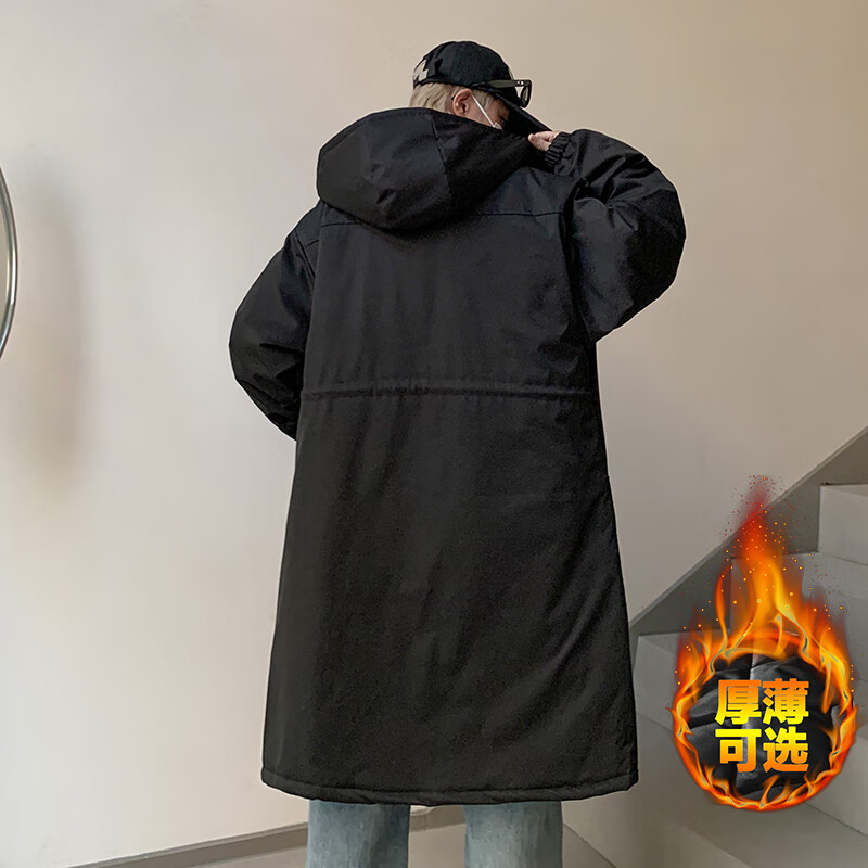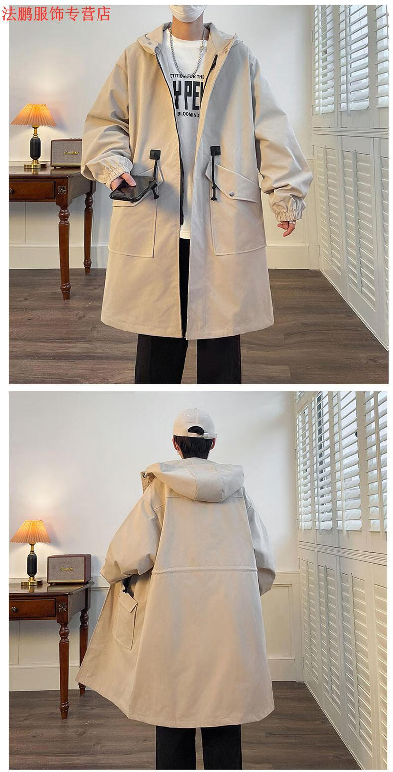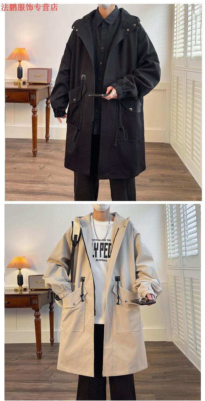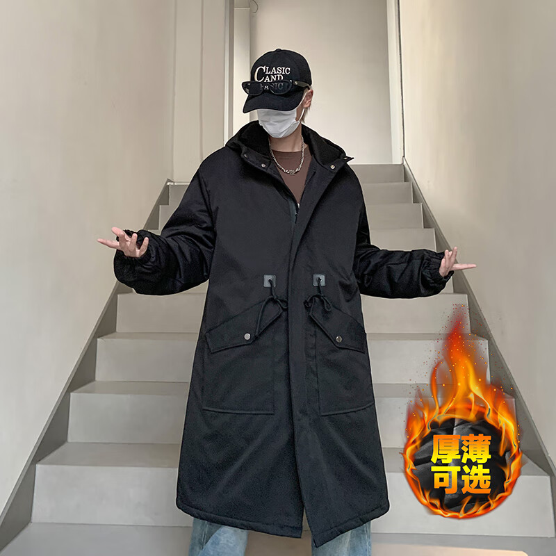 卡鲁微300斤特大码中长款风衣男士胖子连帽加棉外套男2025新款工装大衣 黑色加棉 厚款 5XL 建议200-220斤