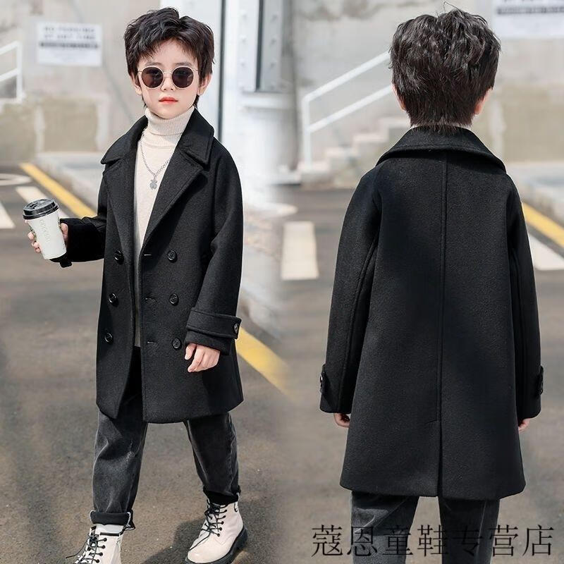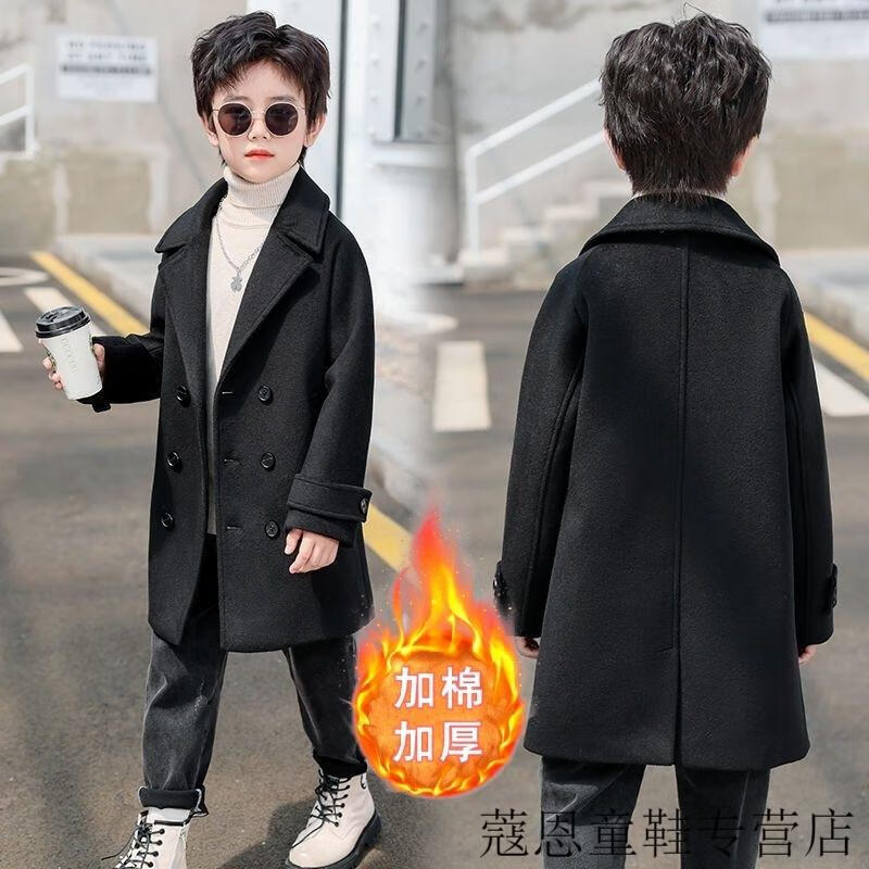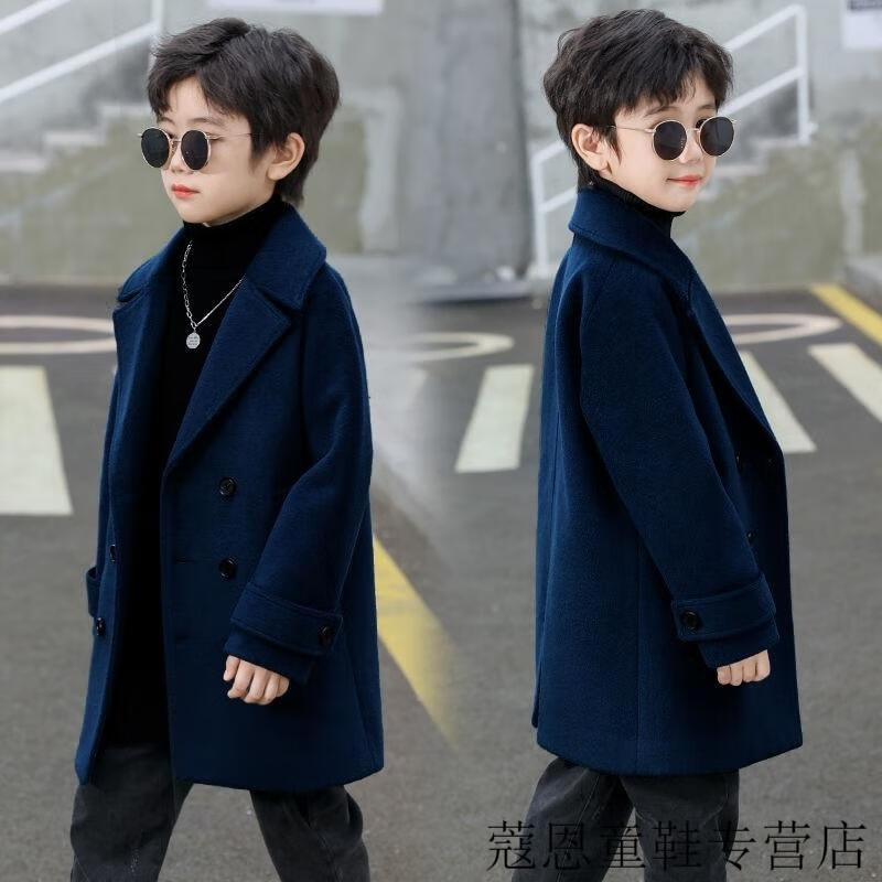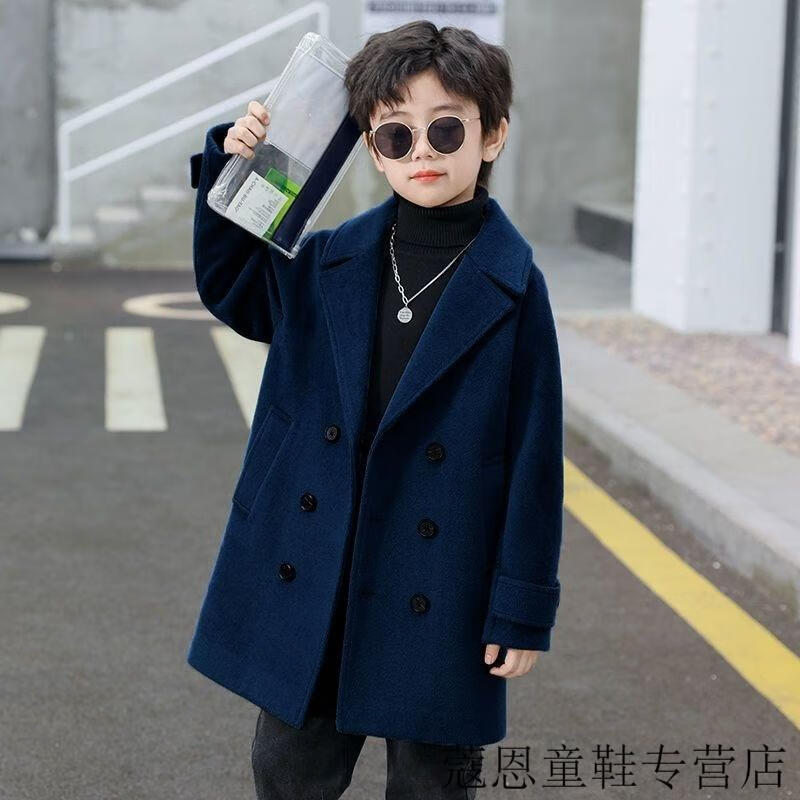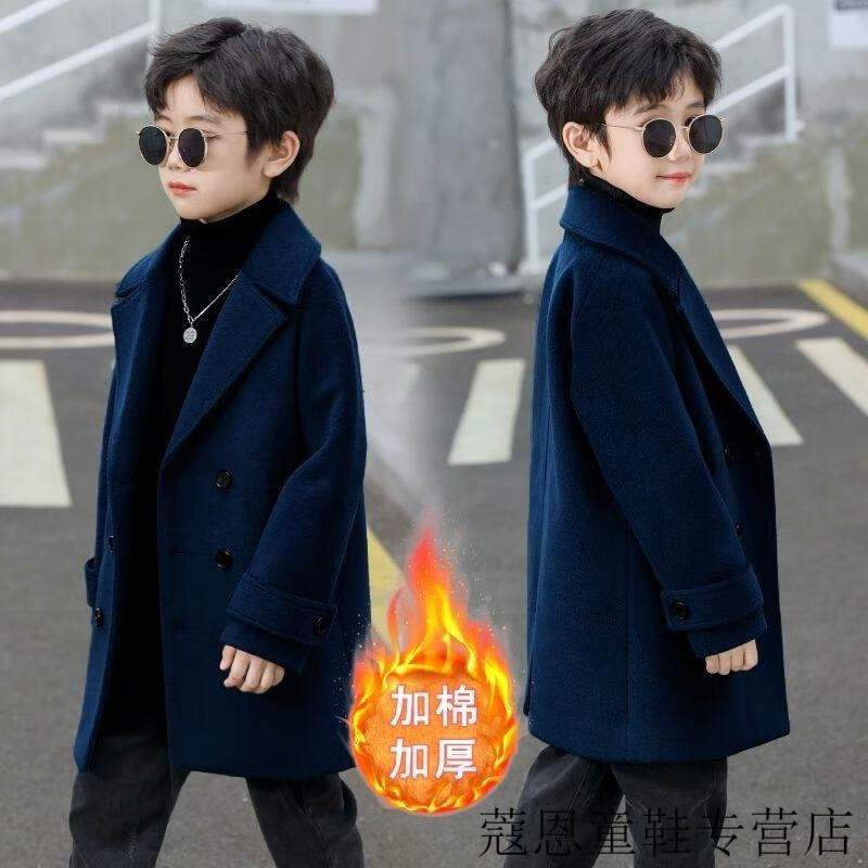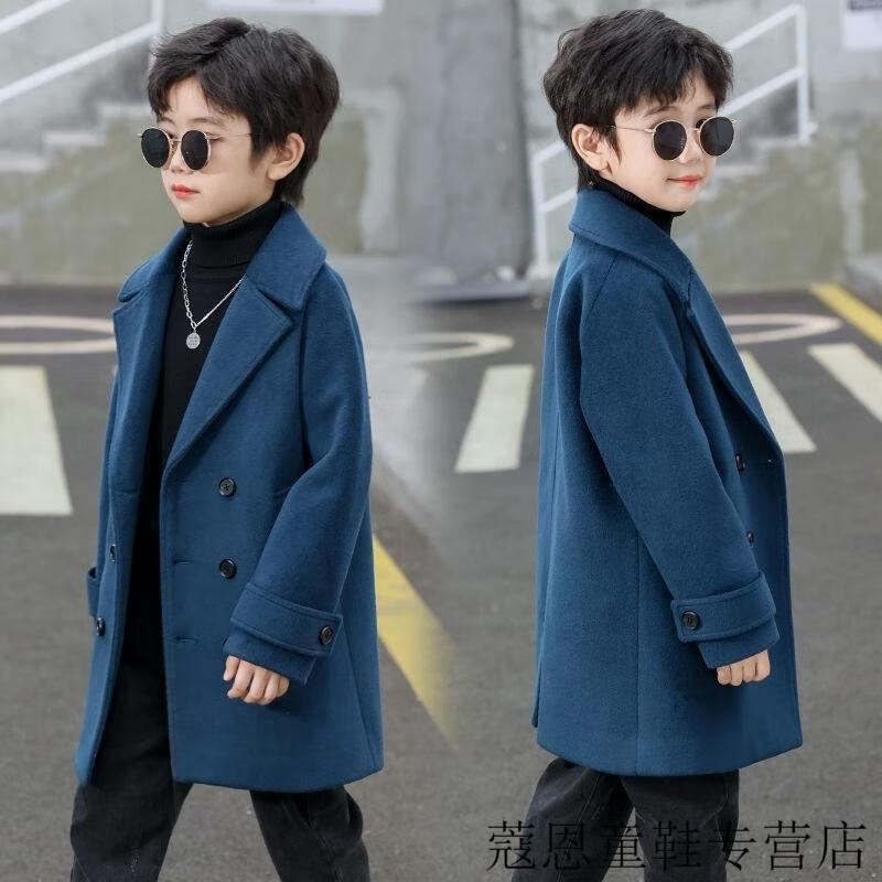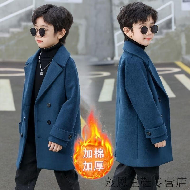 Disney (Disney) Boys Korean Version Thick Woolen Coat Children's Autumn and Winter New Double-breasted Medium-Length Woolen Windbreaker Coat Lake Green Cotton and Thickened Winter Style L-140 Recommended Height 130cm
