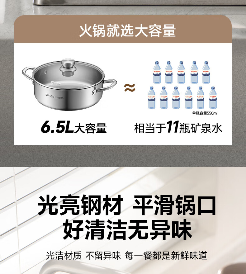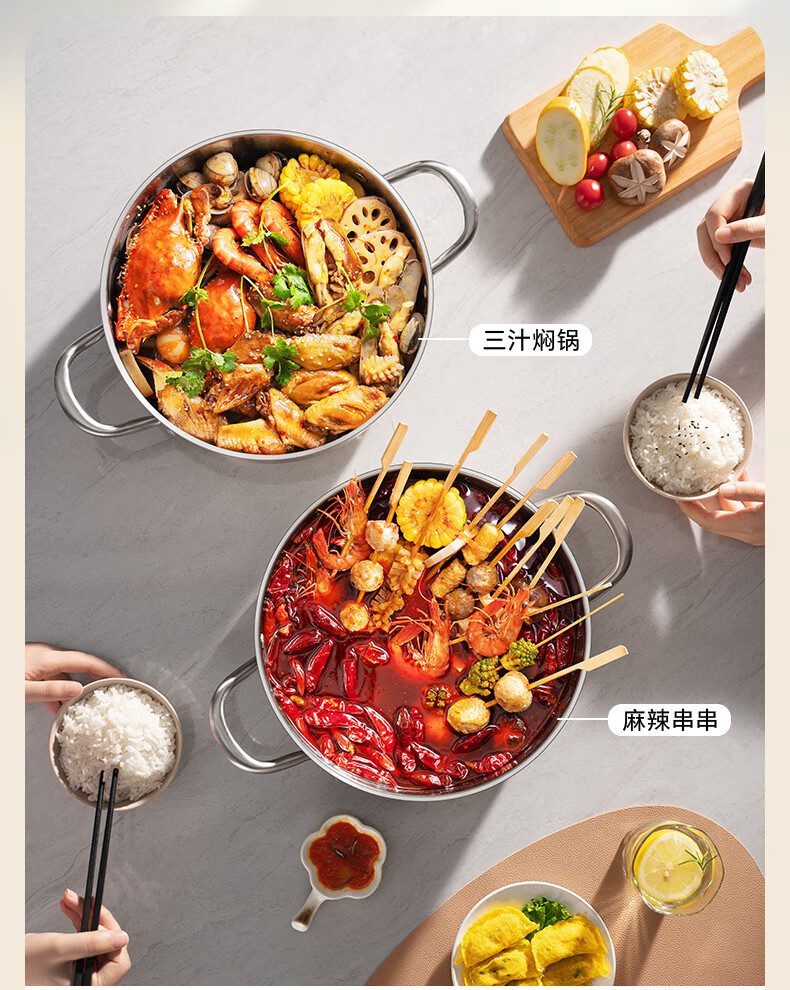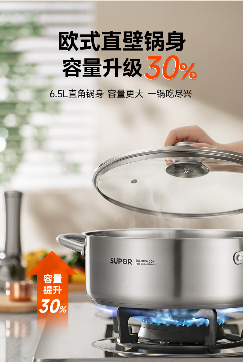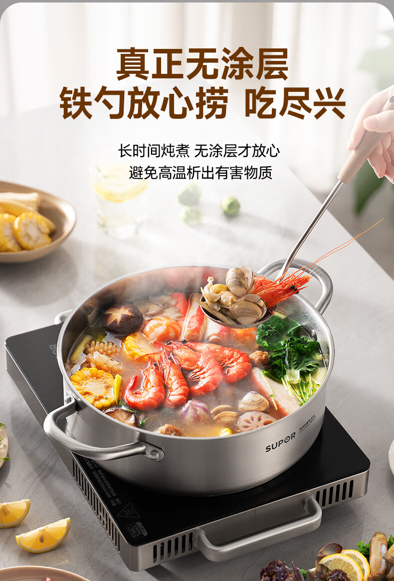 SUPOR hot pot Yuanyang hot pot 304 stainless steel household soup-shabu pot large capacity pot double bottom induction cooker gas universal Yuanyang hot pot 6.5L 30cm
