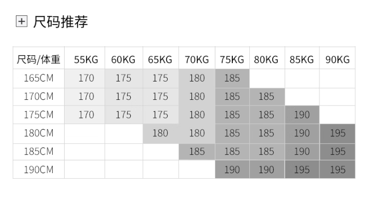 China (cm) 165 / 88-90 170 / 96-98 175 / 108-110 180 / 118-122 185 / 126-130