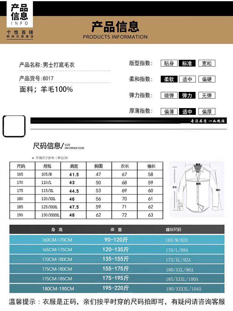 China (cm) 165 / 88-90 170 / 96-98 175 / 108-110 180 / 118-122 185 / 126-130