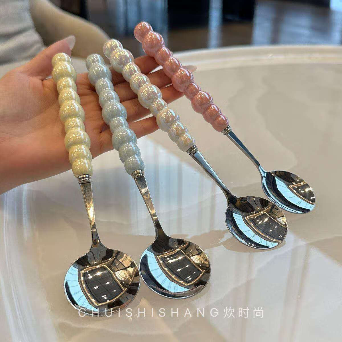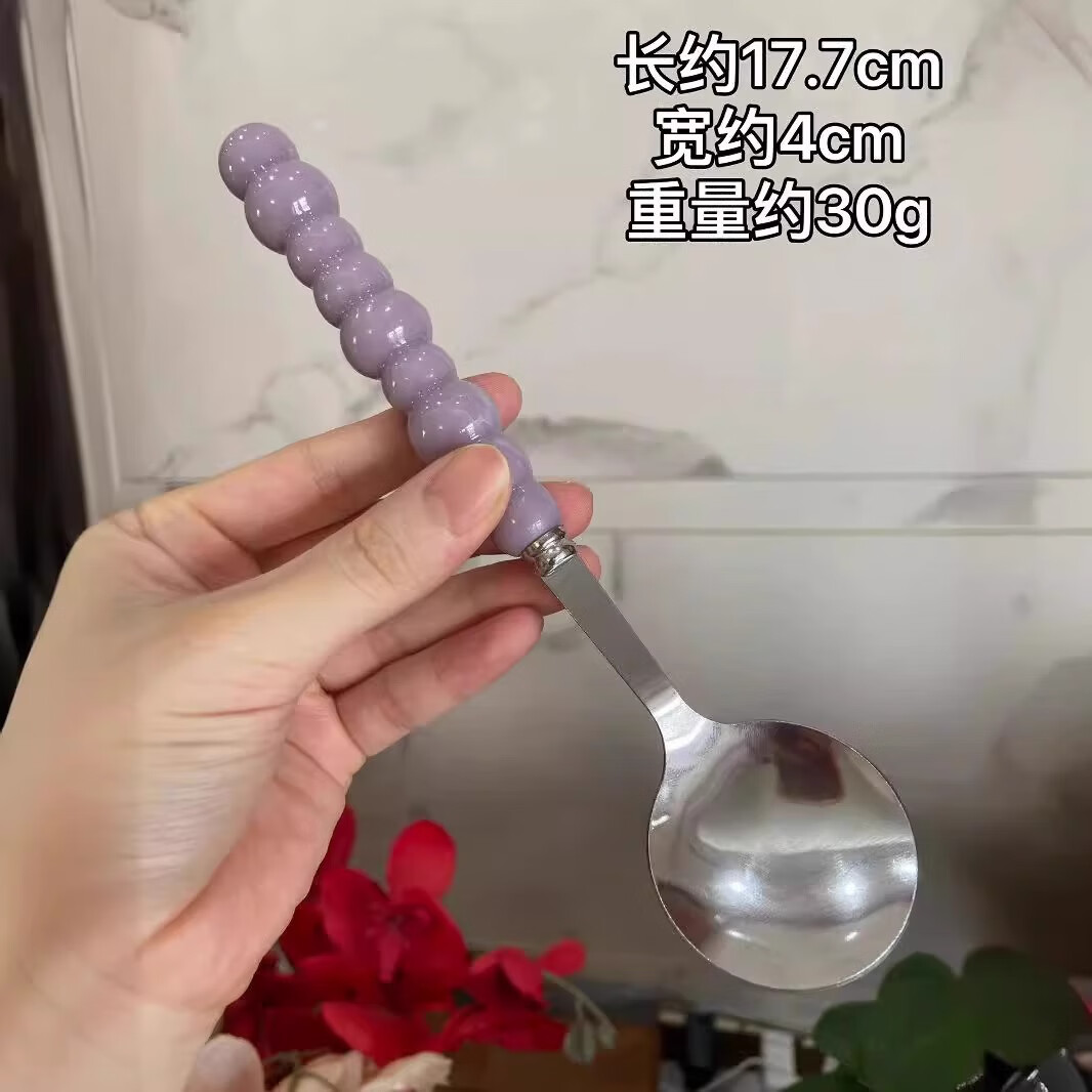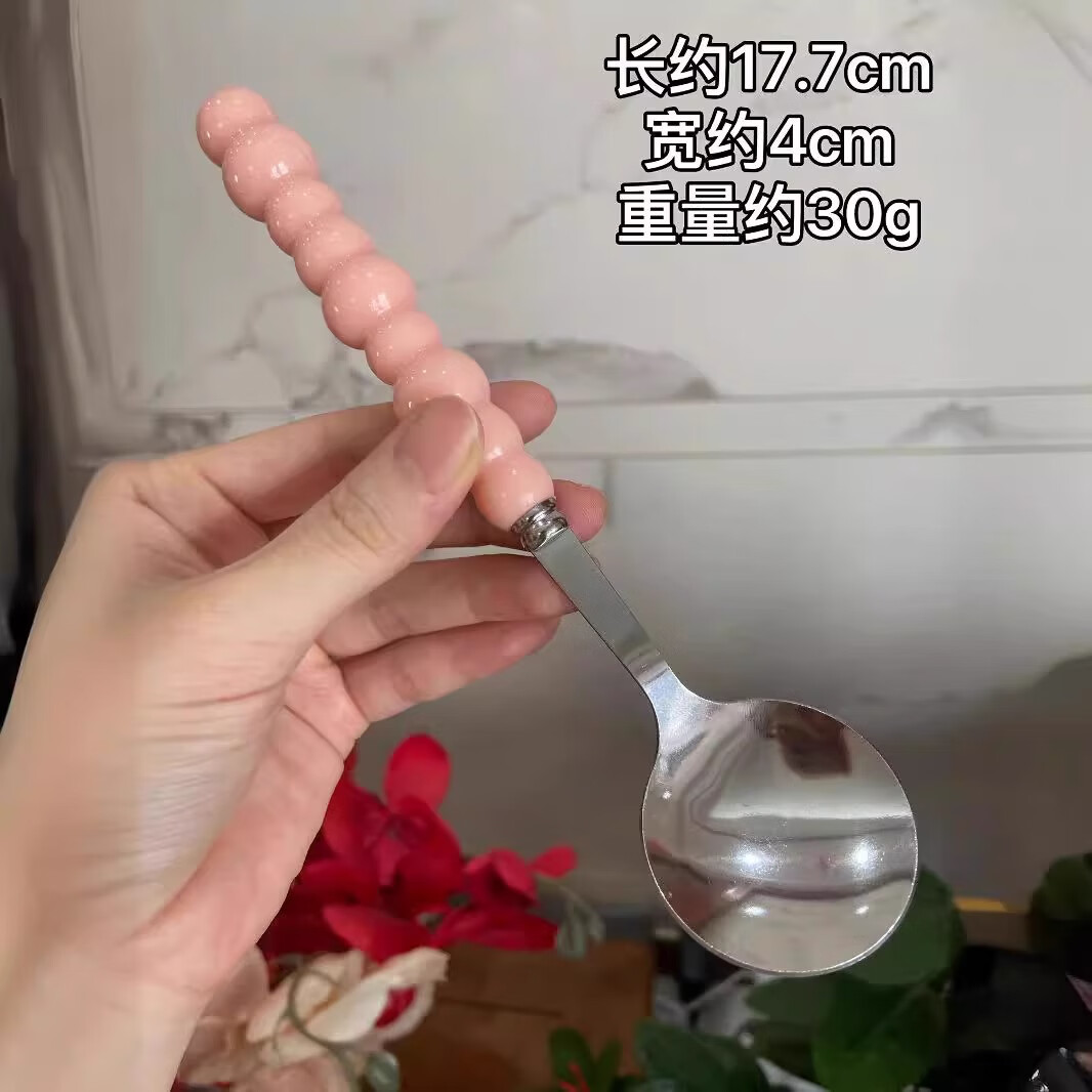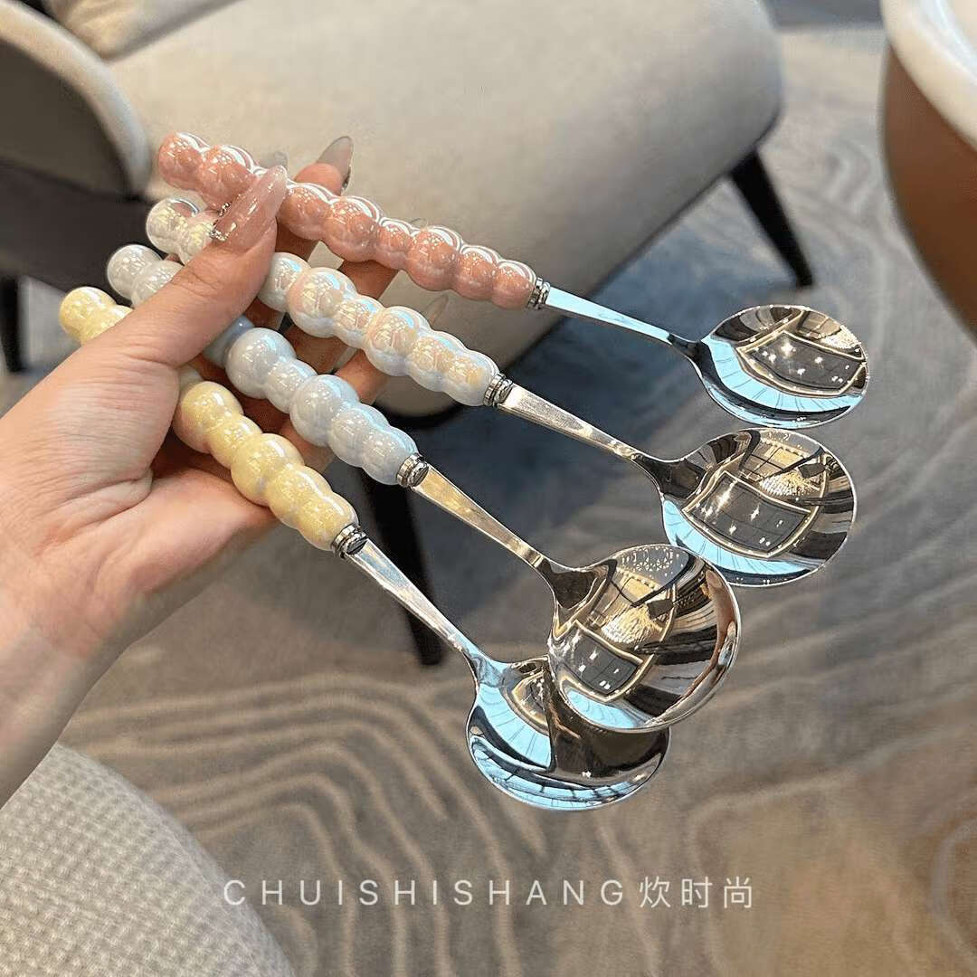 Stainless steel color pearl spoon household rice spoon household spoon small spoon plastic handle dinner spoon long handle round spoon boutique spoon white 1 piece