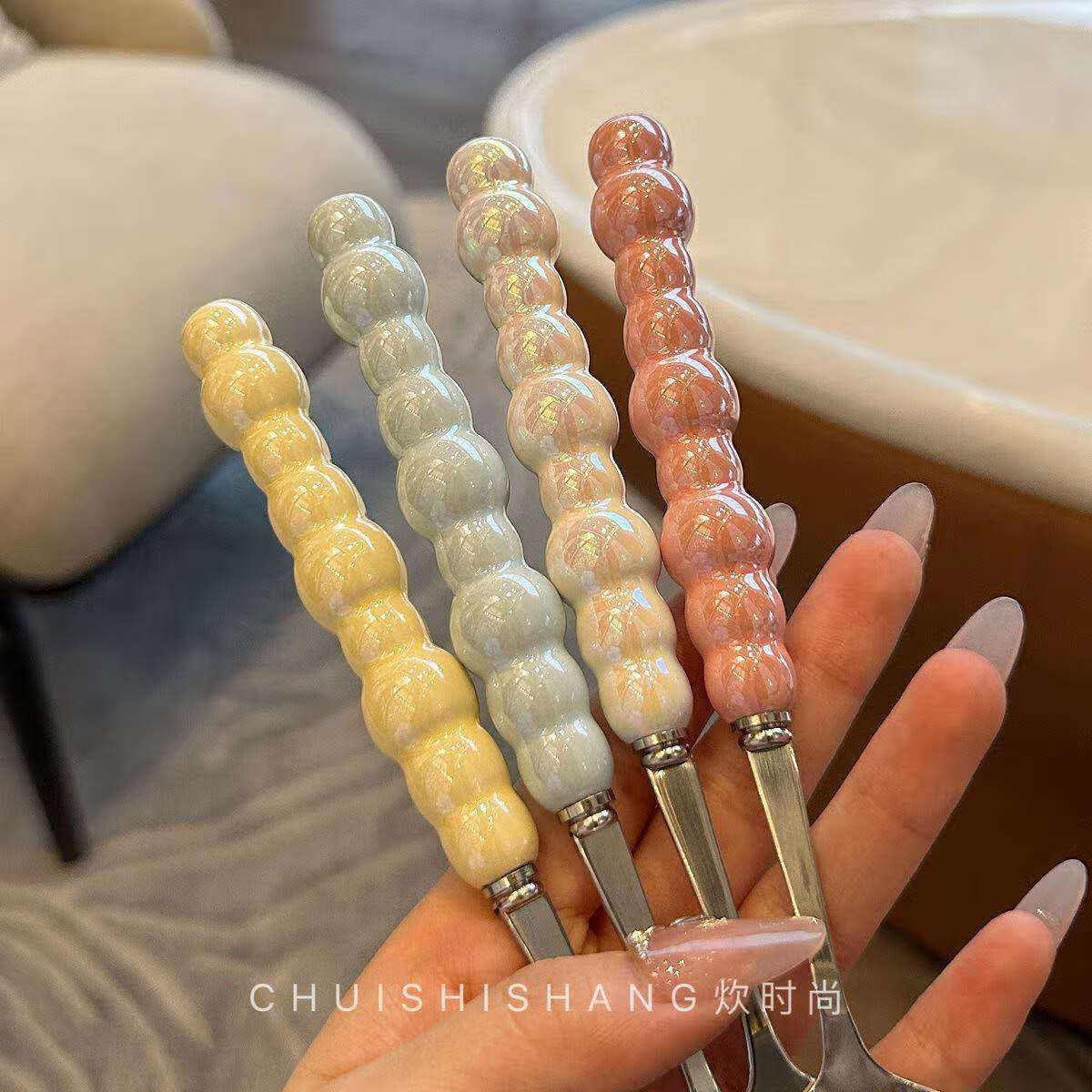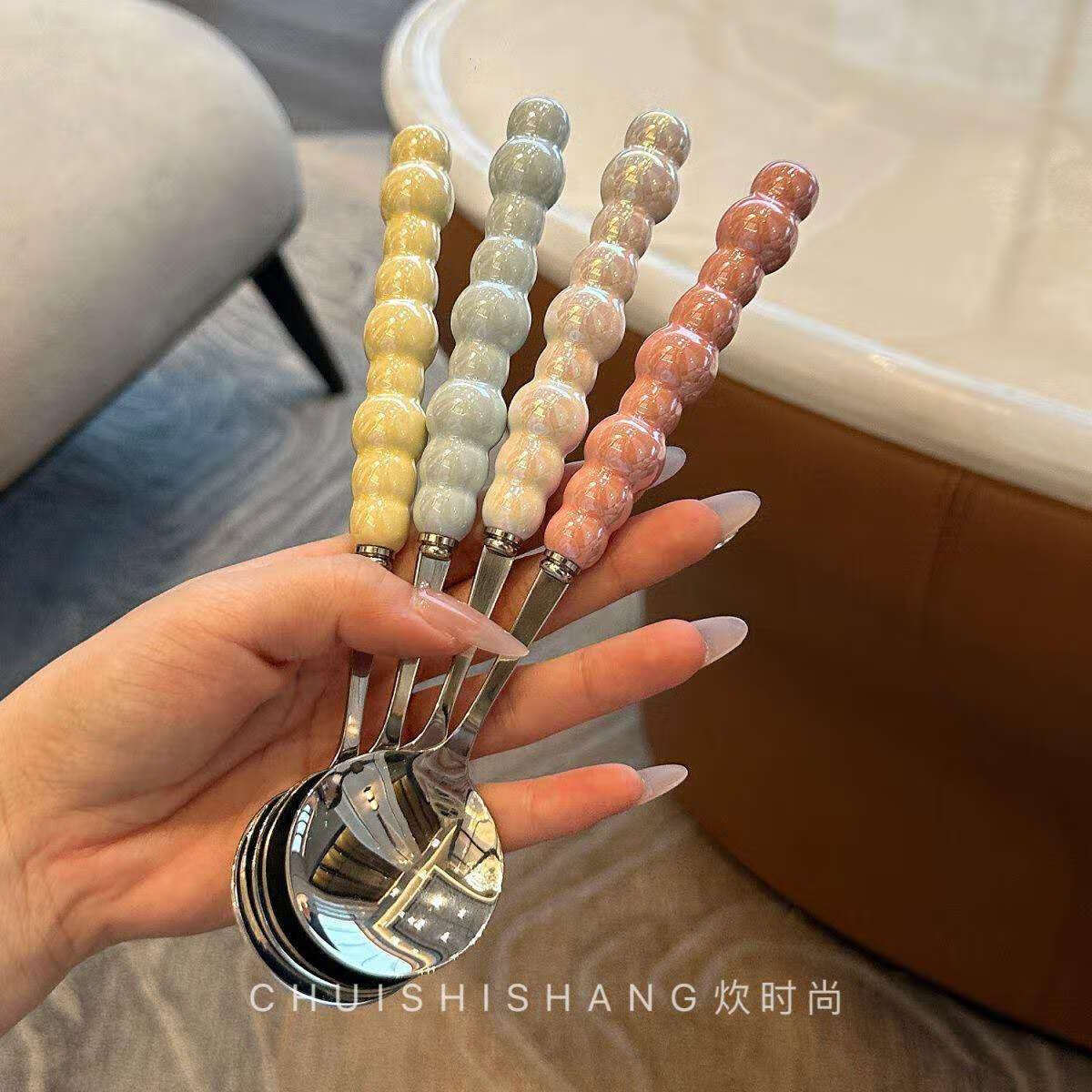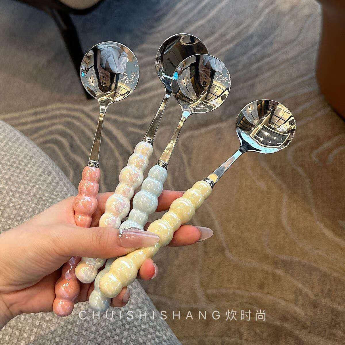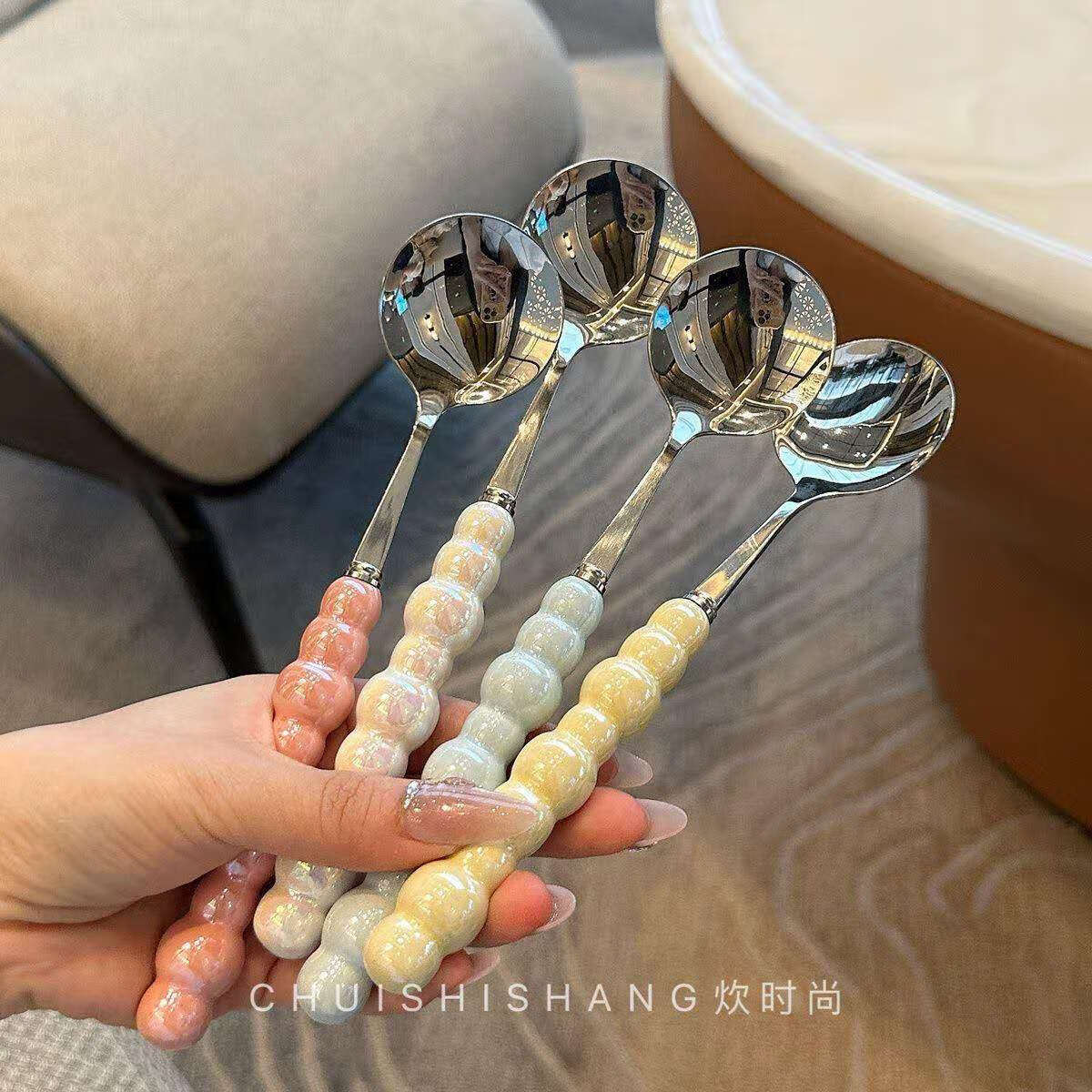 Stainless steel color pearl spoon household rice spoon household spoon small spoon plastic handle dinner spoon long handle round spoon boutique spoon white 1 piece