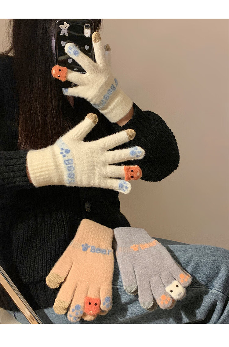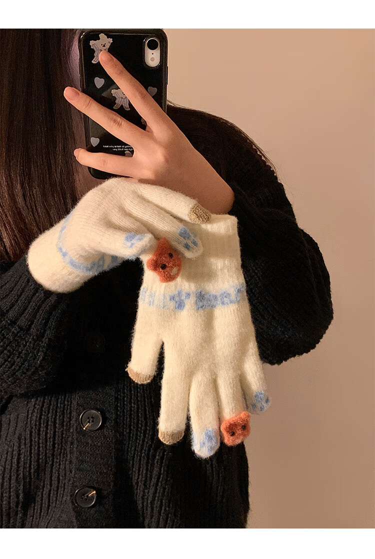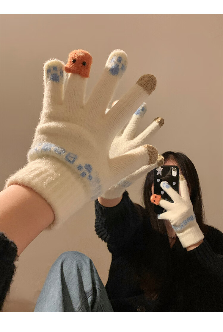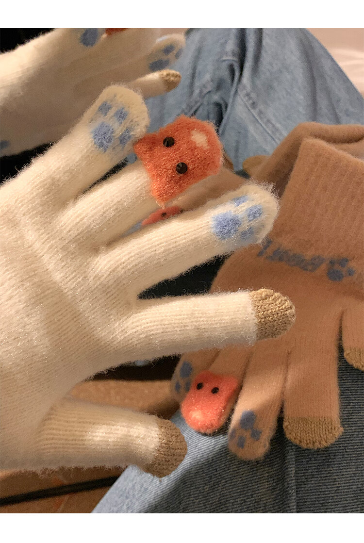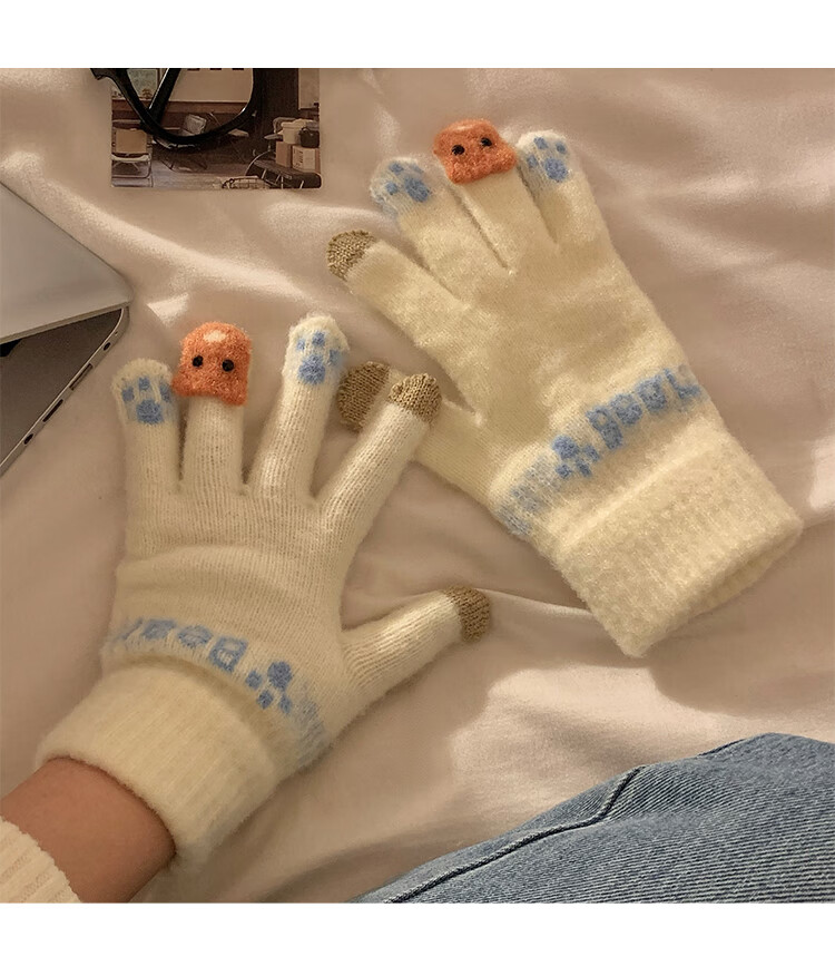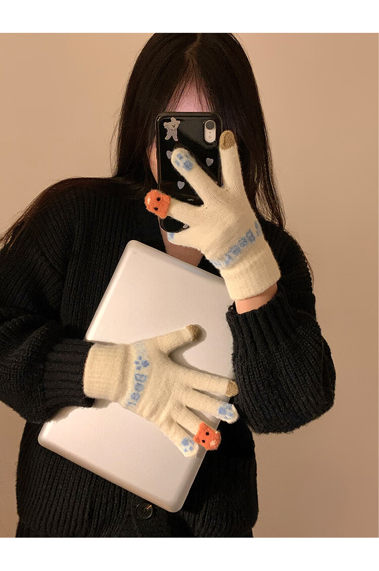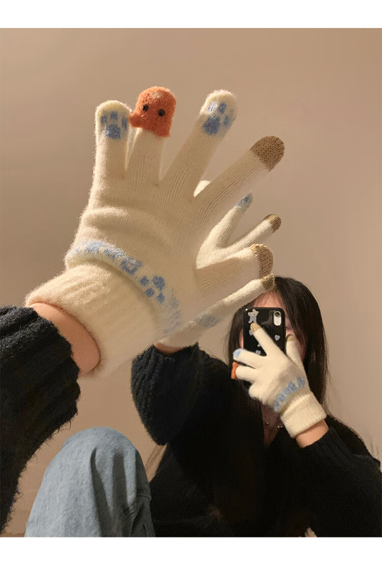 Chajin Cute Plush Knitted Five-Finger Gloves for Women, Warm and Thickened in Winter for Students with Touch Screen for Cycling, Cold and Windproof in Winter, Cute Little Fox White, Velvet and Thickened/Touch Screen