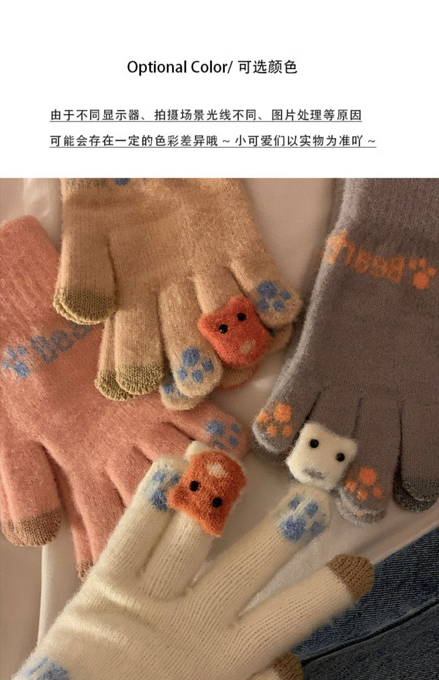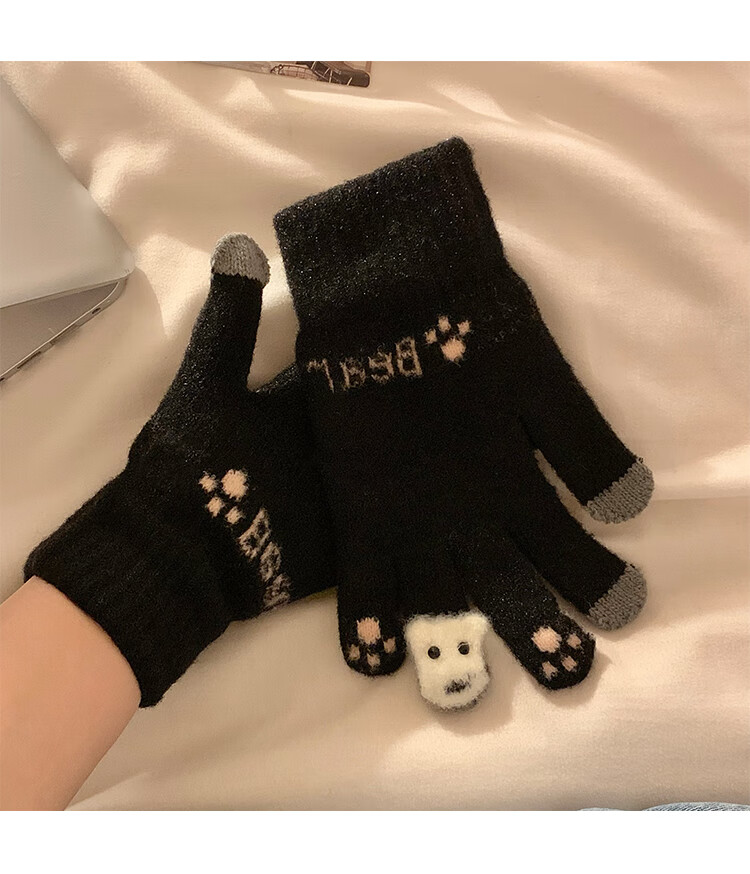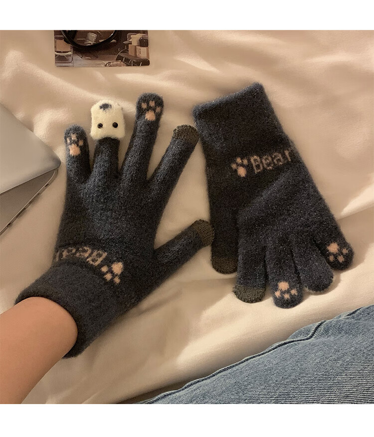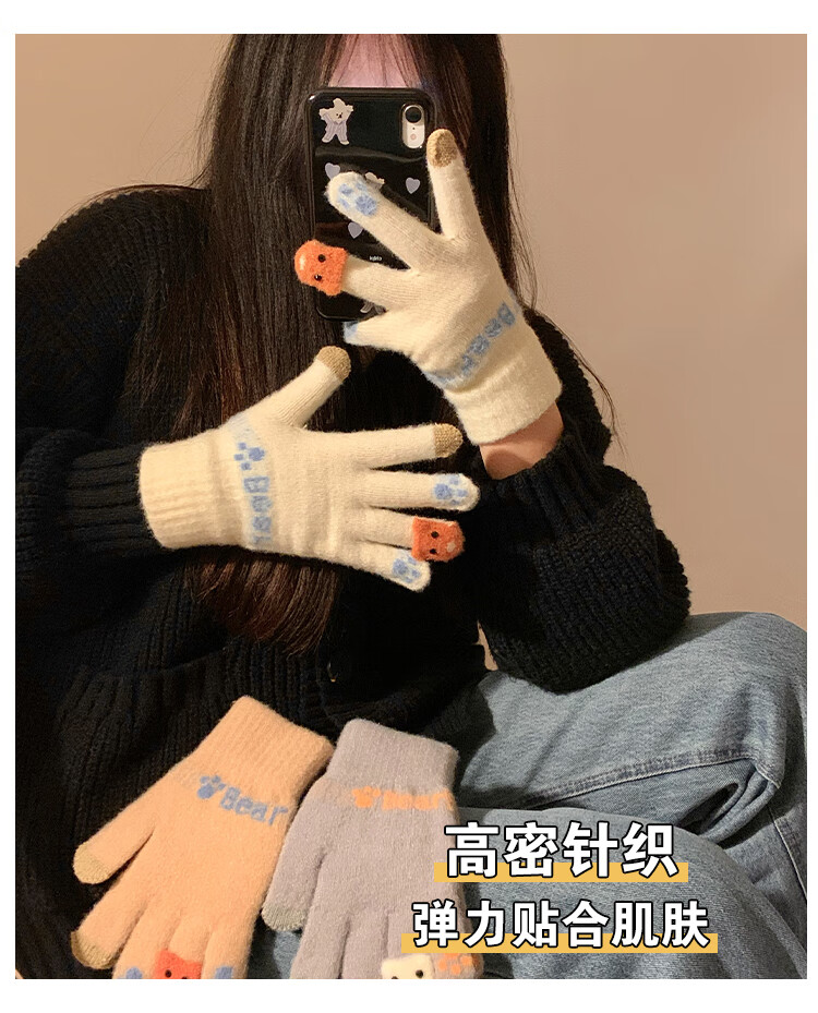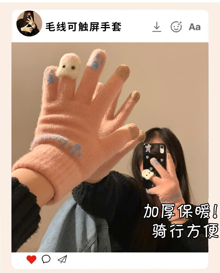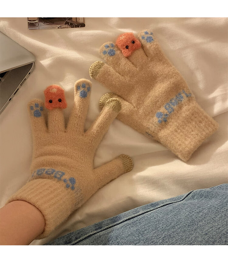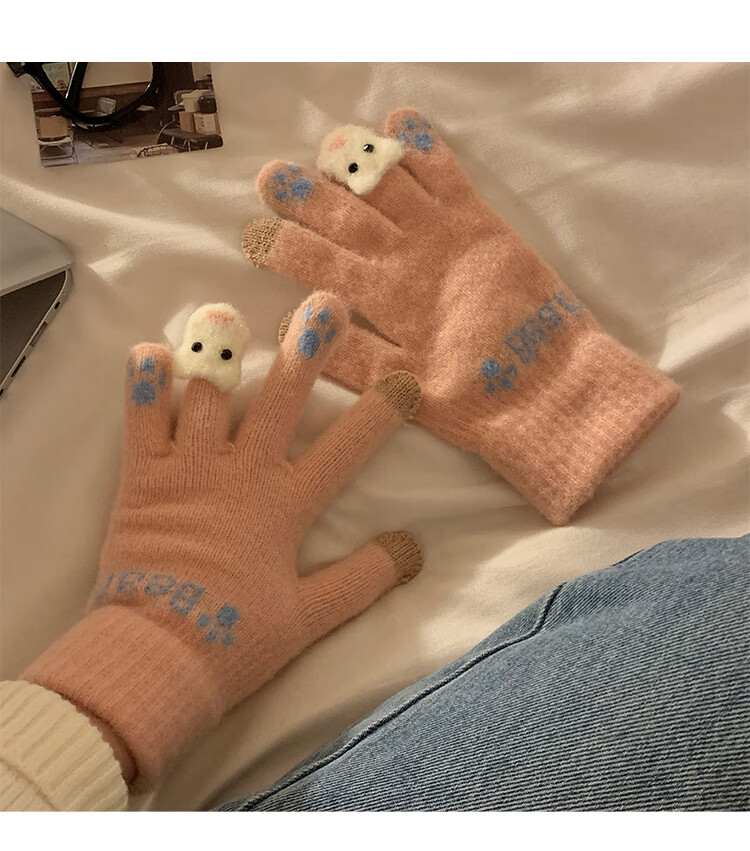 Chajin Cute Plush Knitted Five-Finger Gloves for Women, Warm and Thickened in Winter for Students with Touch Screen for Cycling, Cold and Windproof in Winter, Cute Little Fox White, Velvet and Thickened/Touch Screen