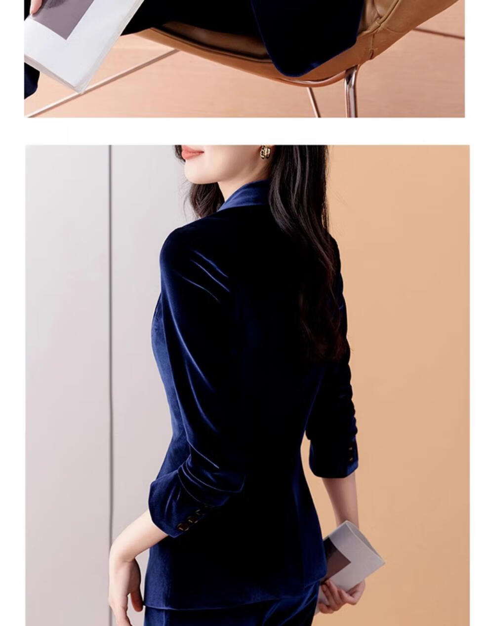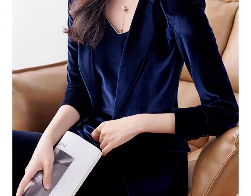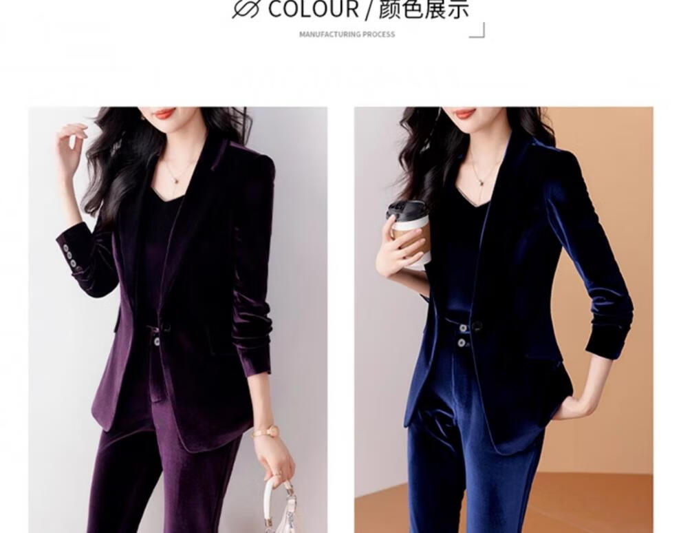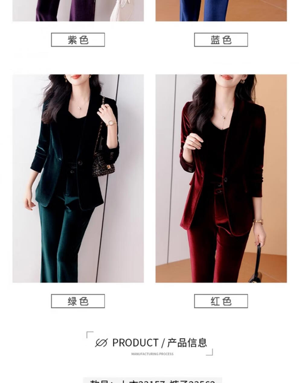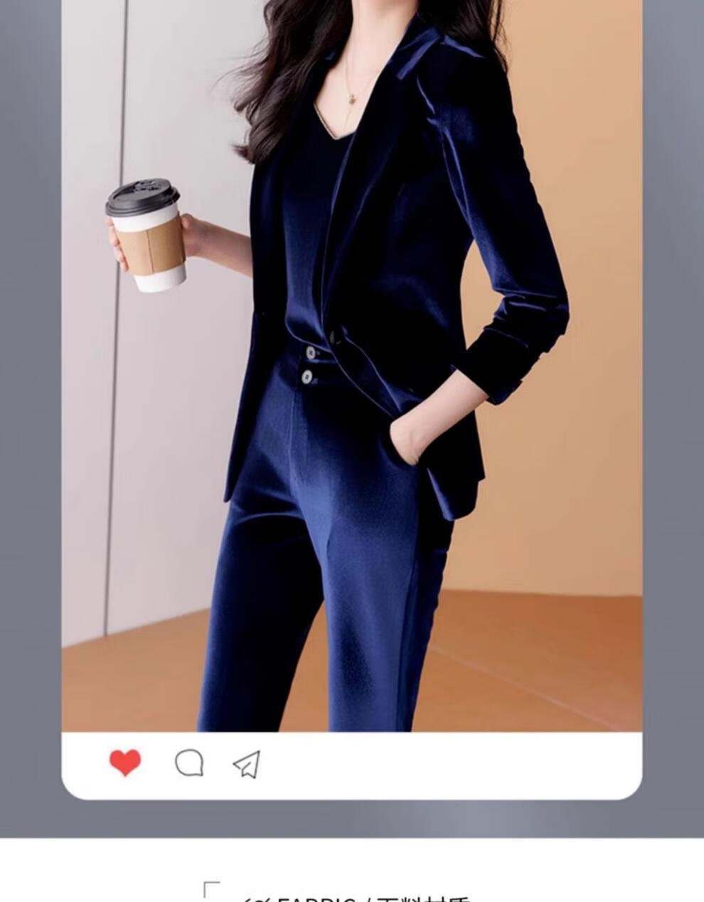 Pierre Cardin high-end gold velvet blazer new style 2025 spring and autumn temperament feminine fashion suit bell-bottom suit blue suit + blue suspenders + pants S