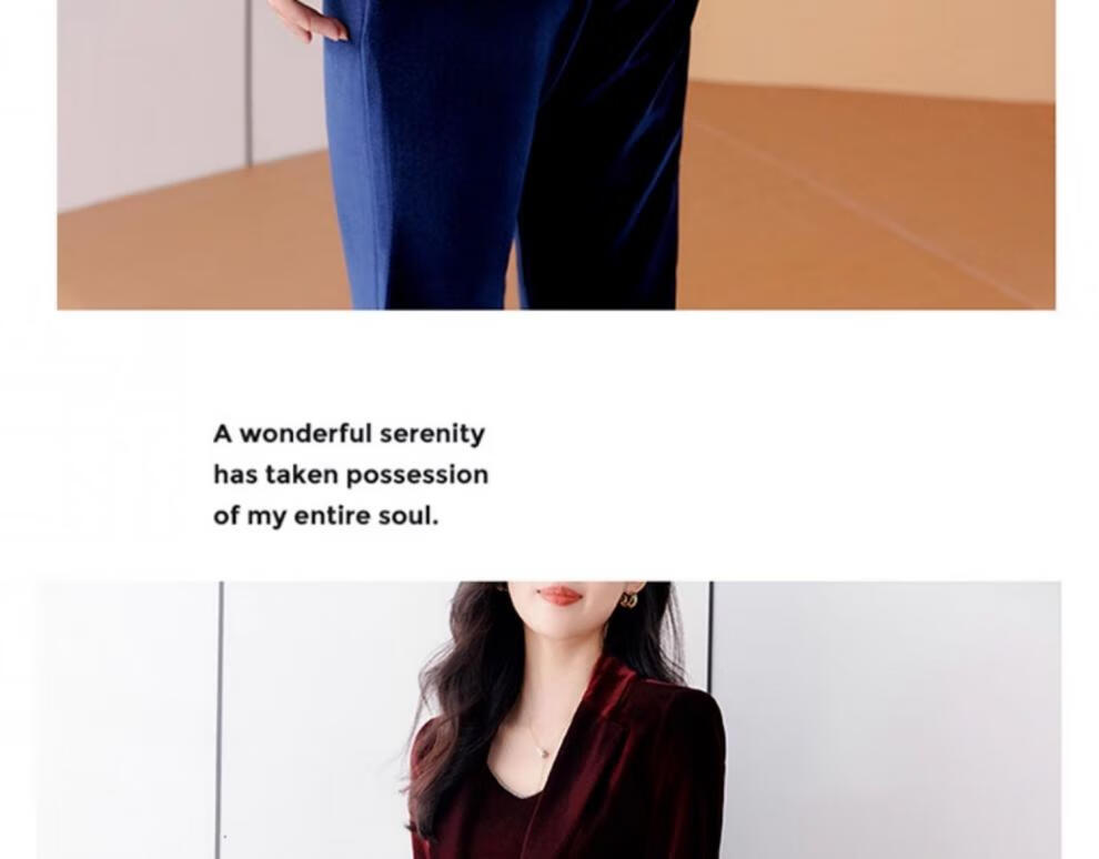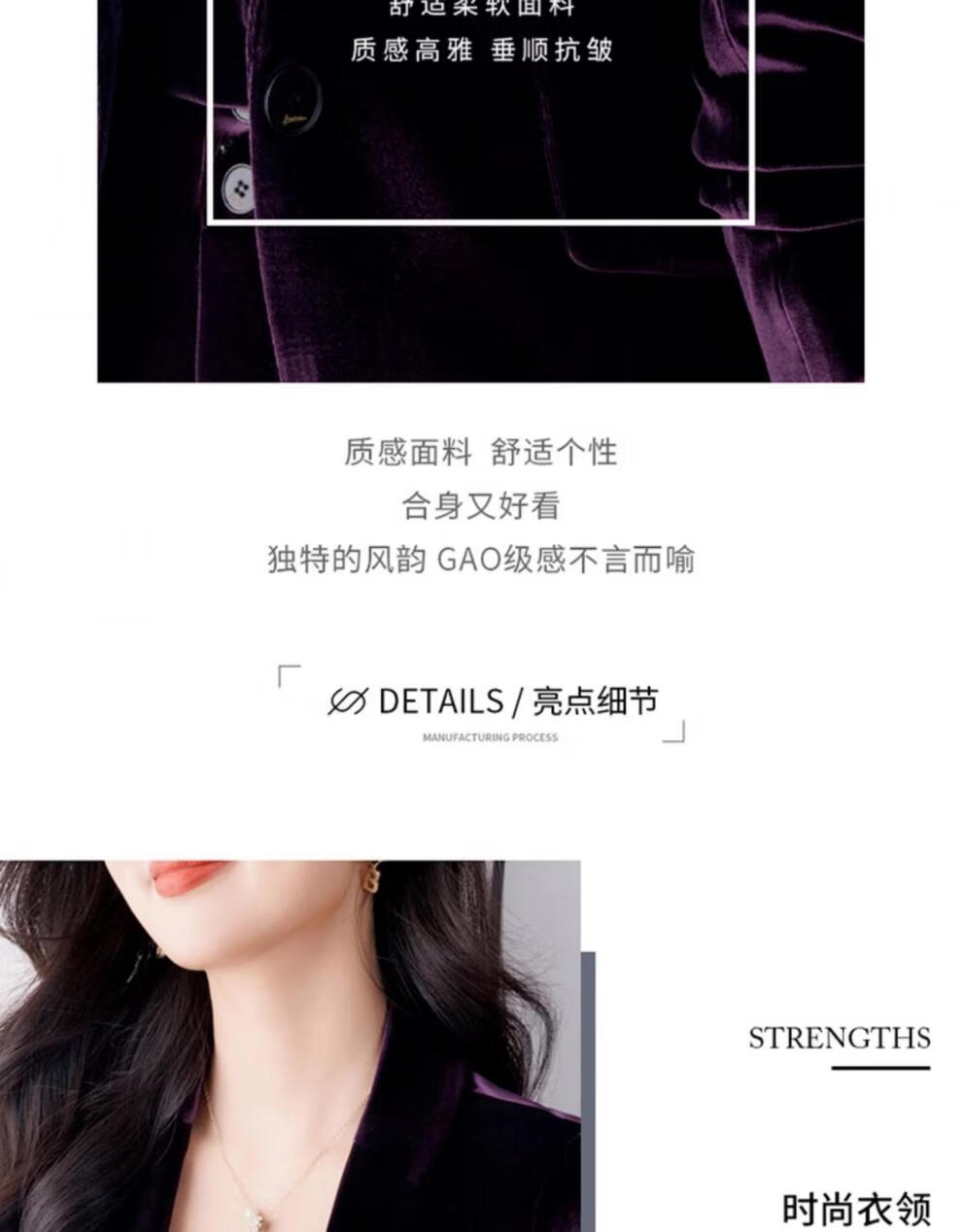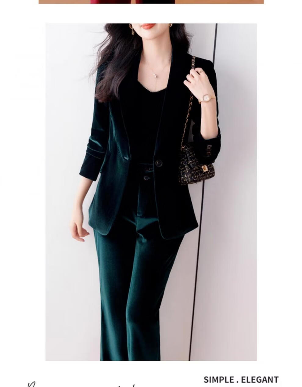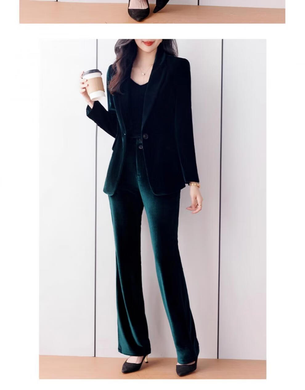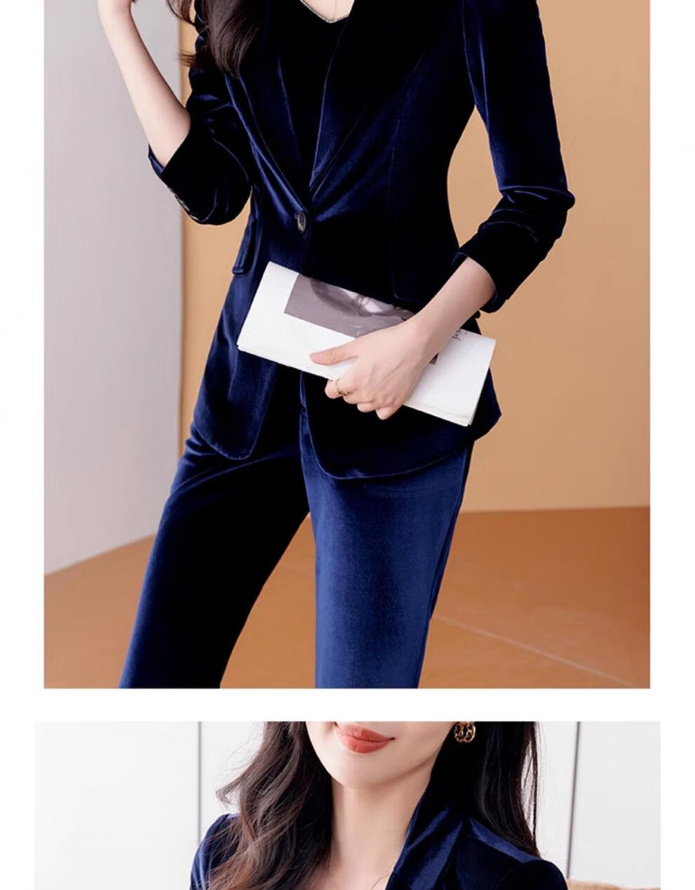 Pierre Cardin high-end gold velvet blazer new style 2025 spring and autumn temperament feminine fashion suit bell-bottom suit blue suit + blue suspenders + pants S