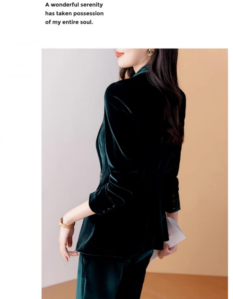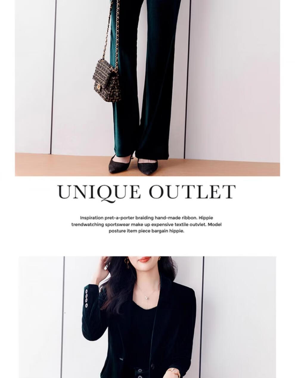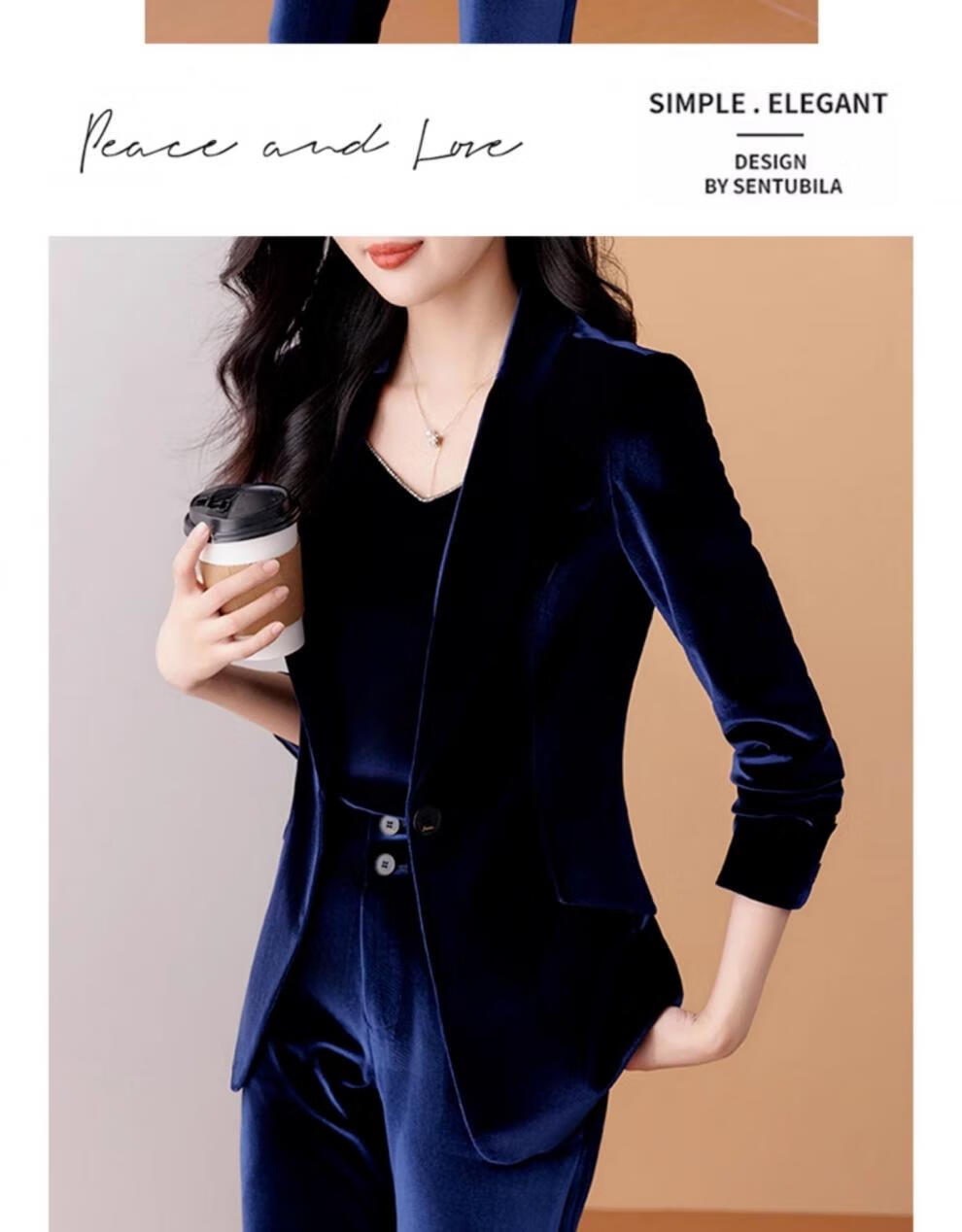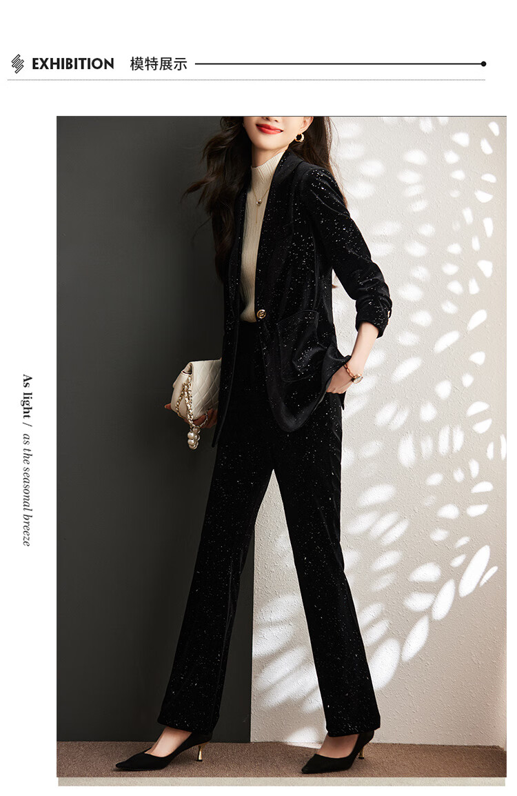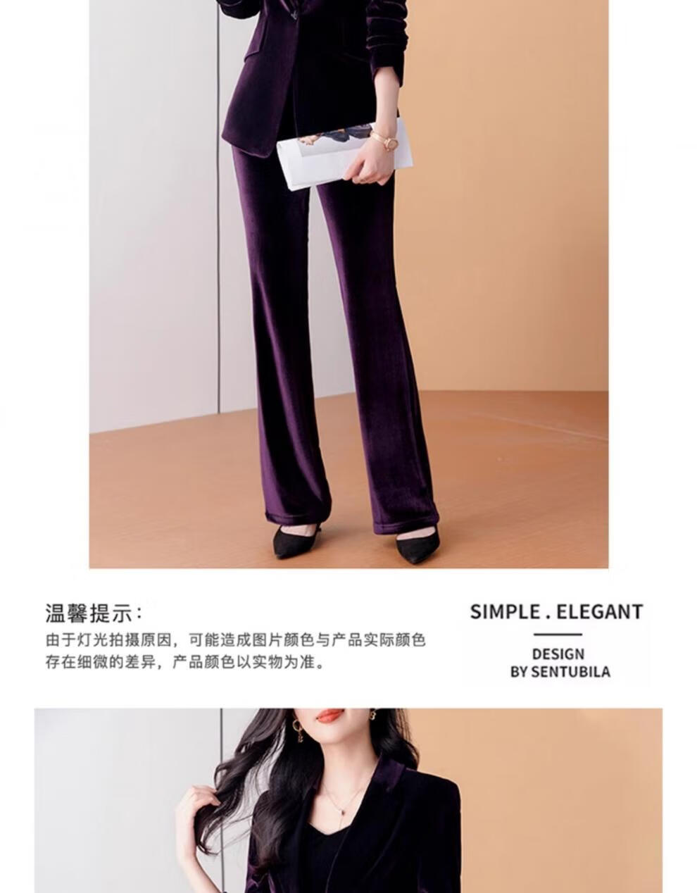 Pierre Cardin high-end gold velvet blazer new style 2025 spring and autumn temperament feminine fashion suit bell-bottom suit blue suit + blue suspenders + pants S