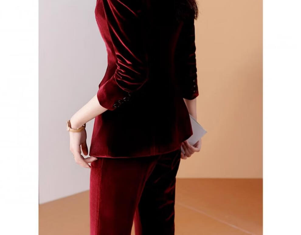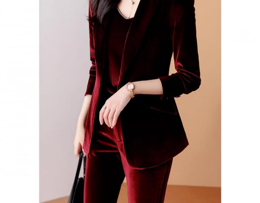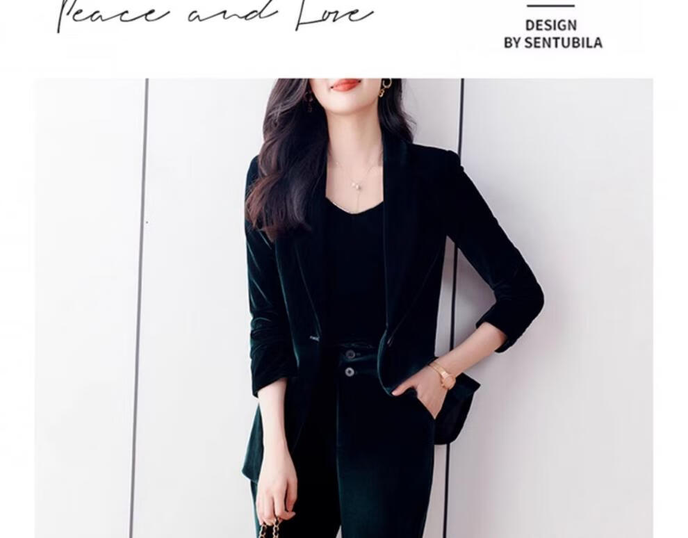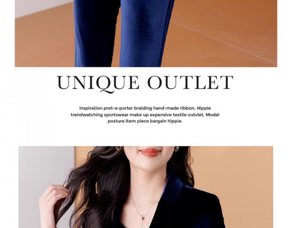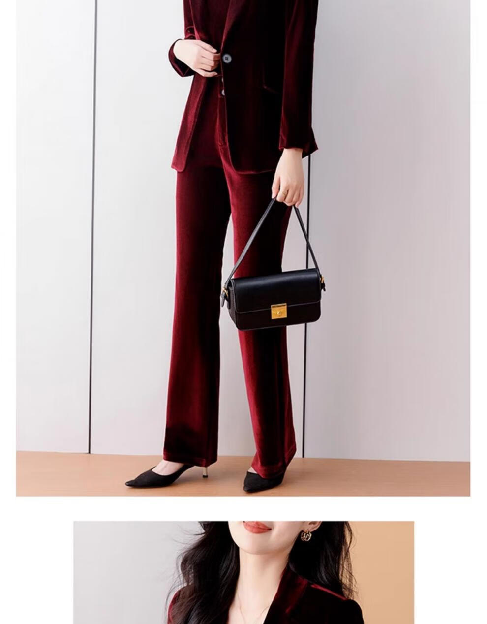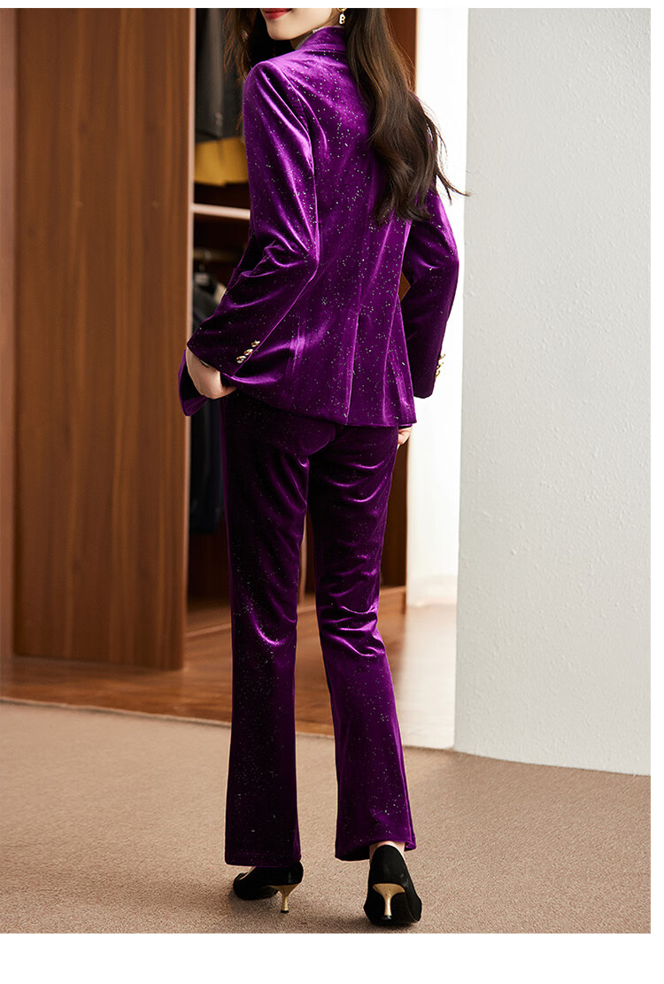 Pierre Cardin high-end gold velvet blazer new style 2025 spring and autumn temperament feminine fashion suit bell-bottom suit blue suit + blue suspenders + pants S