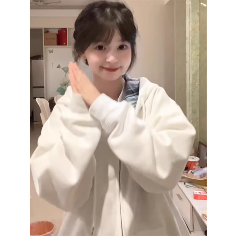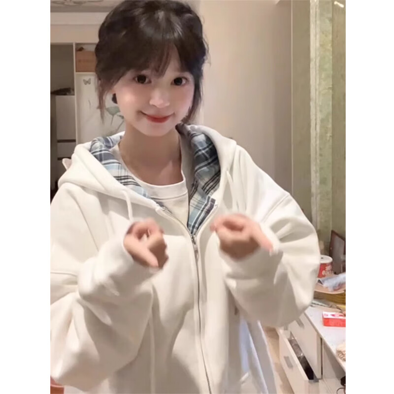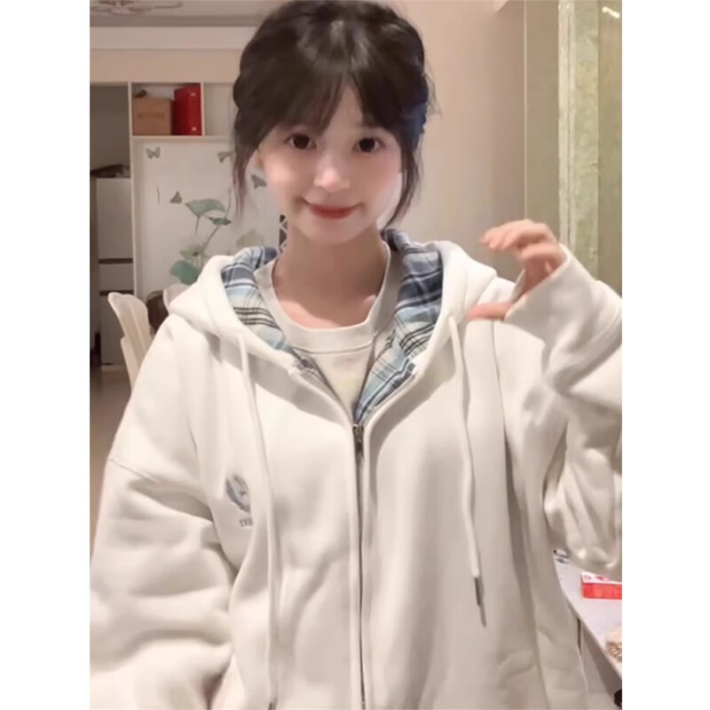 LDBE American plaid hooded cardigan sweatshirt women's new loose and velvet thickened autumn and winter zipper jacket trendy white autumn and winter velvet M