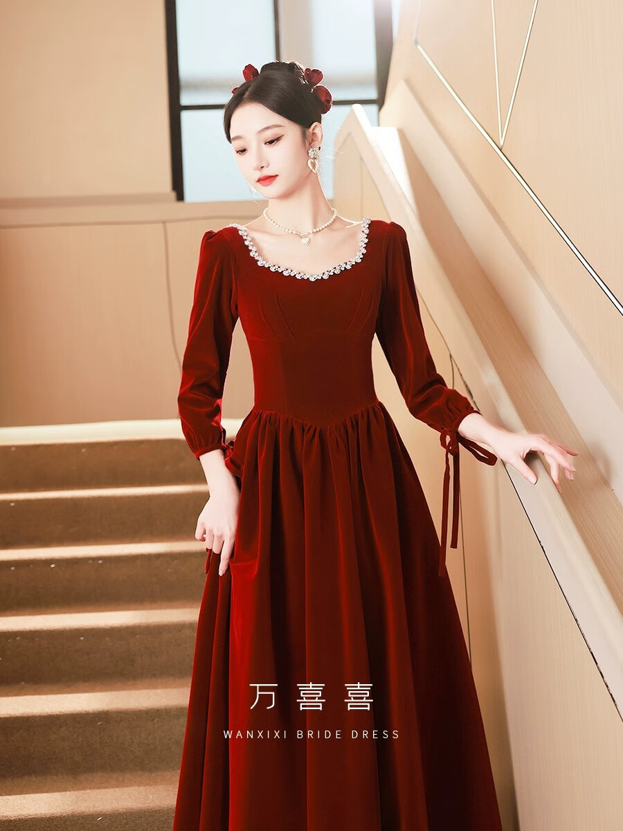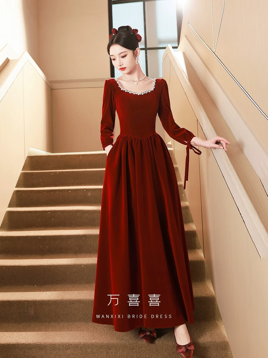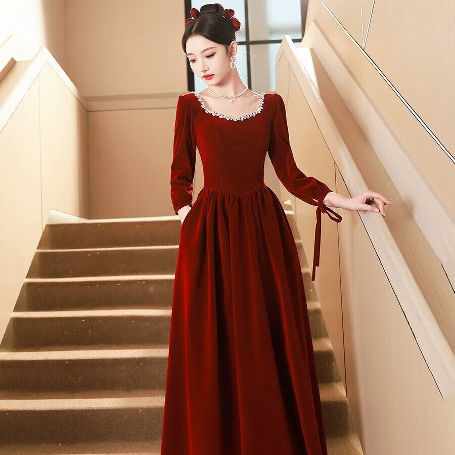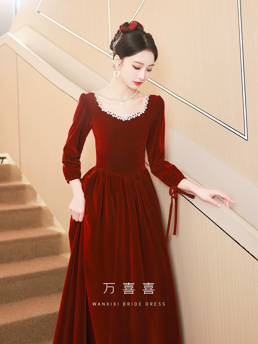 Li Baixin's fugitive princess toast dress autumn and winter velvet long-sleeved engagement dress Hepburn style bride wedding homecoming dress for women burgundy S