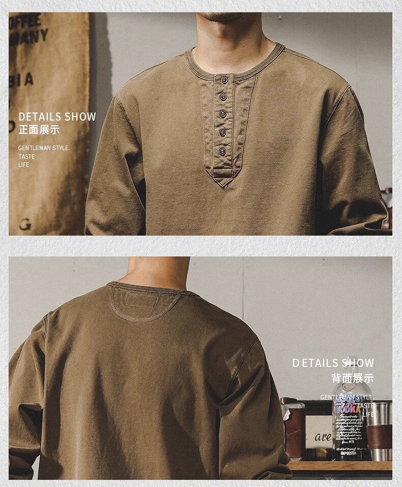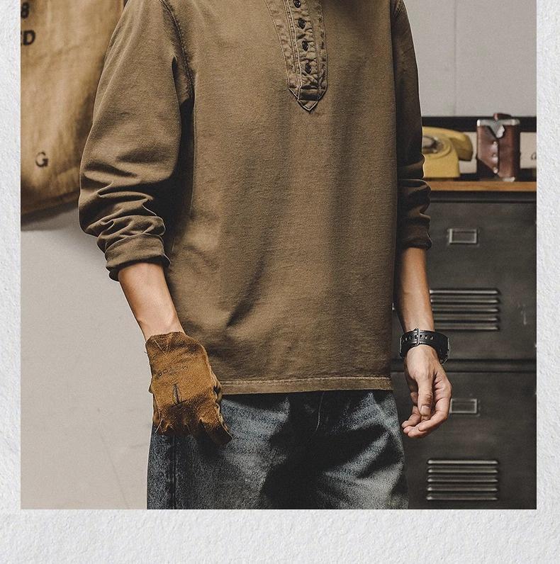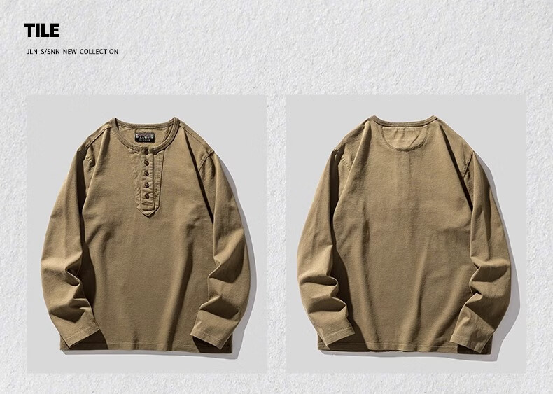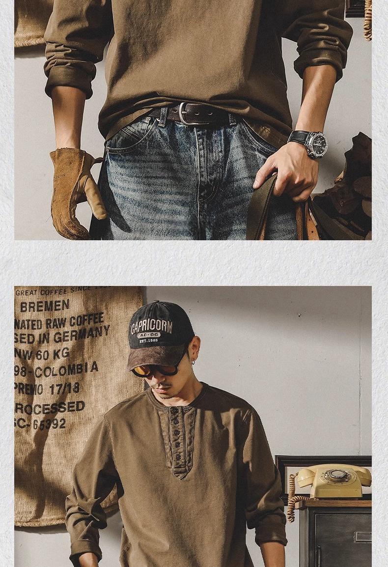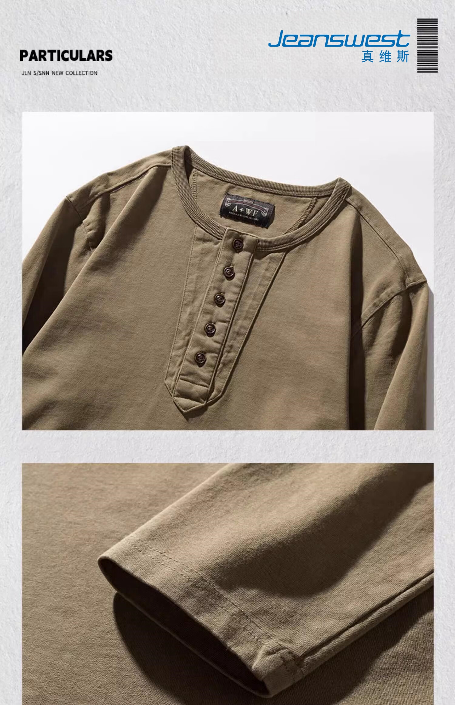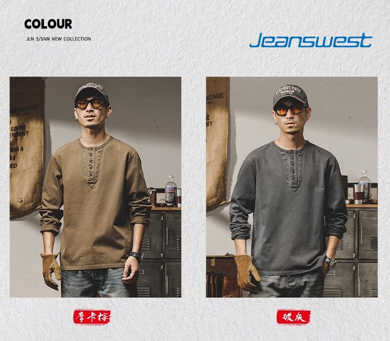 Jeanswest American retro long-sleeved T-shirt for men in spring and autumn 330g heavyweight loose trendy brand tough guy Henry collar bottoming shirt winter 15 mocha brown 2XL suitable for 160-180Jin Jin equals 0.5 kg