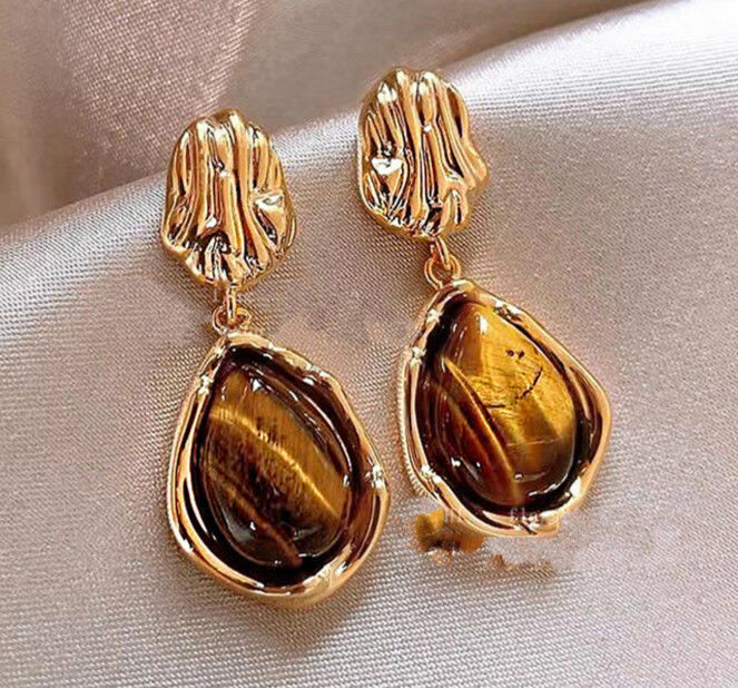 Menbin Amber Earrings 2024 New Summer Earrings Earrings Tiger Eye Stone Retro Earrings Female Niche 7 Quiet 3-piece Set
