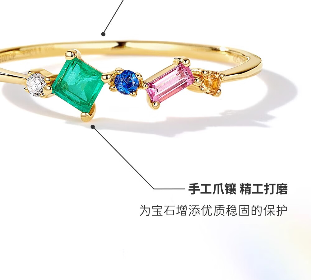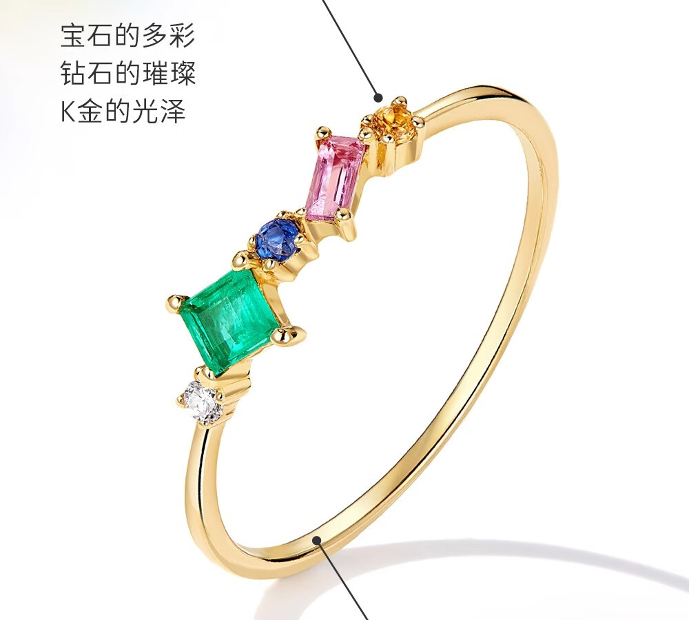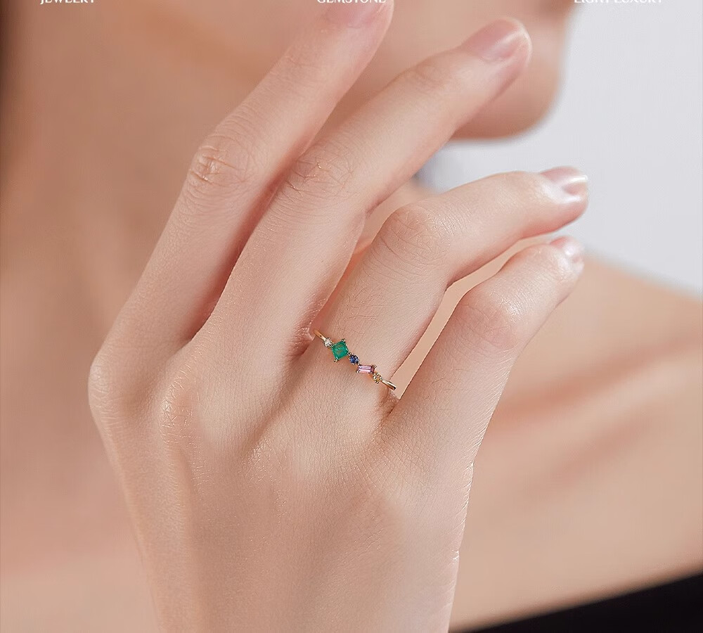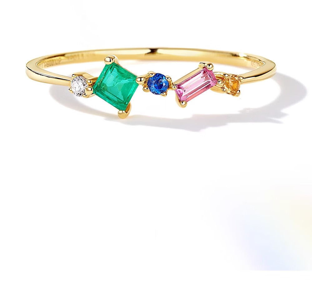 COASZE emerald 18K gold row ring, pink tourmaline inlaid with colorful treasures, thin ring, Valentine's Day birthday gift for girlfriend and wife, 18K gold emerald ring