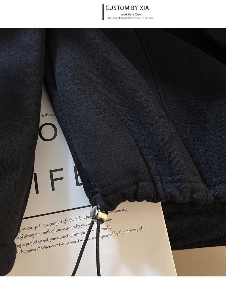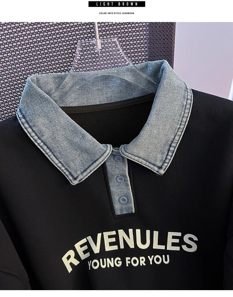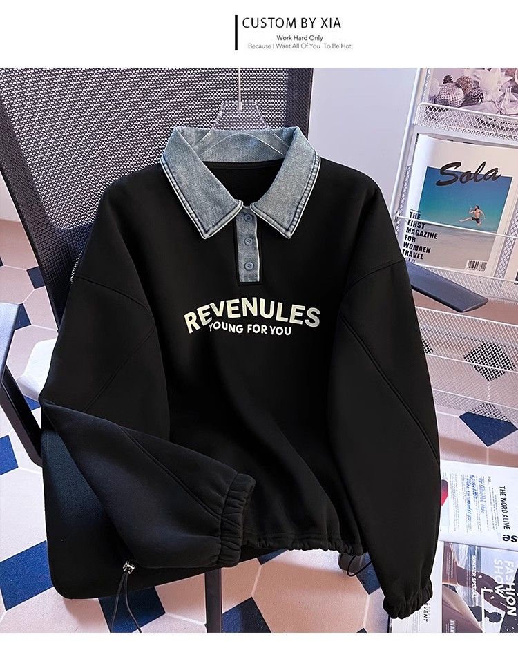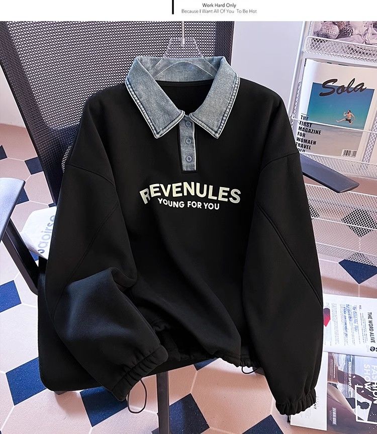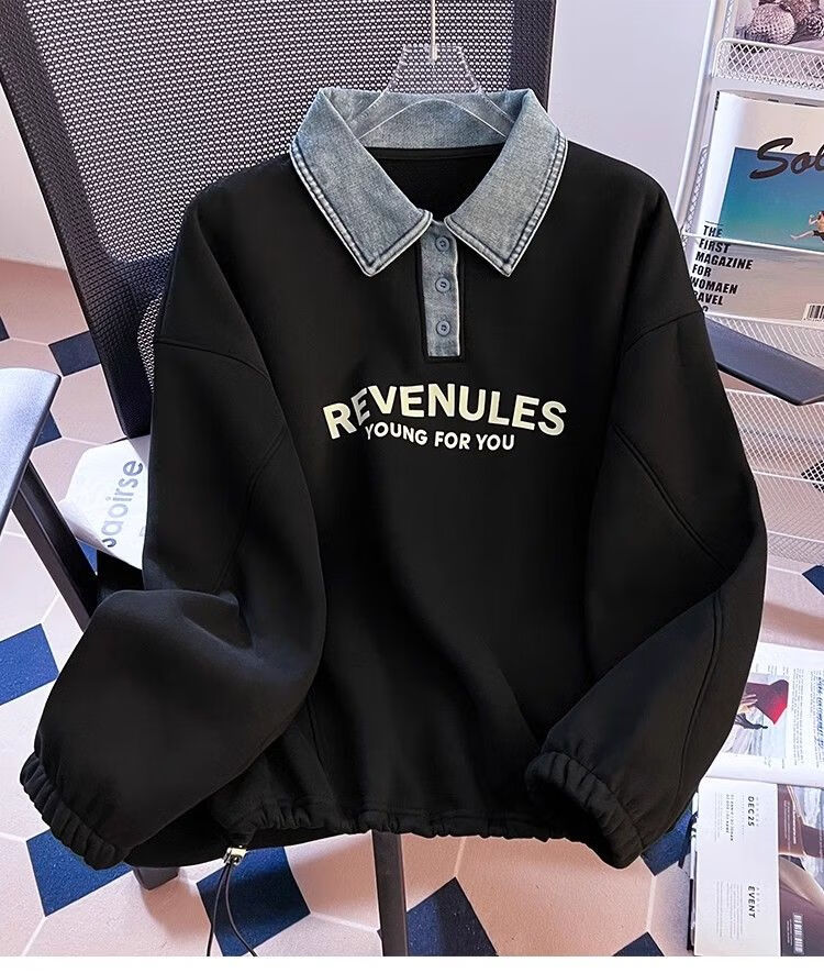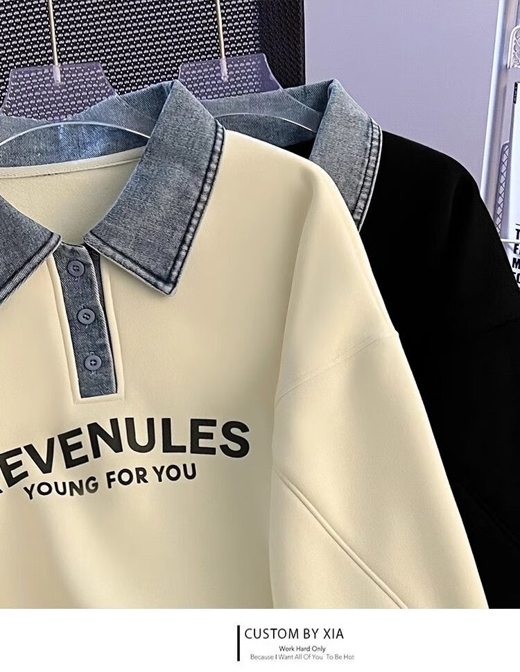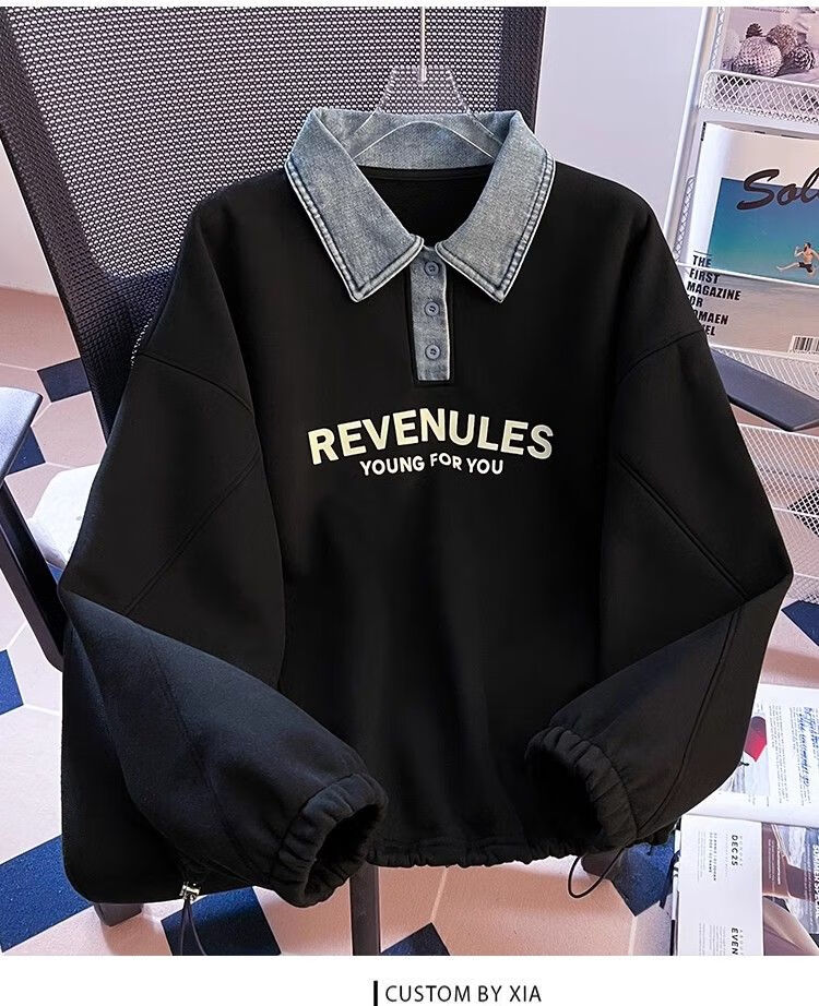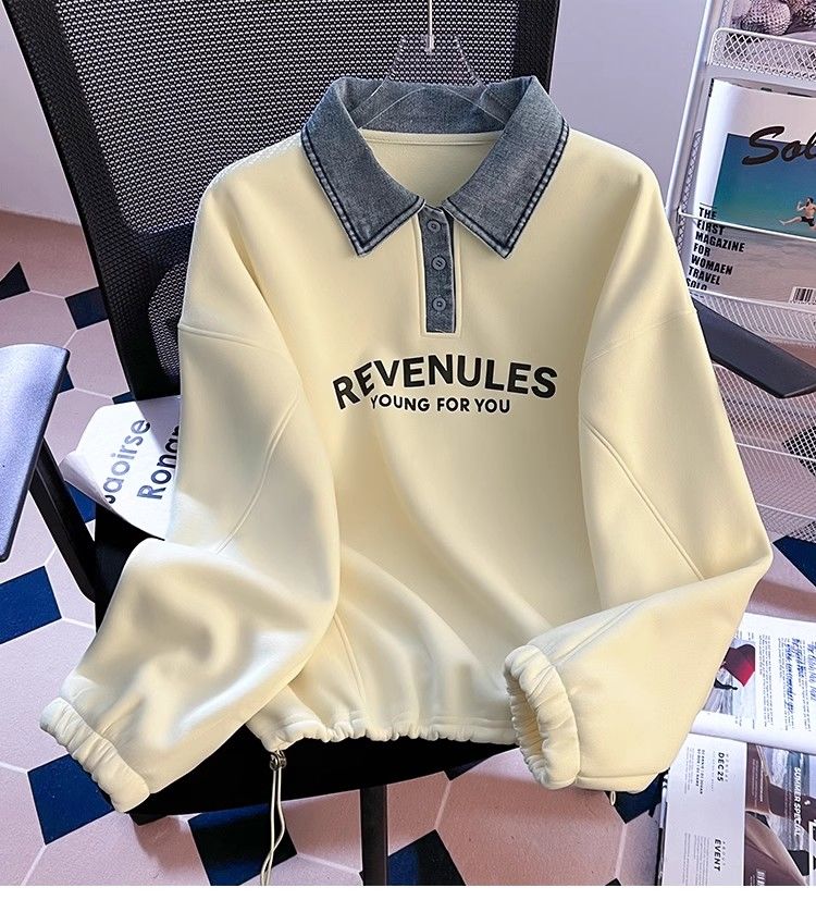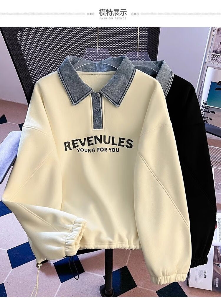 Yilizi denim polo collar sweatshirt for women autumn and winter plus velvet and thickened 2025 new oversize loose lazy hooded top apricot high-end sense L recommended 105-120 Jin Jin equals 0.5 kg