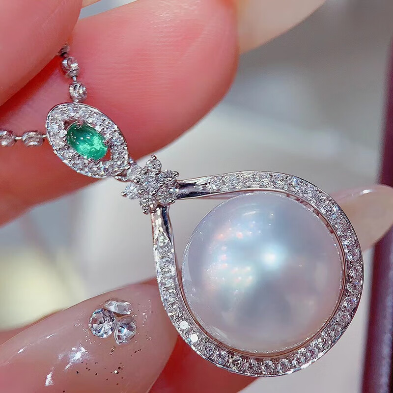 Tiansiao white pearl pendant necklace 18K gold diamond emerald fashionable temperament clavicle chain for birthday gift 13mm