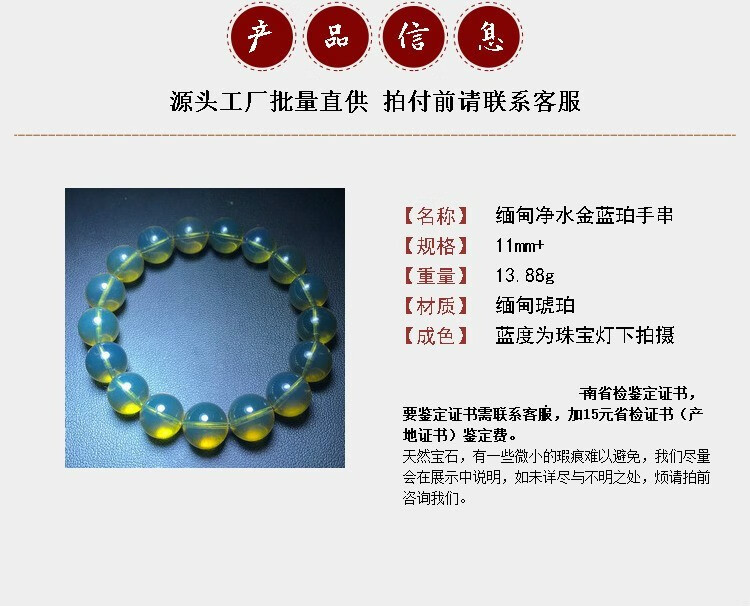 Yuan clan top concubine Burmese amber purified water blue amber bracelet 11mm single circle gold blue men and women sky blue small hand picture color