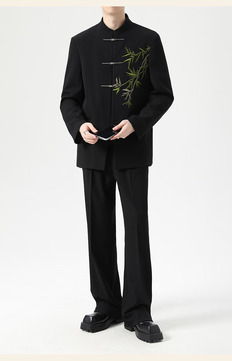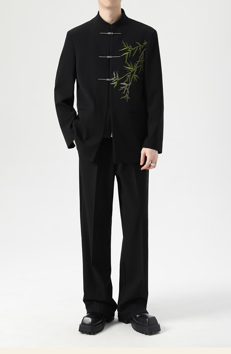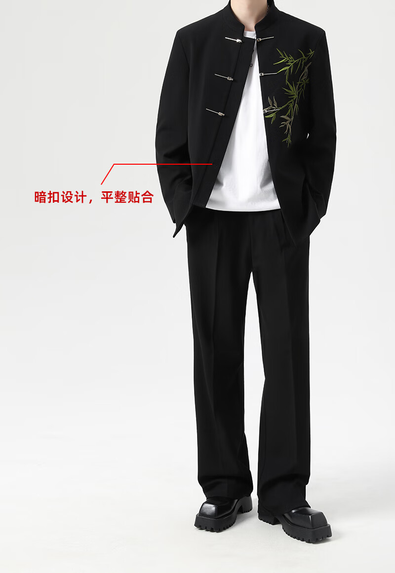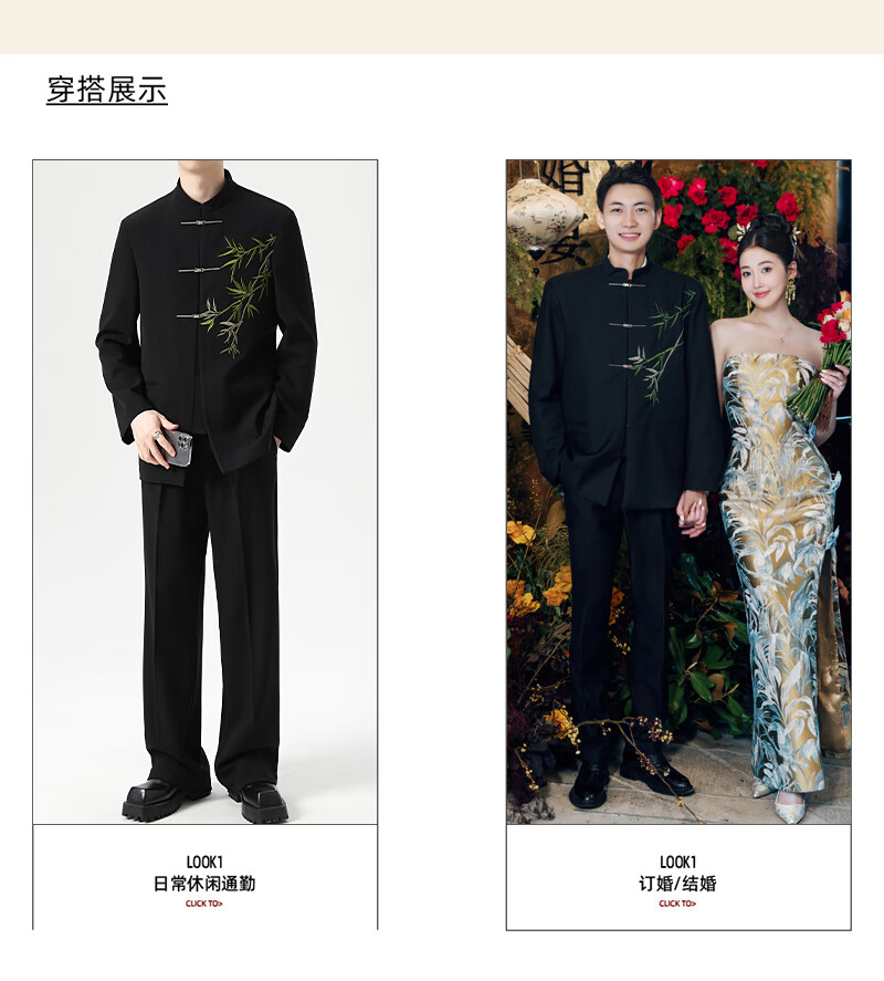 ROMON New Chinese tunic suit, engagement groom suit, men's wedding wedding high-end coat, national style embroidered suit suit, black jacket + pants XL