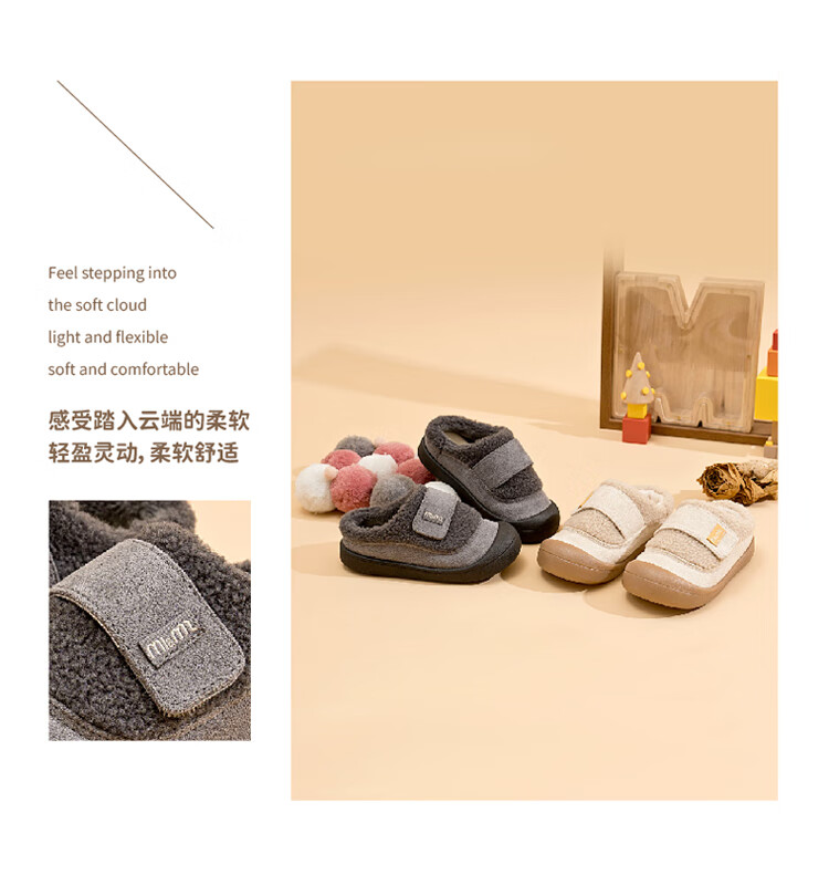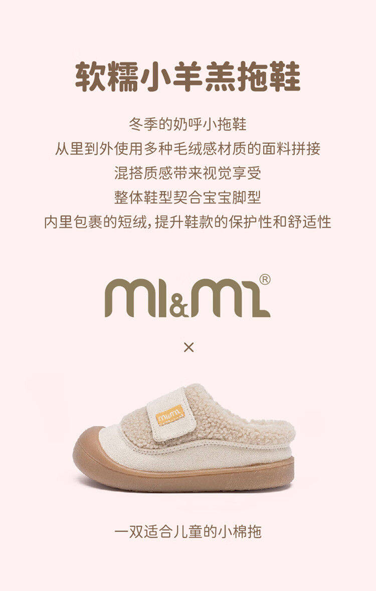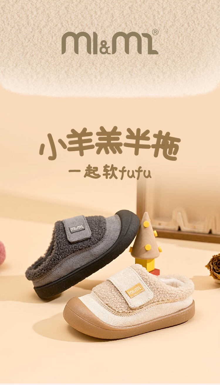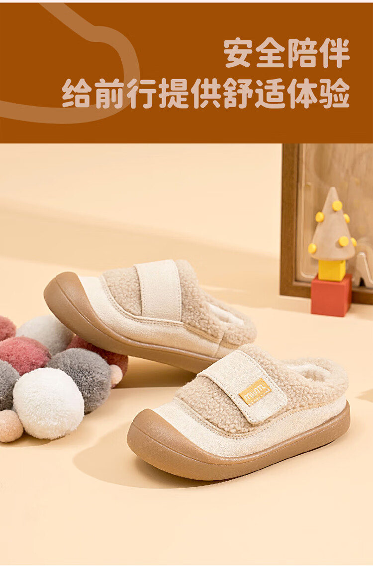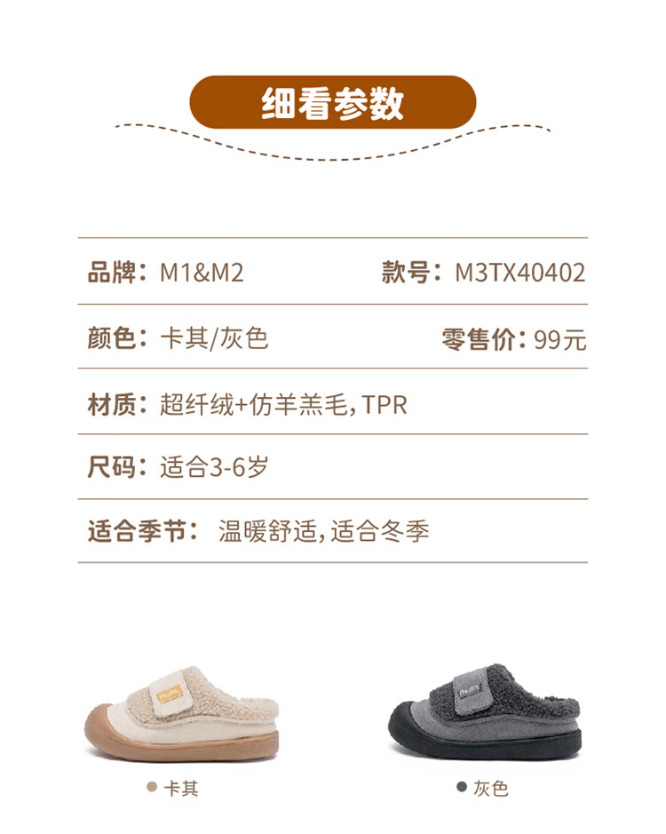 M1&M2 Spanish children's shoes, children's velvet slippers, new winter style, cute imitation wool velvet lining, half pack warm and comfortable cotton shoes, Khaki 27, suitable for feet 16~16.5cm long