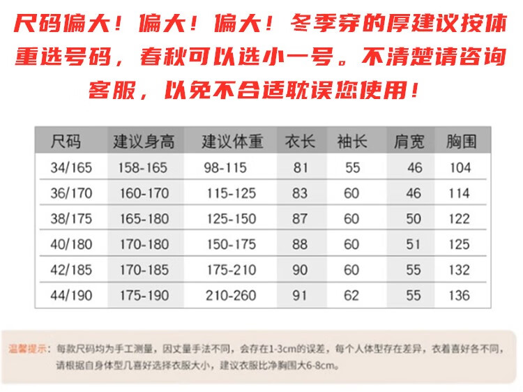 China (cm) 165 / 88-90 170 / 96-98 175 / 108-110 180 / 118-122 185 / 126-130