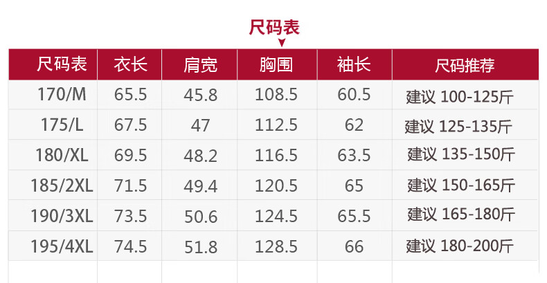 China (cm) 165 / 88-90 170 / 96-98 175 / 108-110 180 / 118-122 185 / 126-130