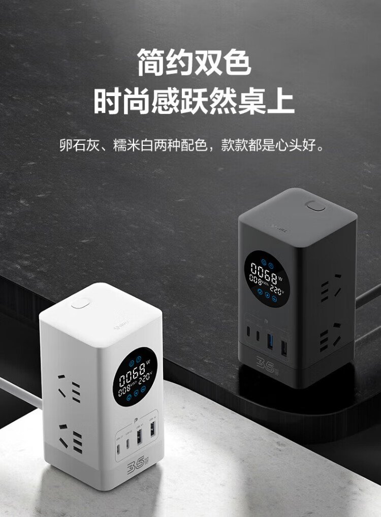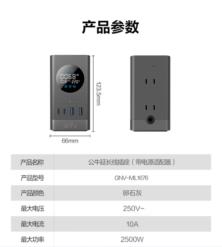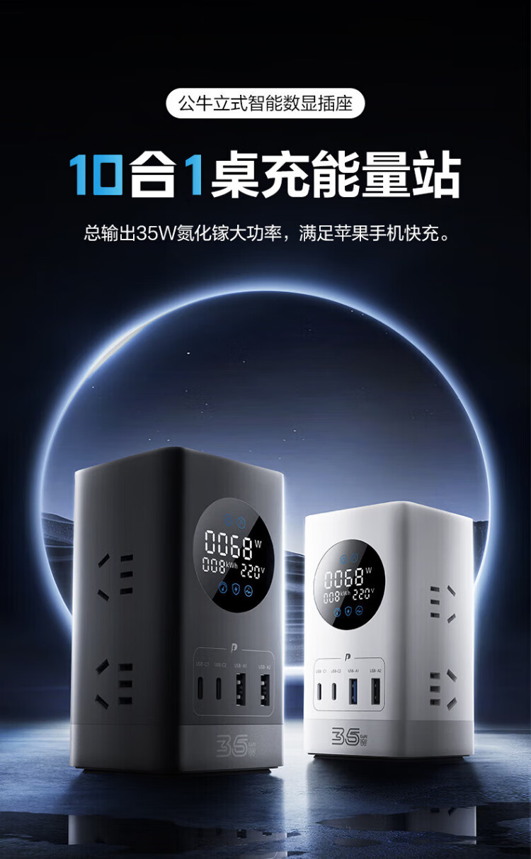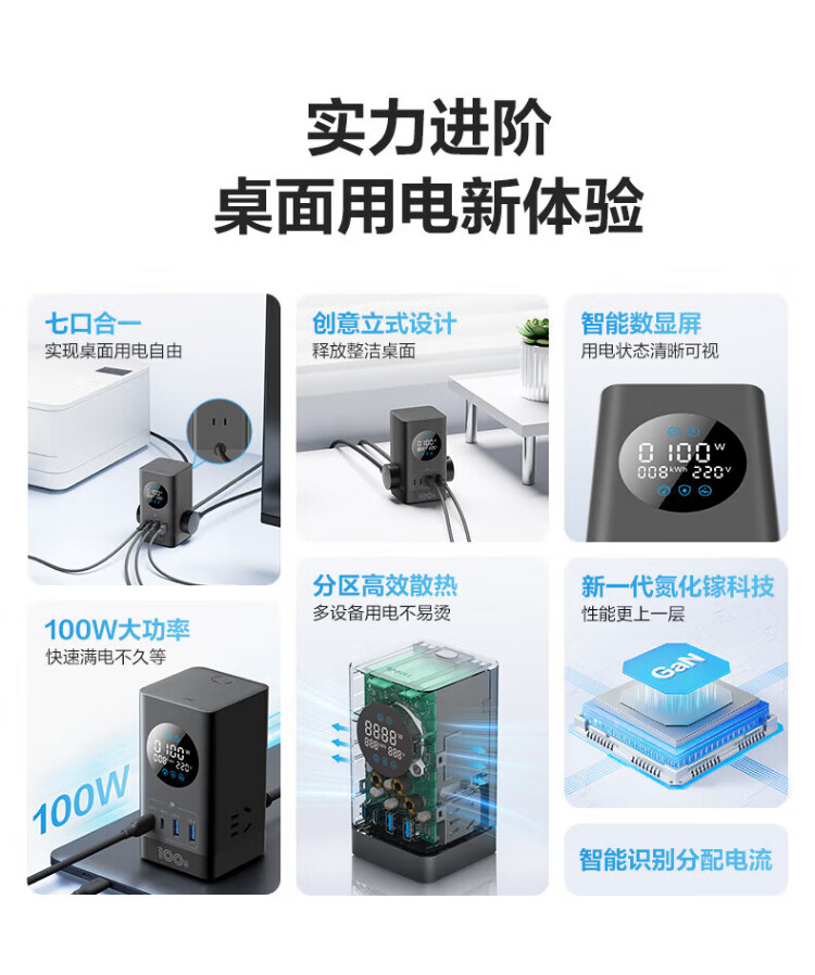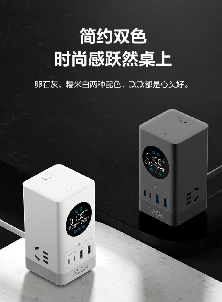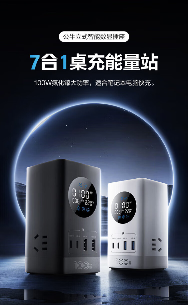 Bull (BULL) gallium nitride vertical fast charging socket smart digital display screen e-sports multi-functional desktop notebook power strip 100W seven-in-one 1.5 meter pebble gray vertical digital display gallium nitride fast charging socket