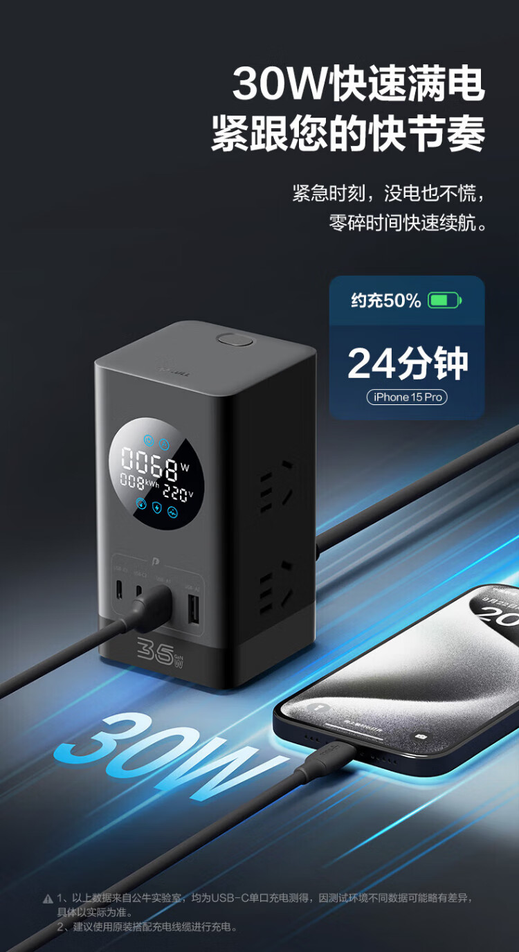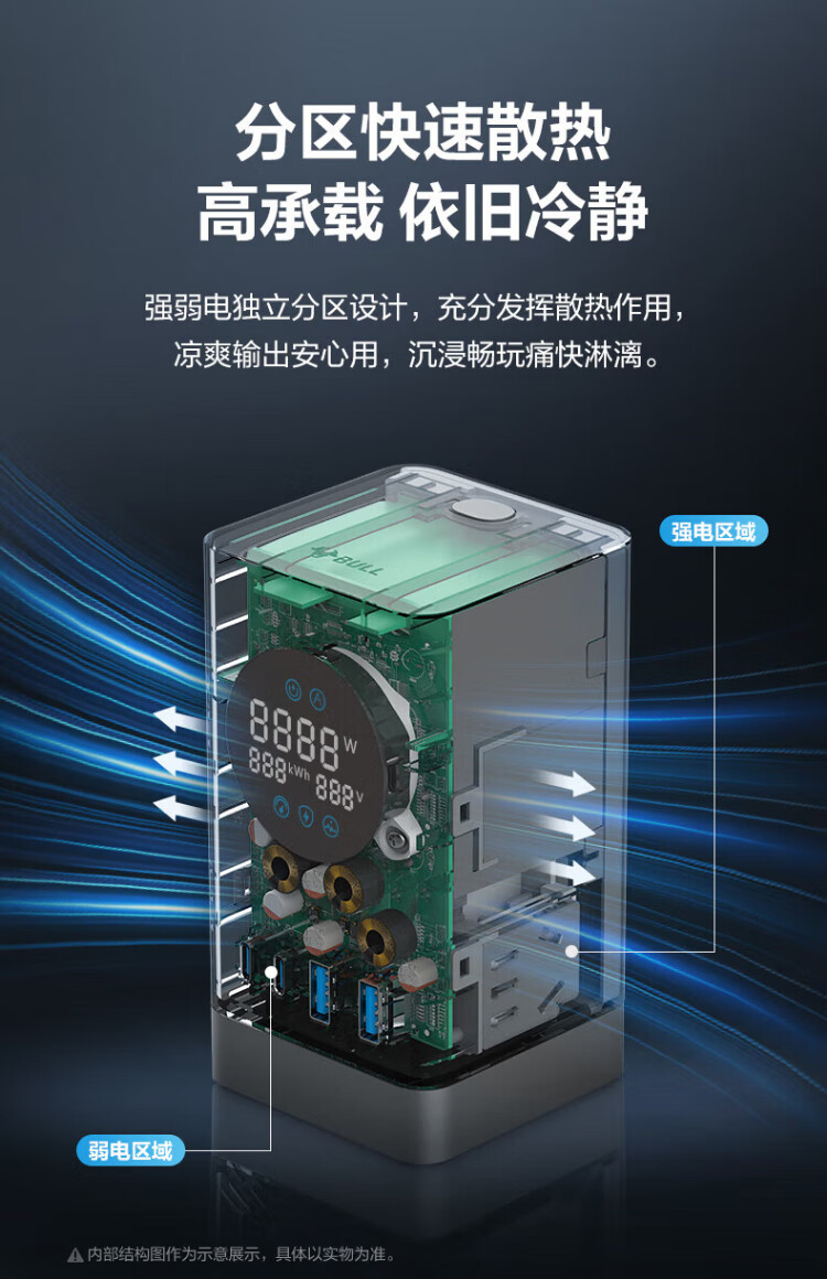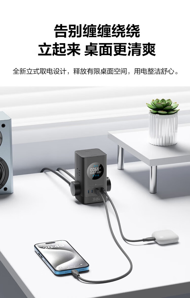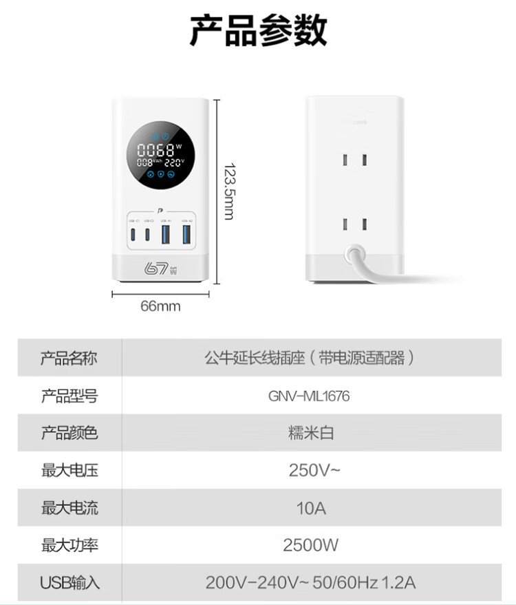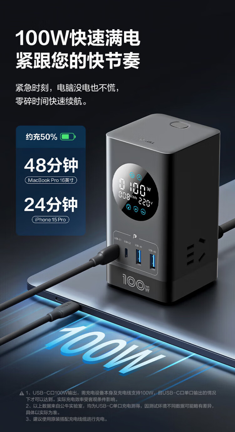 Bull (BULL) gallium nitride vertical fast charging socket smart digital display screen e-sports multi-functional desktop notebook power strip 100W seven-in-one 1.5 meter pebble gray vertical digital display gallium nitride fast charging socket