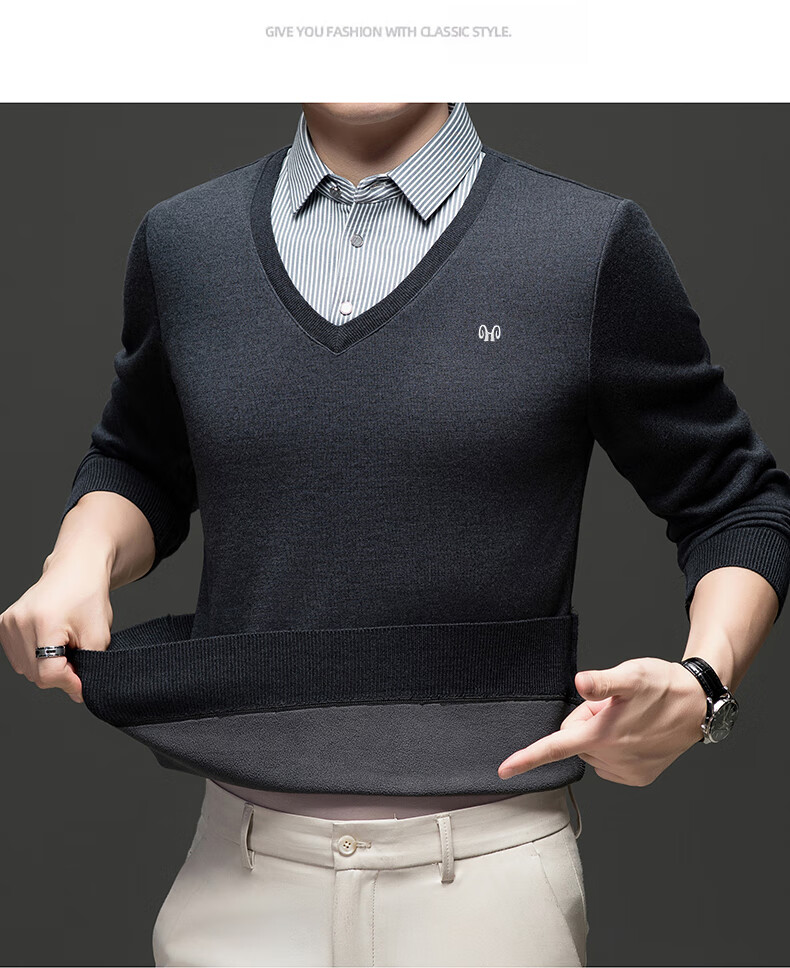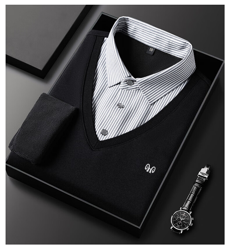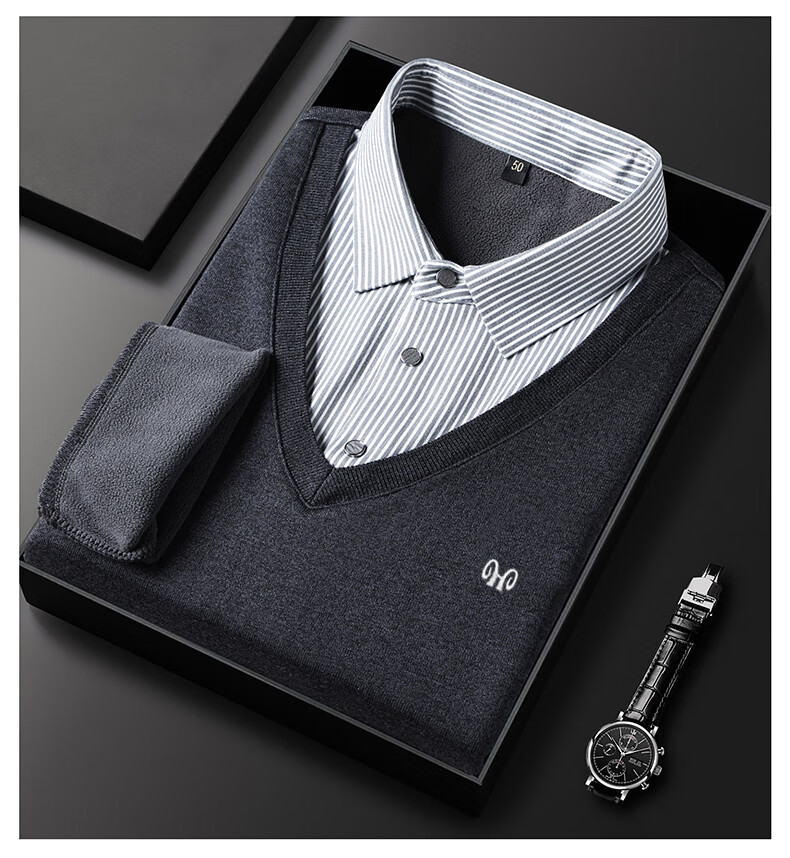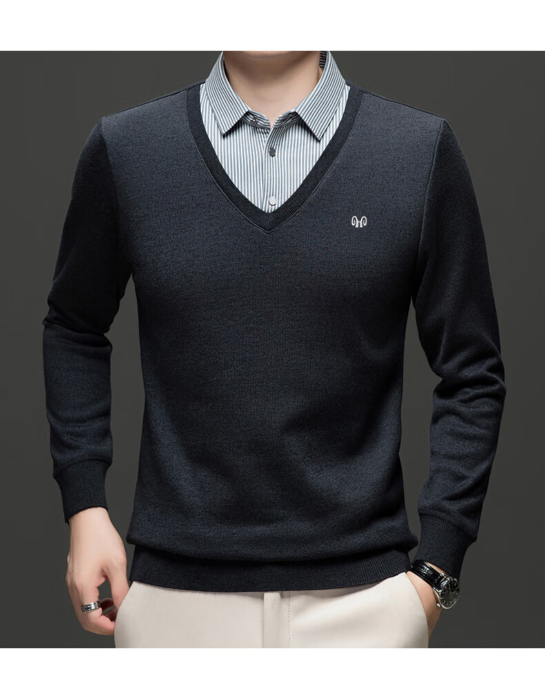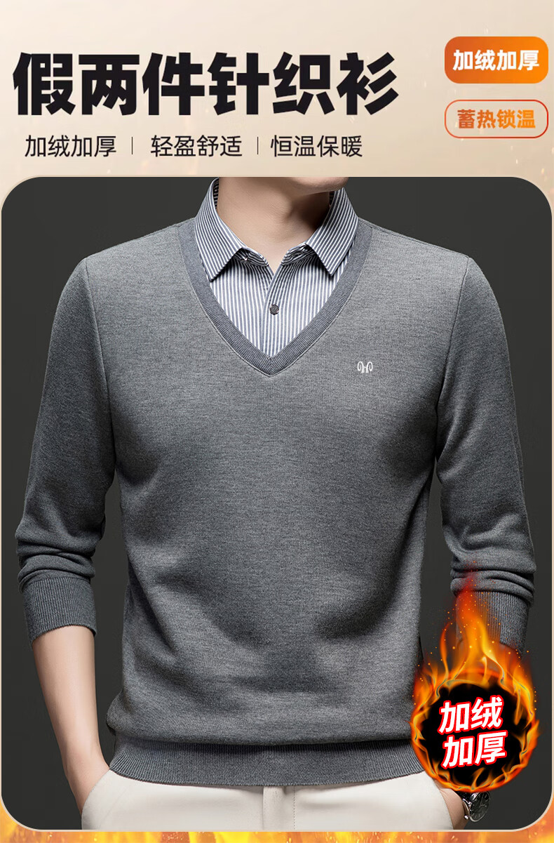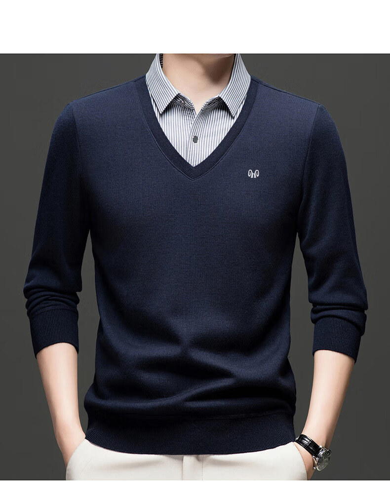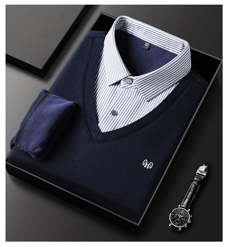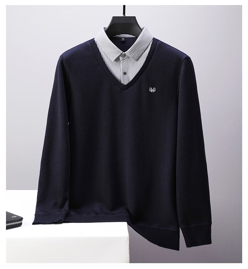 Hengyuanxiang 2025 Autumn and Winter Wool Sweater Men's Shirt Collar Fake Two-Piece Sweater Winter Plush Thickened Warm Knitted Wool Sweater Navy Blue 3XL (185) 160-175Jin Jin equals 0.5 kg