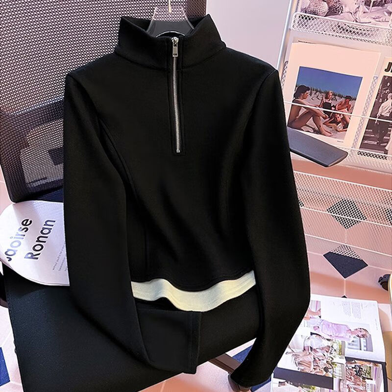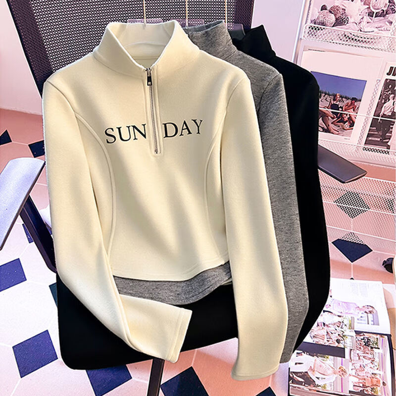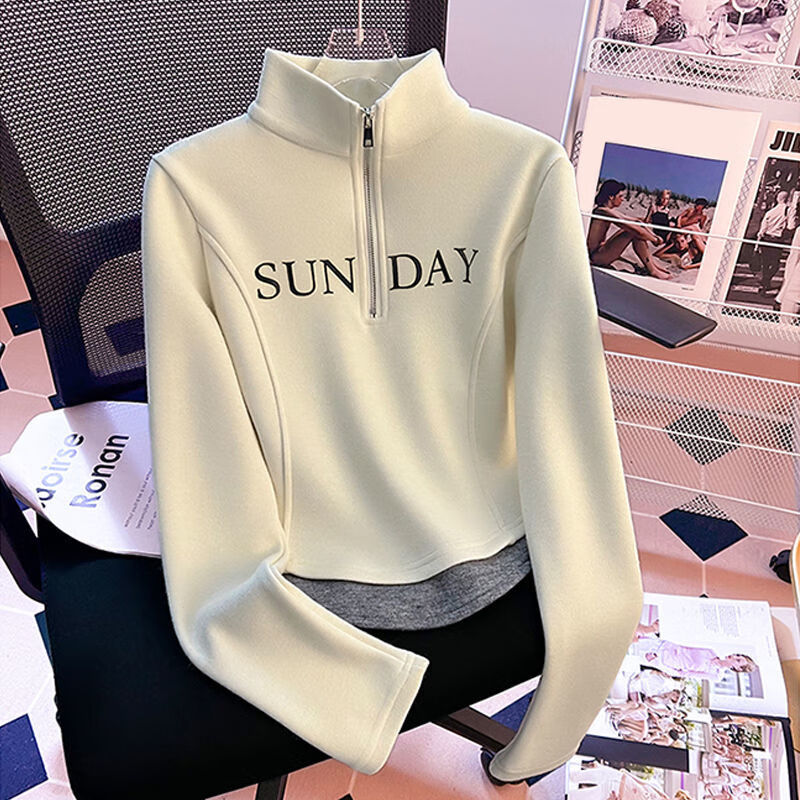 G.duck velvet top for girls 2024 new style half turtleneck zipper fake two-piece versatile warm long-sleeved T-shirt apricot letter 160 recommended height 146-157cm