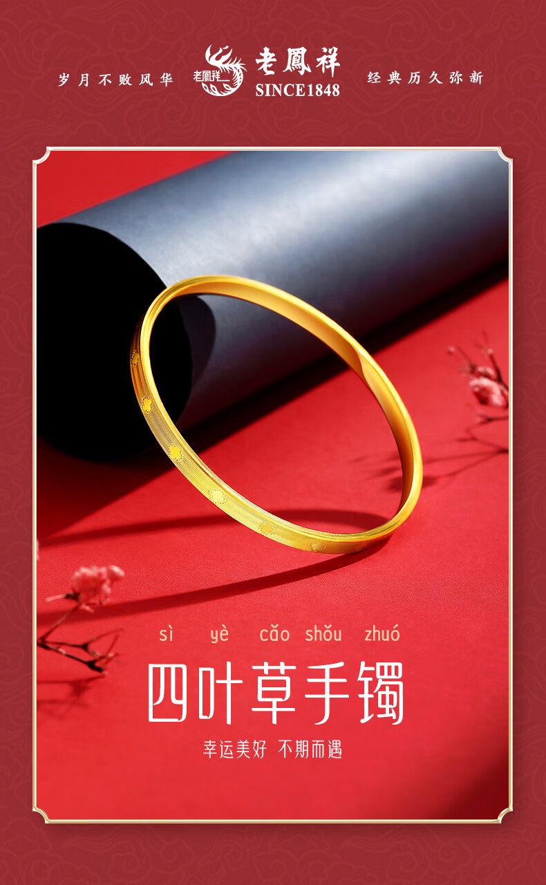 Lao Fengxiang gold four-leaf clover bracelet for women 999 pure gold bracelet plain ring hand ornaments Chinese Valentine's Day gift for girlfriend 54# four-leaf clover bracelet gold weight about 5.2g brand gift box