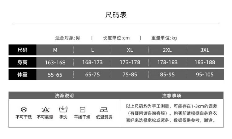 China (cm) 165 / 88-90 170 / 96-98 175 / 108-110 180 / 118-122 185 / 126-130