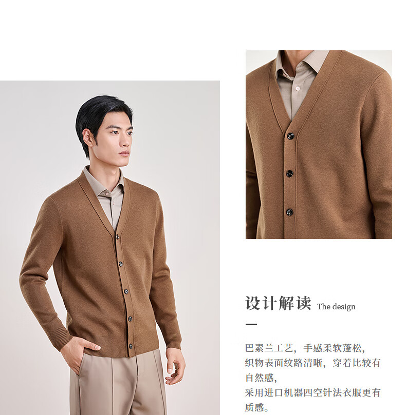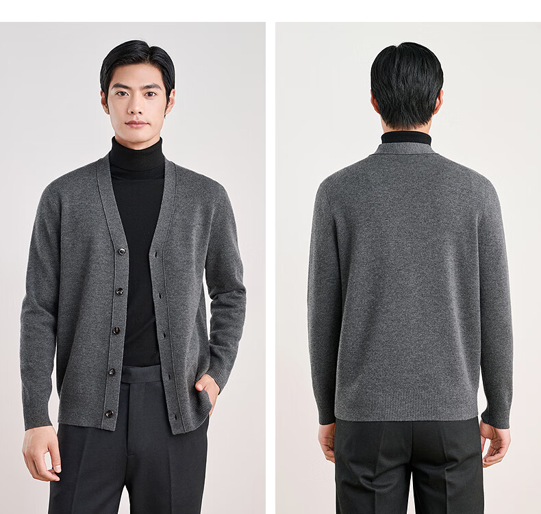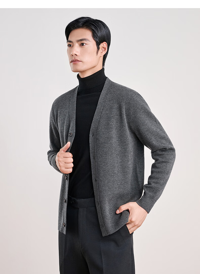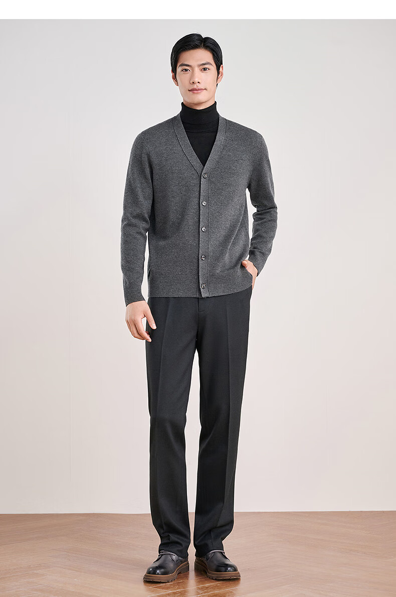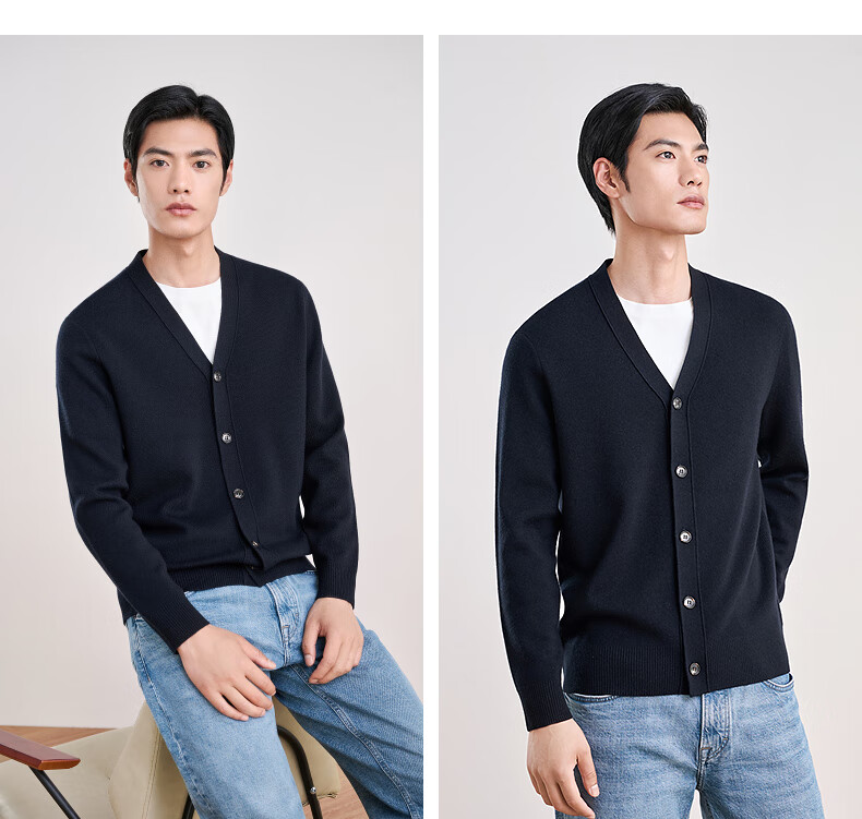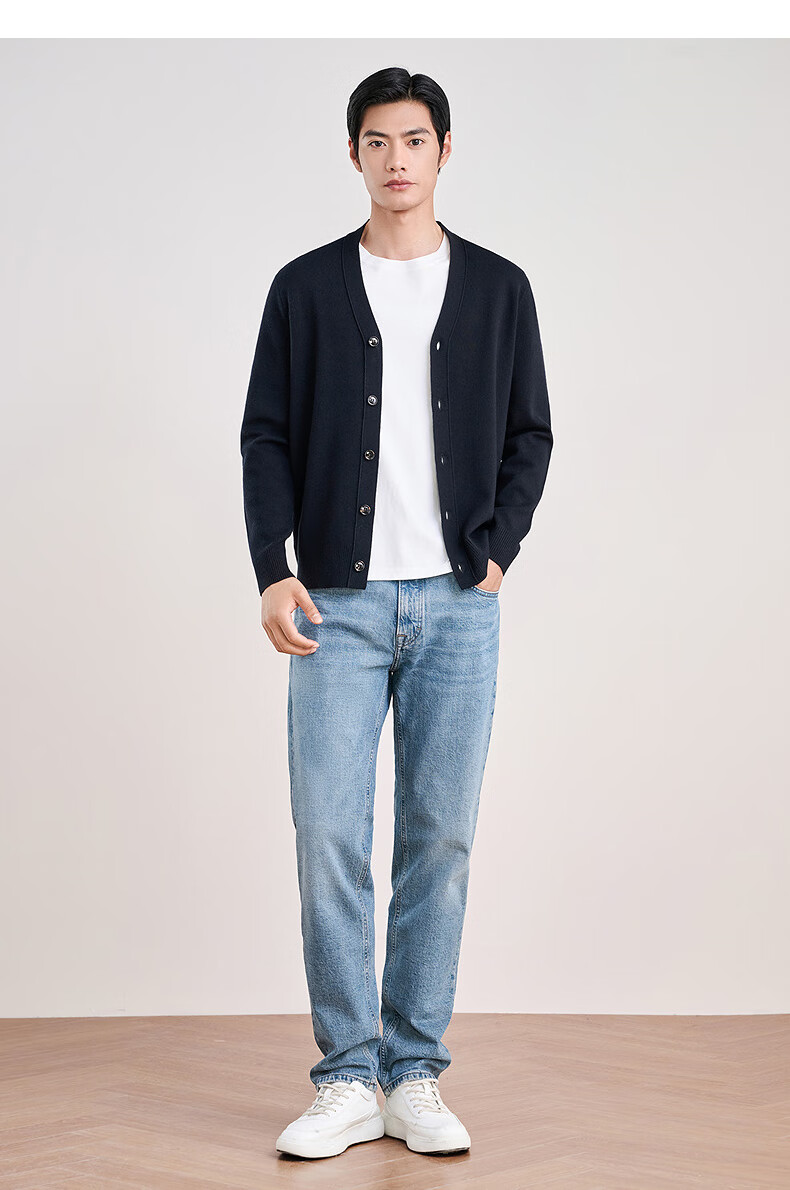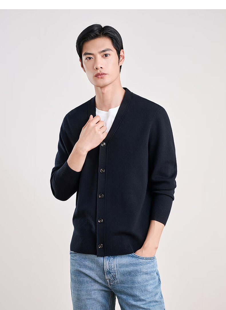 Hengyuanxiang Basulan worsted wool sweater men's machine washable sweater solid color casual V-neck sweater cardigan black navy L /175/92A