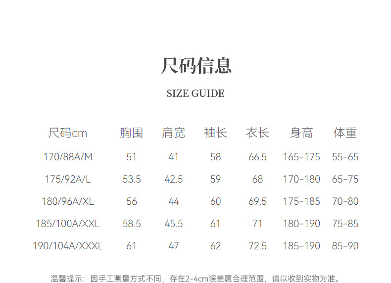 China (cm) 165 / 88-90 170 / 96-98 175 / 108-110 180 / 118-122 185 / 126-130
