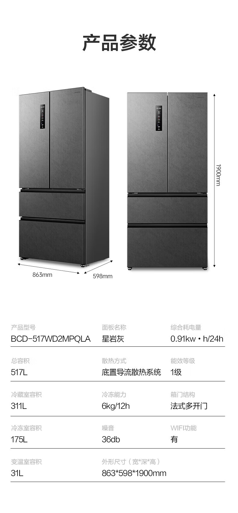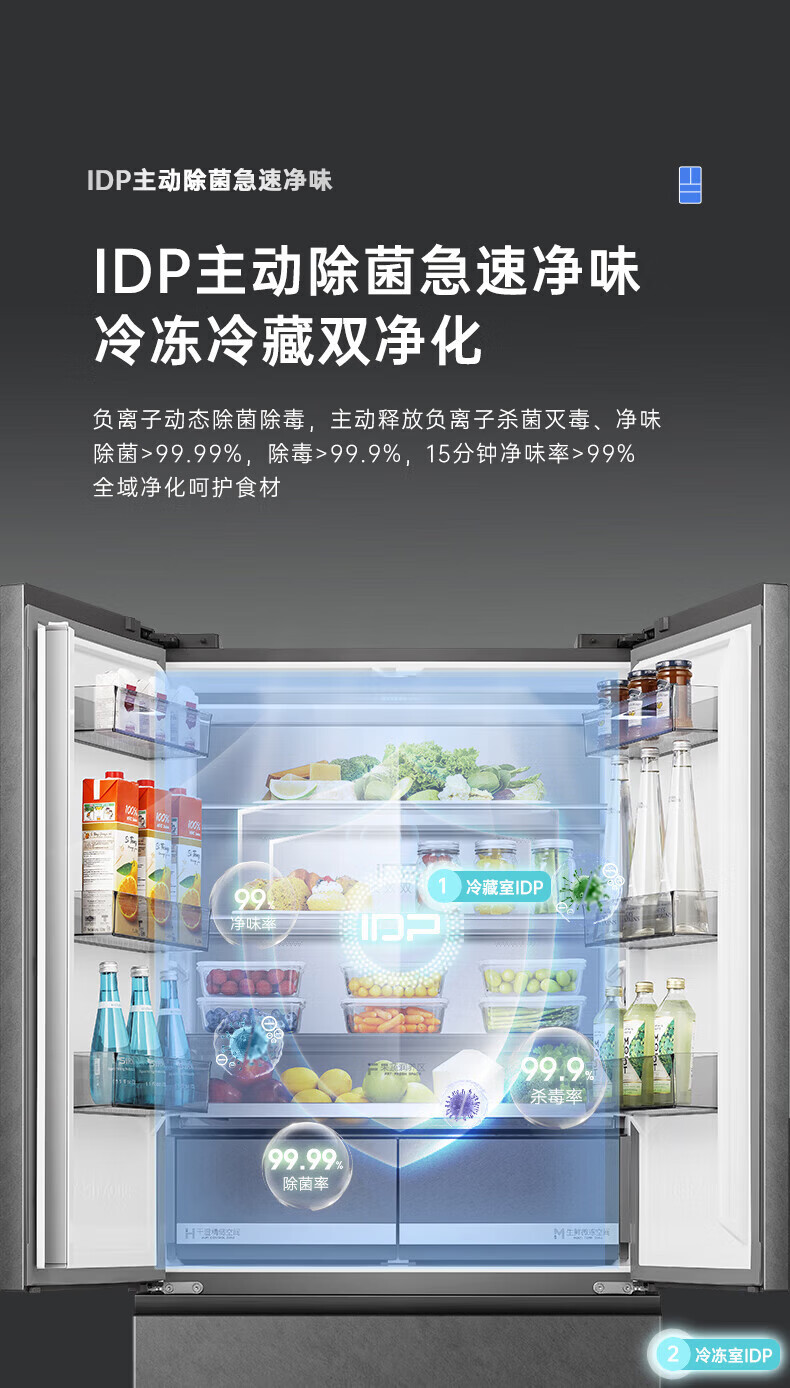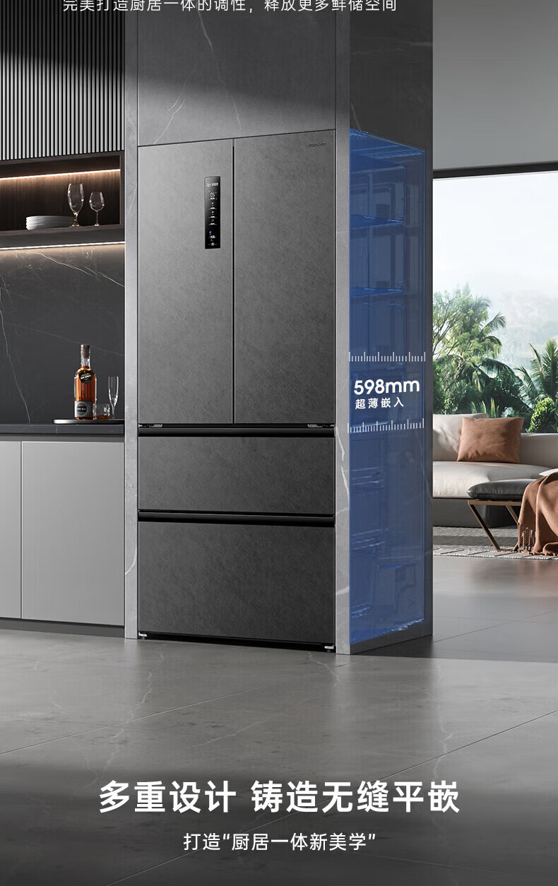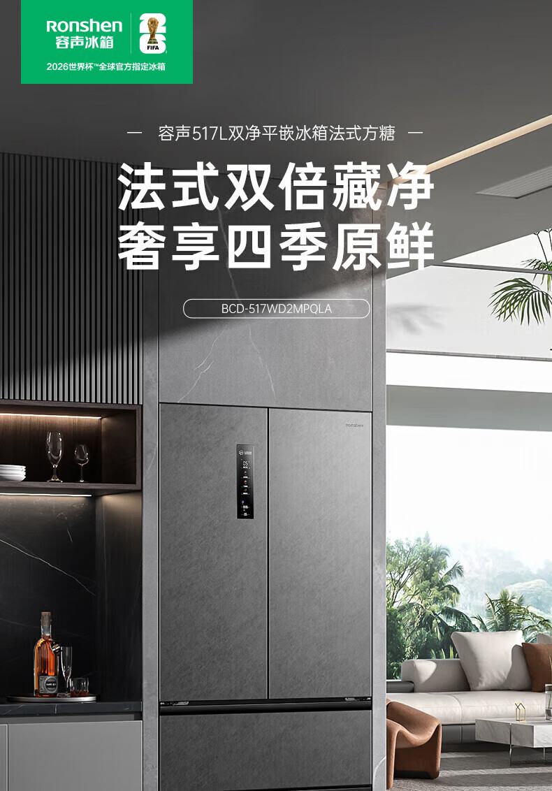 Rongsheng 517 liter double purified French multi-door four-door household refrigerator IDP active sterilization ultra-thin zero embedded first-level energy efficiency air-cooled frost-free trade-in national subsidy IDP double purified BCD-517WD2MPQLA Star Rock Gray