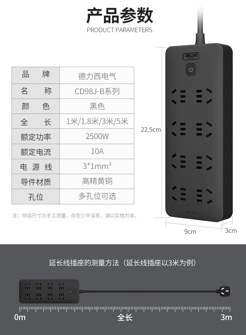 DELIXI's new national standard black power strip/row/socket child protection door high temperature resistant power strip master control home office dormitory use three-position master control 1 meter
