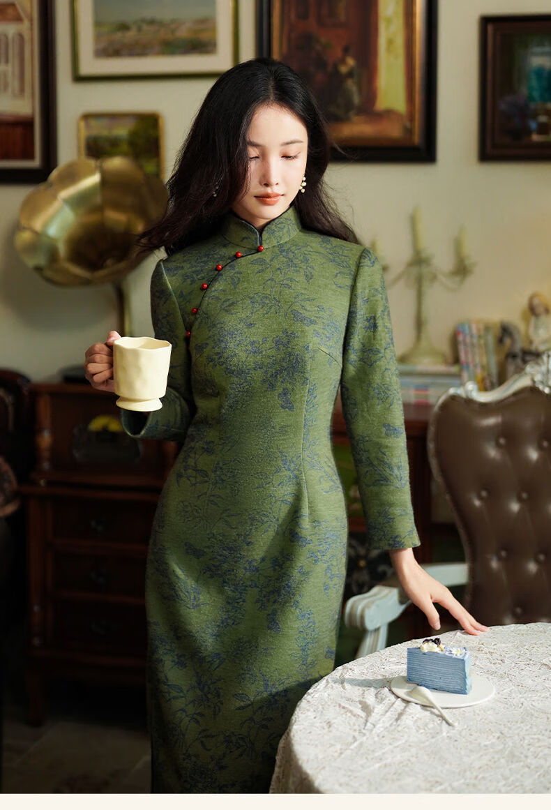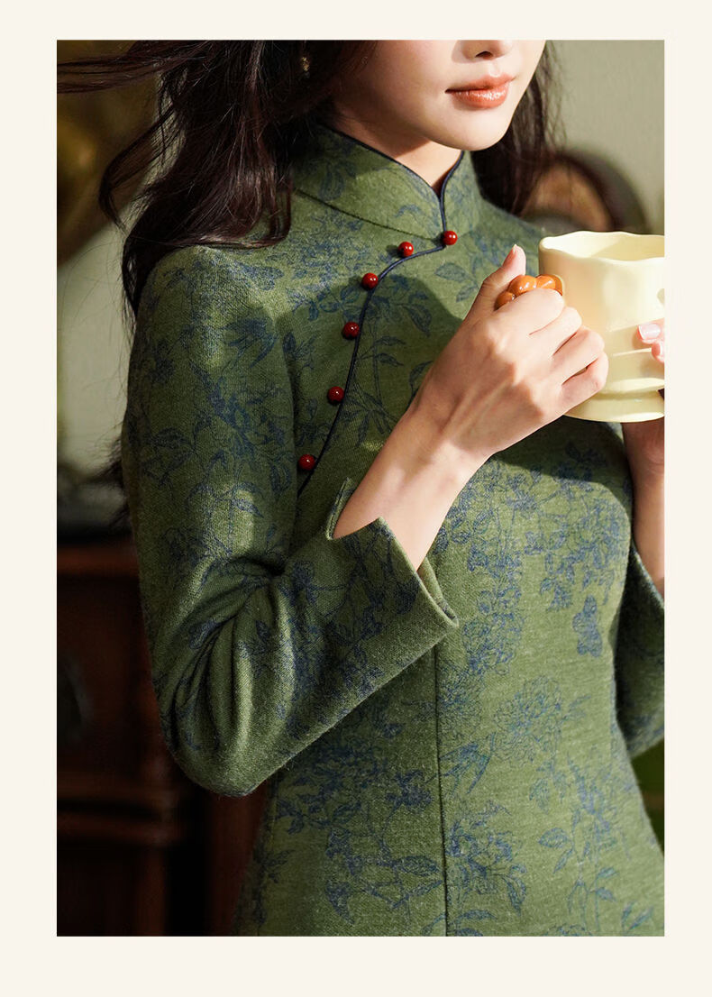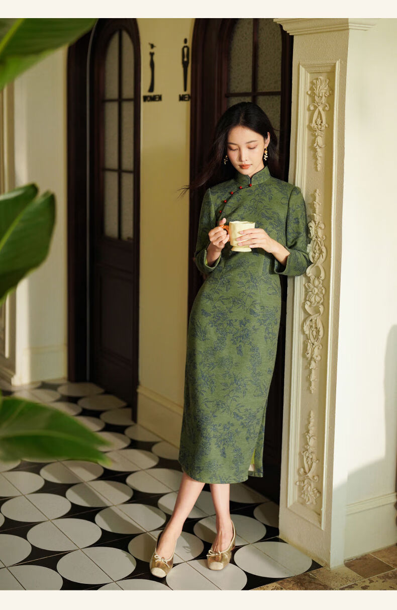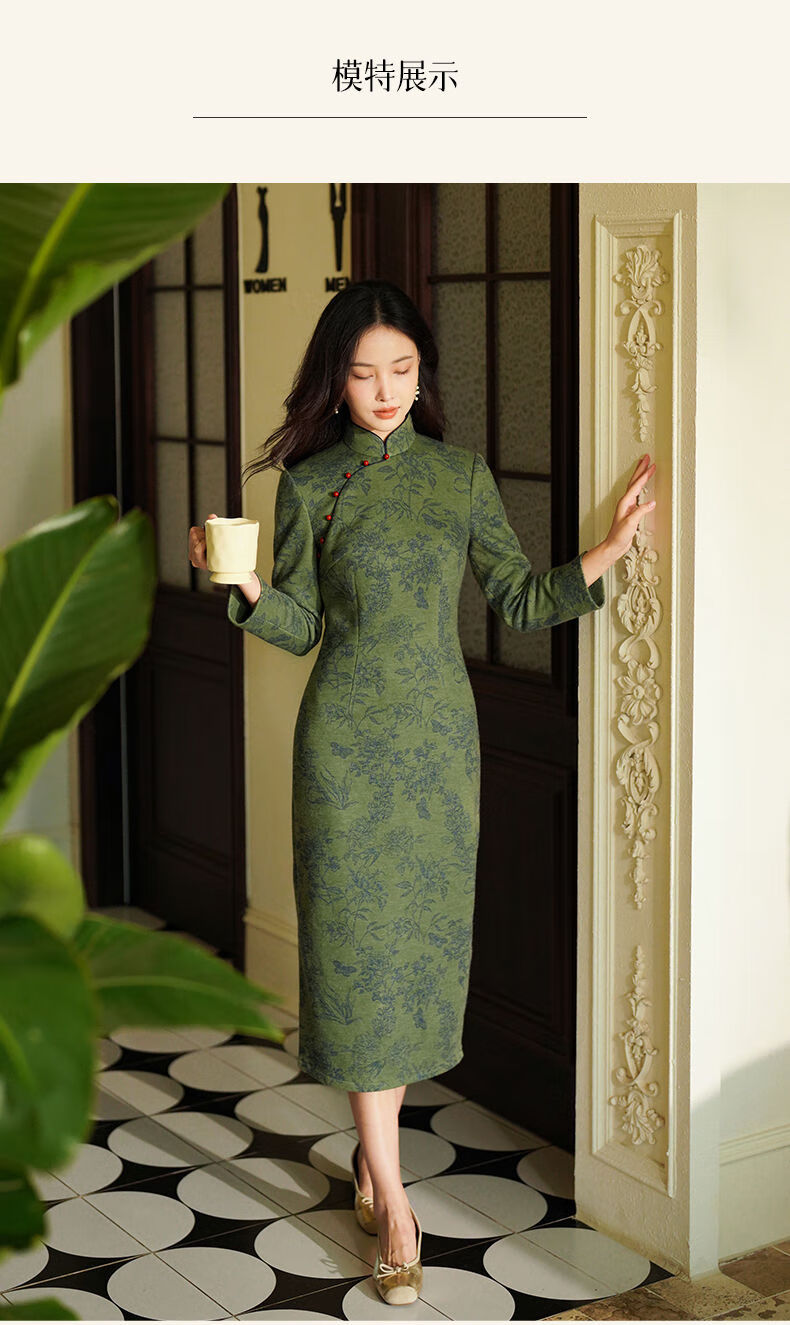 E.Beauty Shiwan 2025 spring new thickened brushed knitted new Chinese style daily long-sleeved elegant cheongsam turquoise green M
