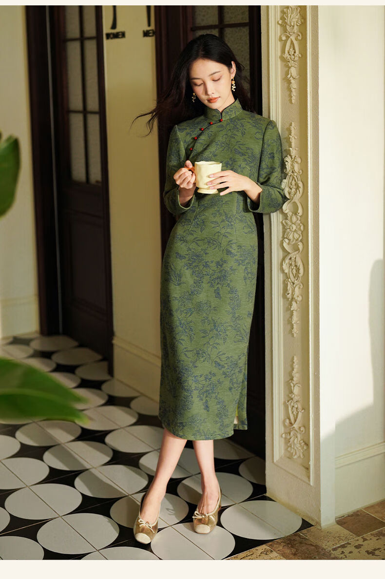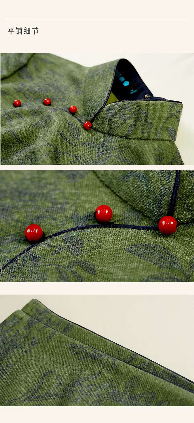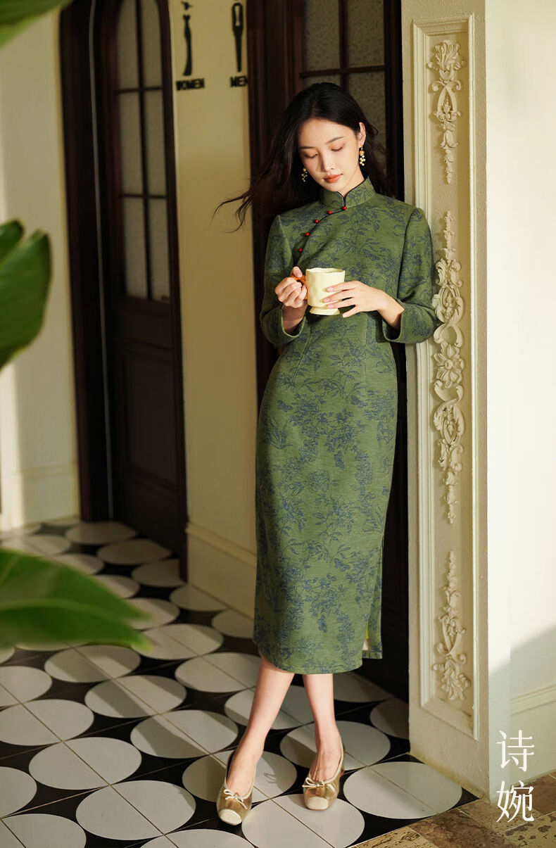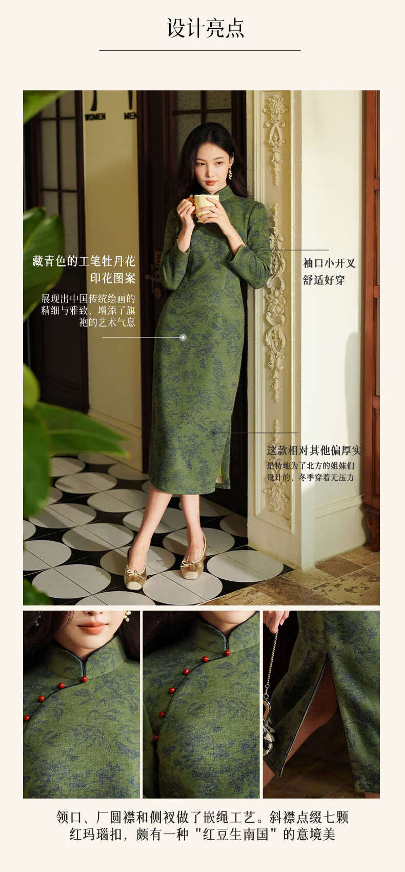 E.Beauty Shiwan 2025 spring new thickened brushed knitted new Chinese style daily long-sleeved elegant cheongsam turquoise green M