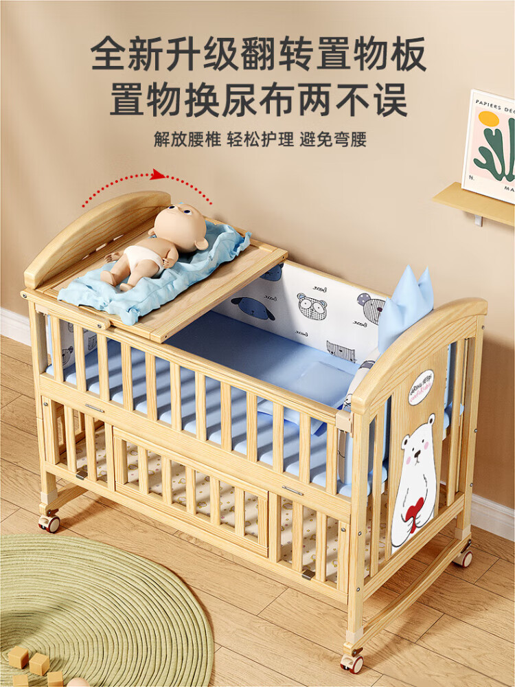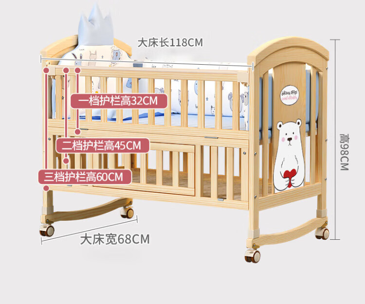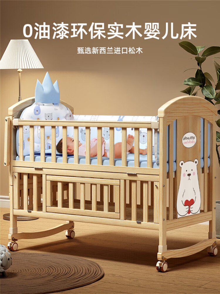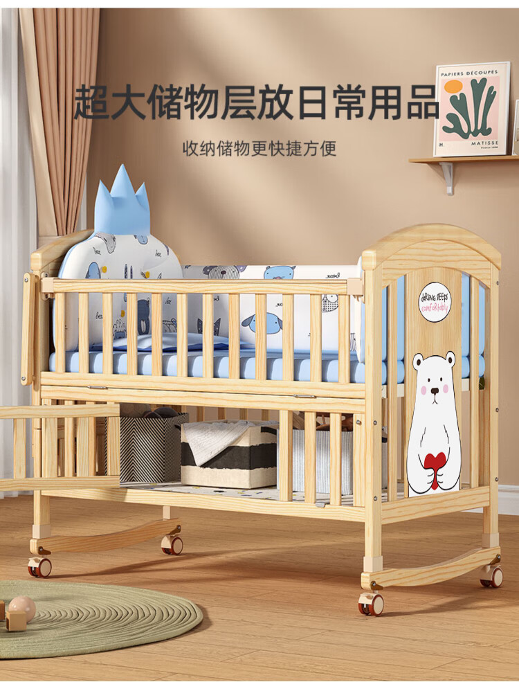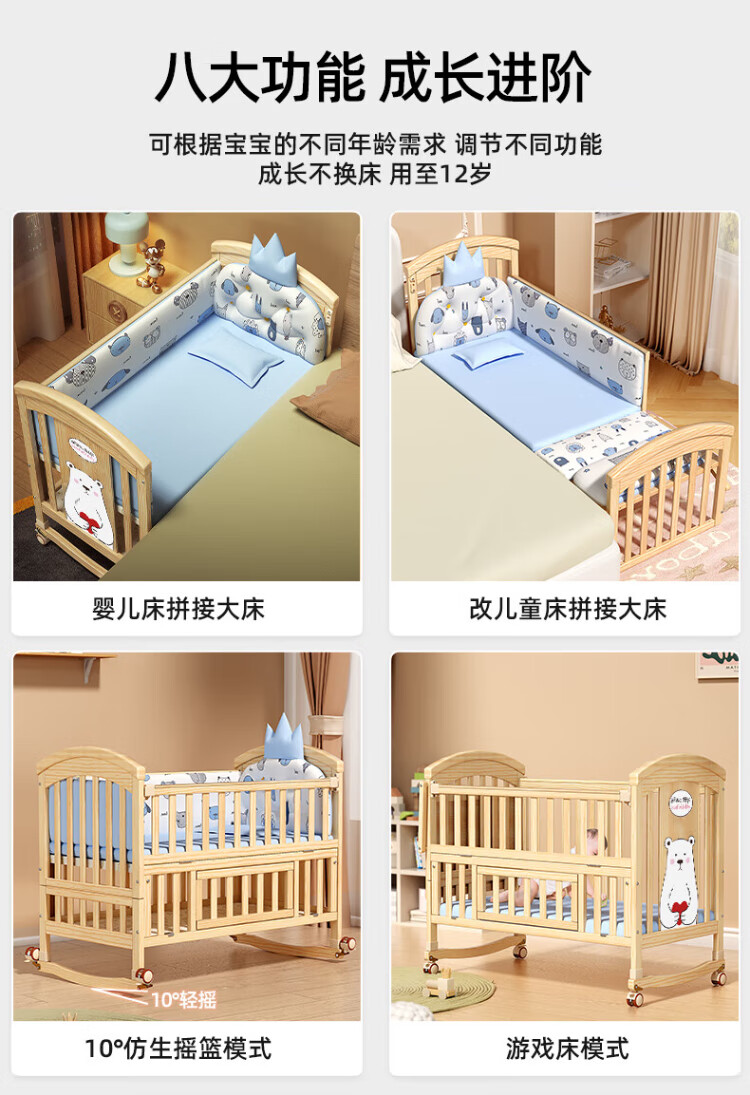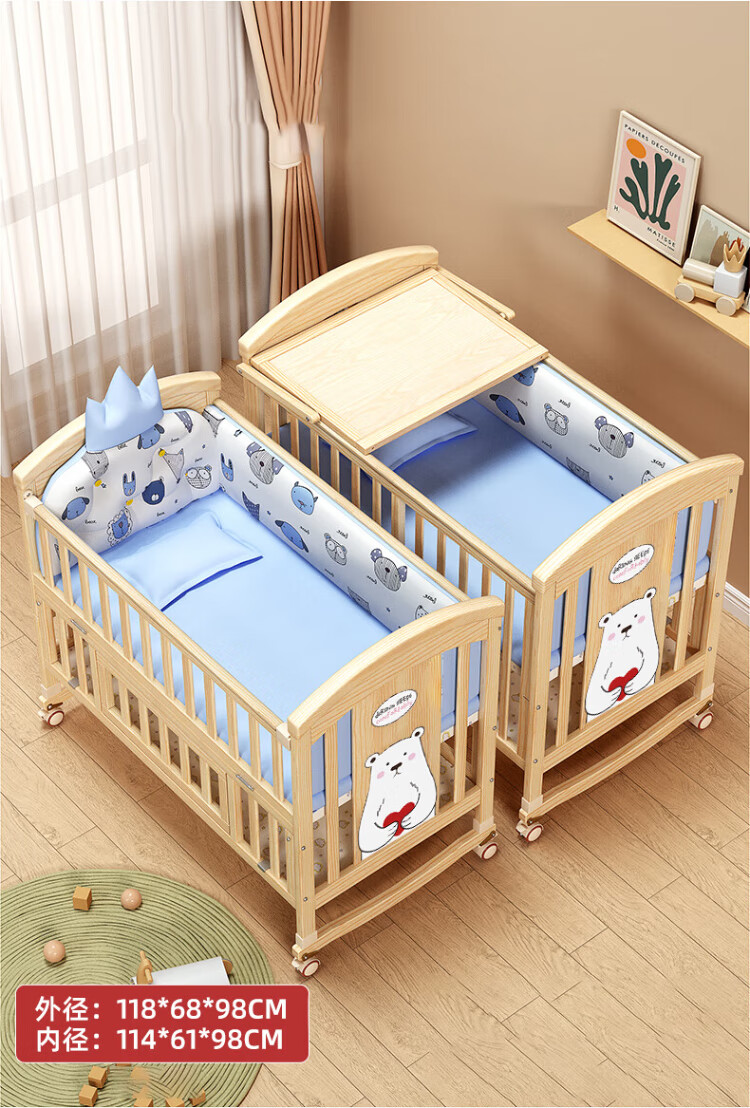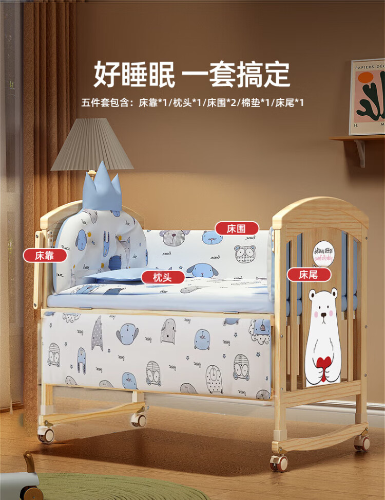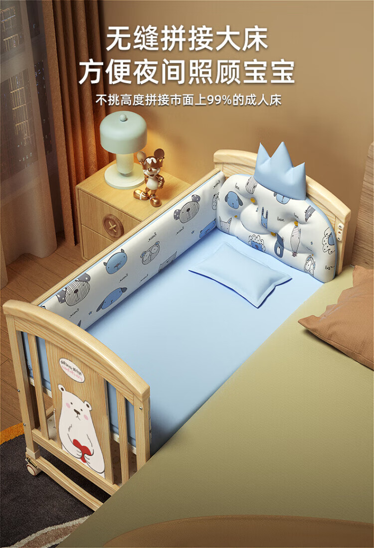 ANGI BABY crib solid wood unpainted baby bed spliced large bed multi-functional newborn bb rocking bed removable children's bed bed + brown cushion + crown five-piece set blue classic bear