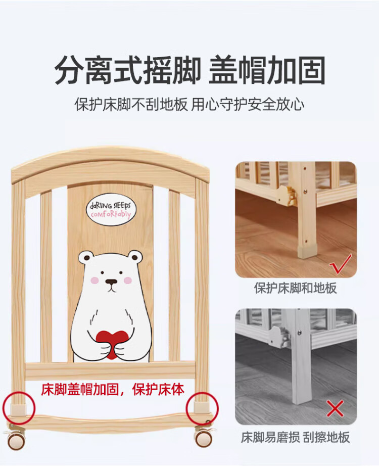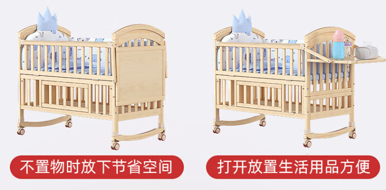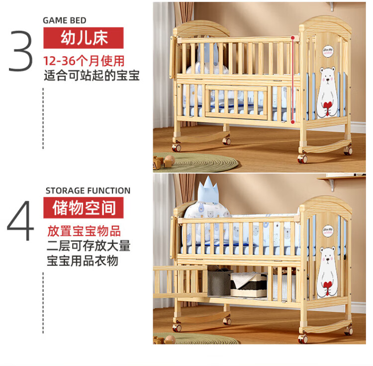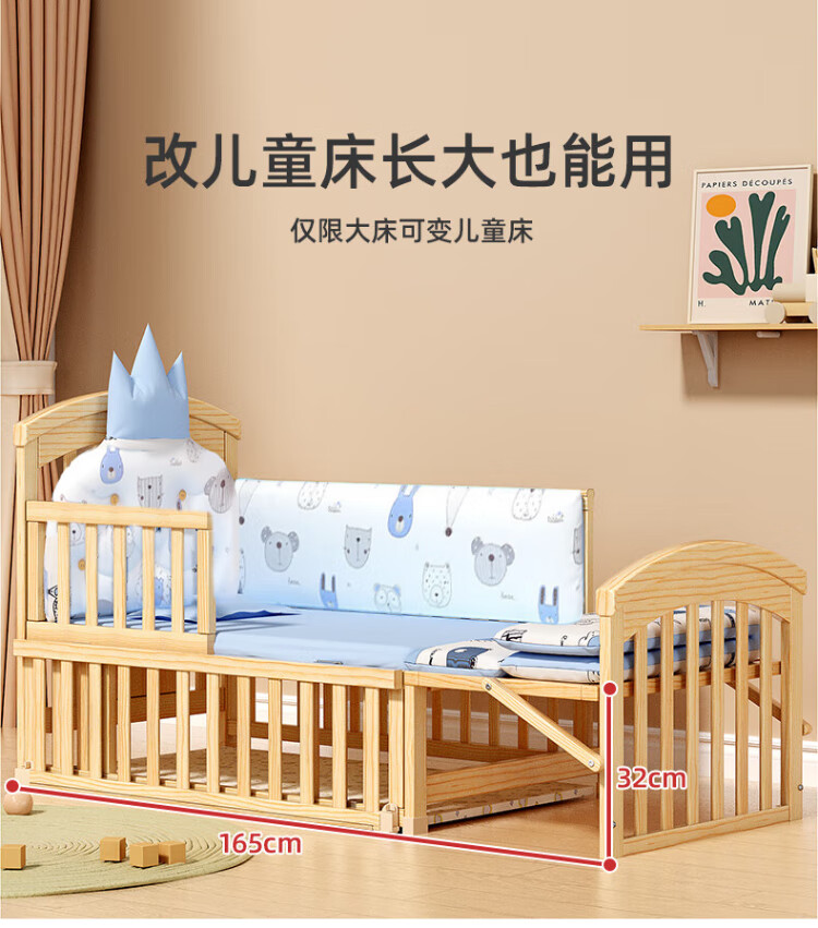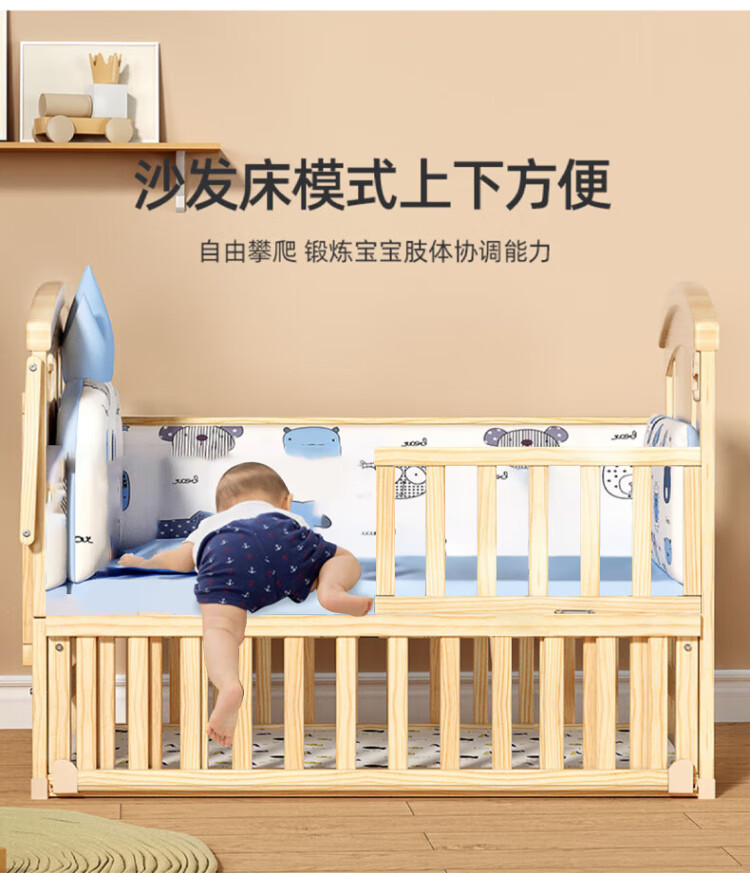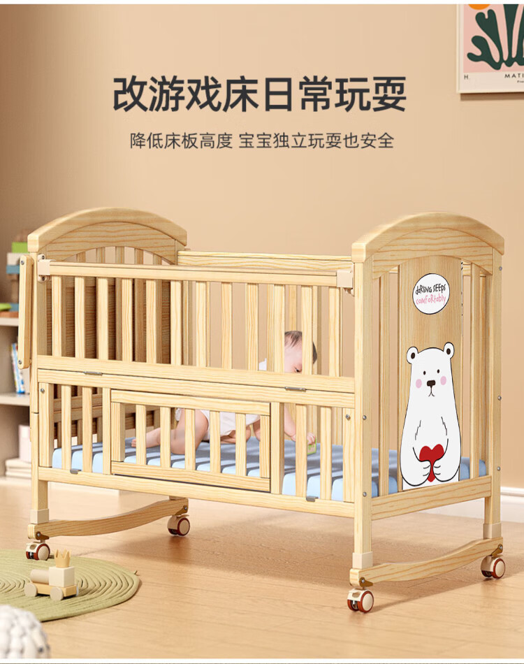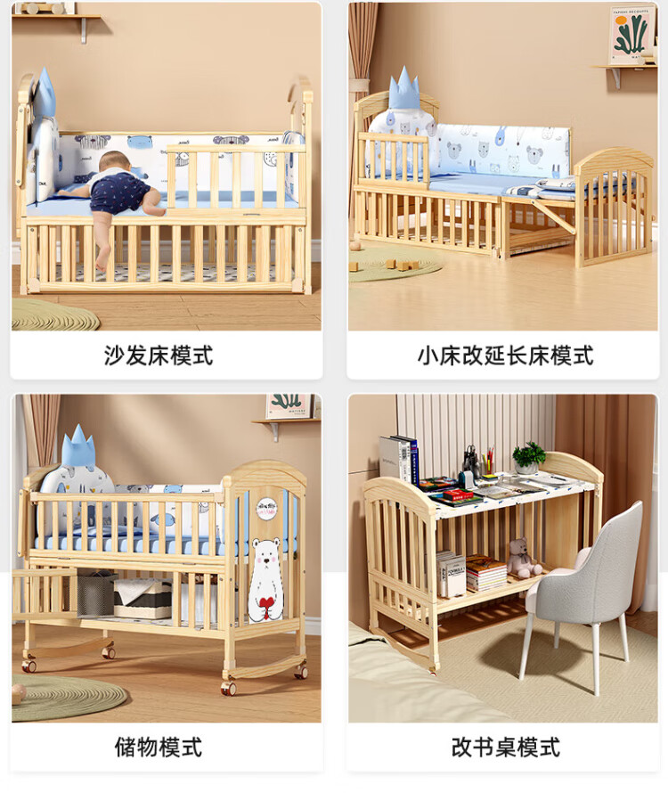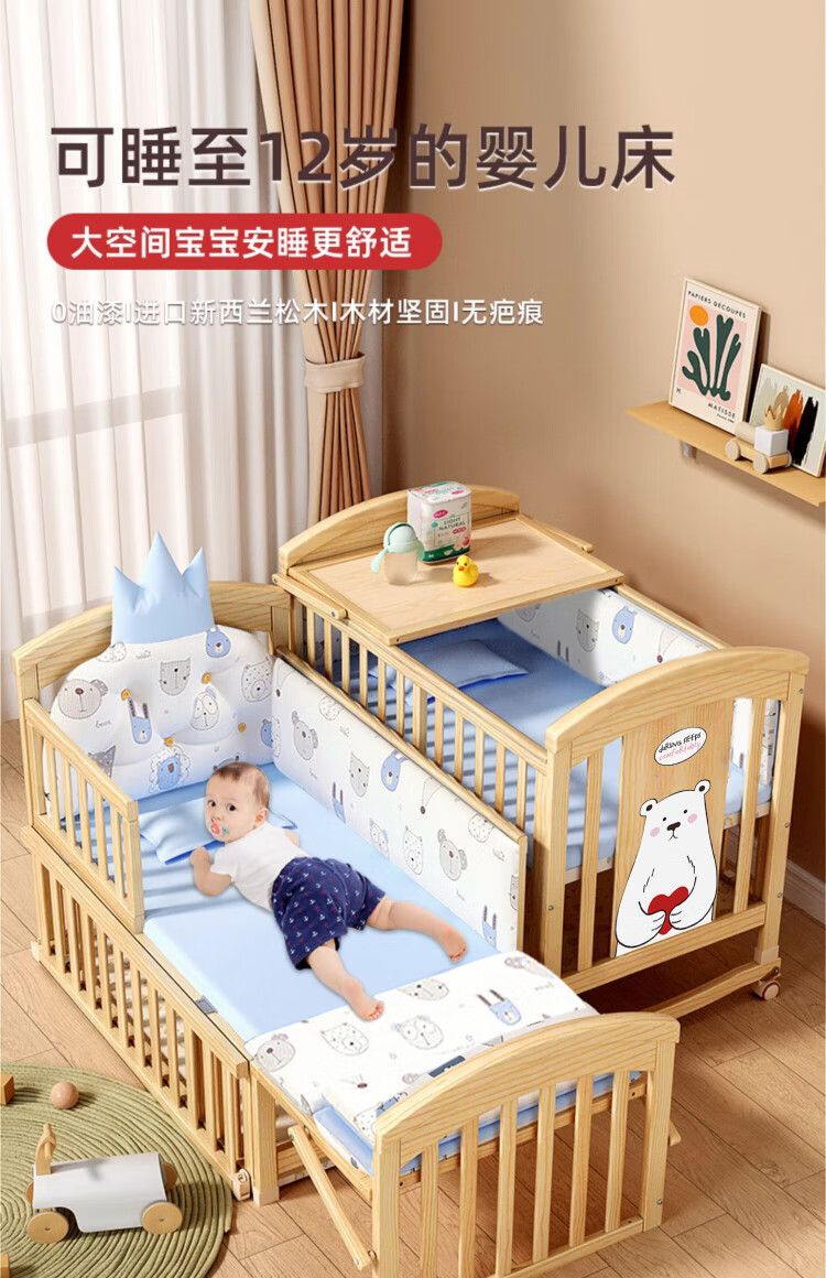 ANGI BABY crib solid wood unpainted baby bed spliced large bed multi-functional newborn bb rocking bed removable children's bed bed + brown cushion + crown five-piece set blue classic bear