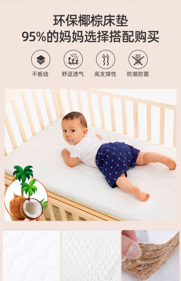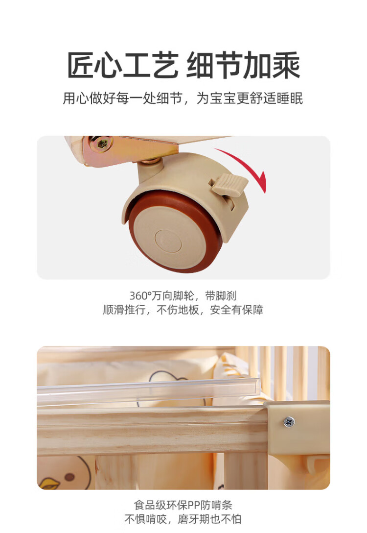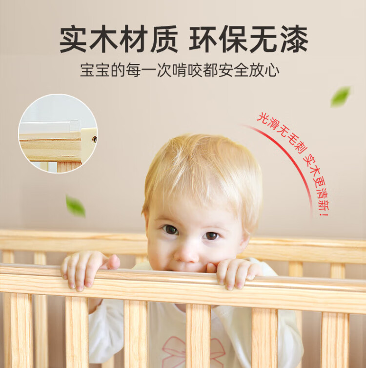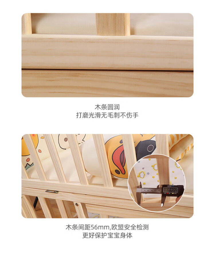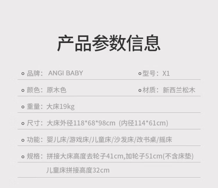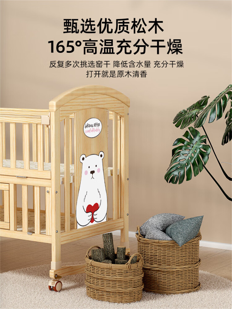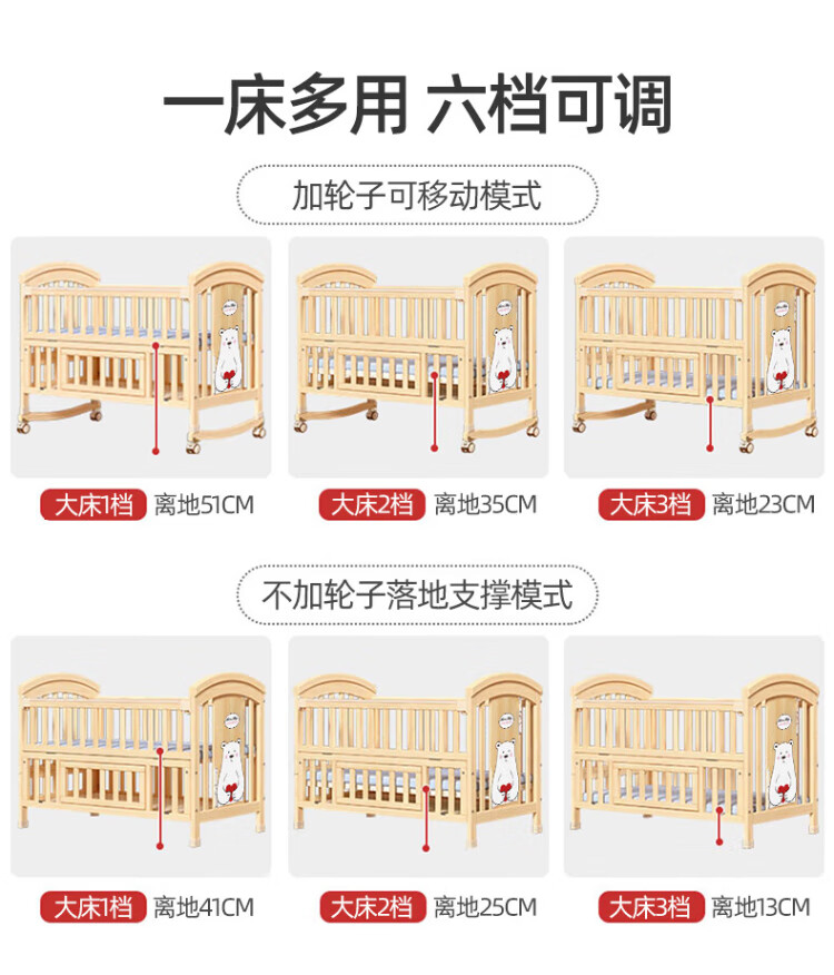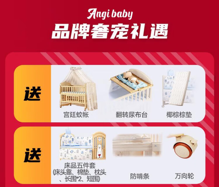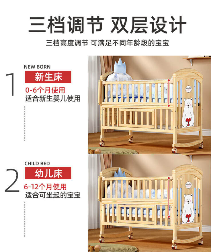 ANGI BABY crib solid wood unpainted baby bed spliced large bed multi-functional newborn bb rocking bed removable children's bed bed + brown cushion + crown five-piece set blue classic bear