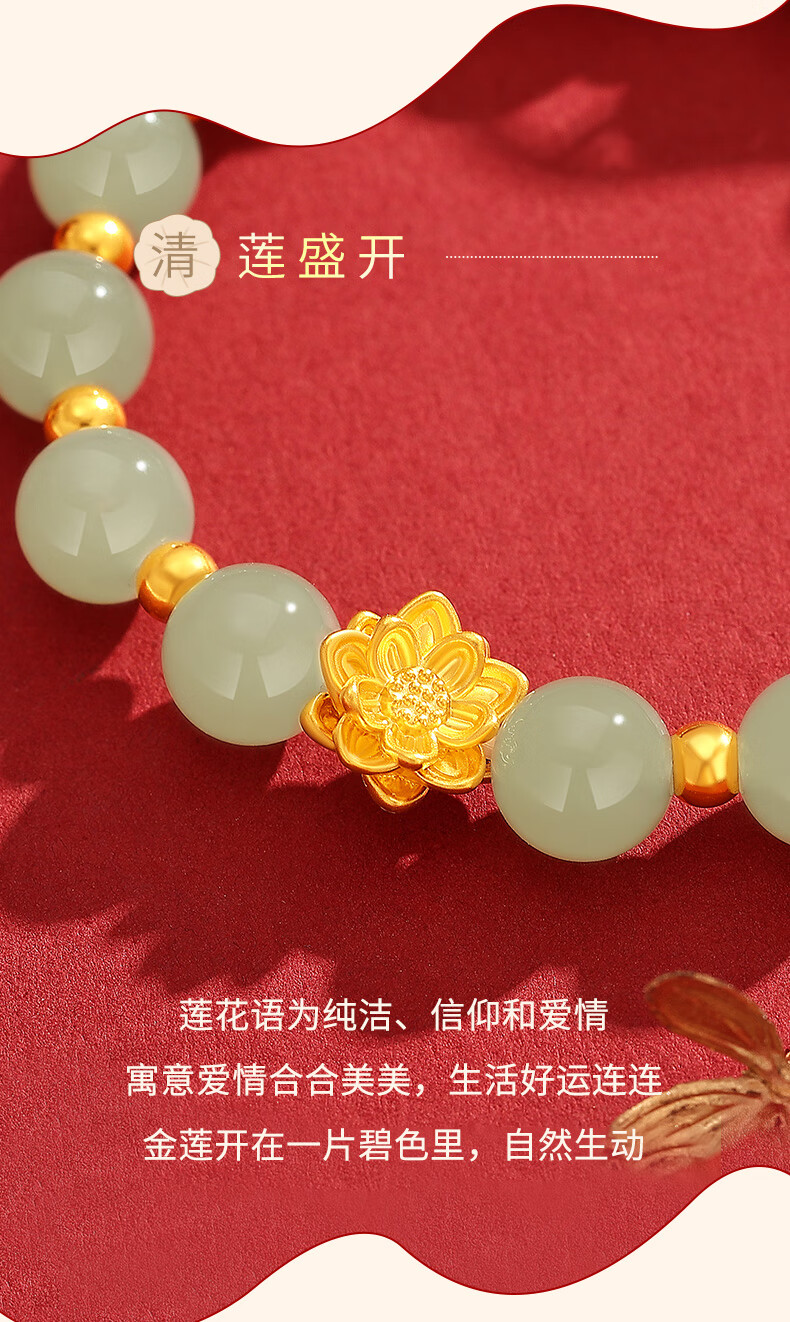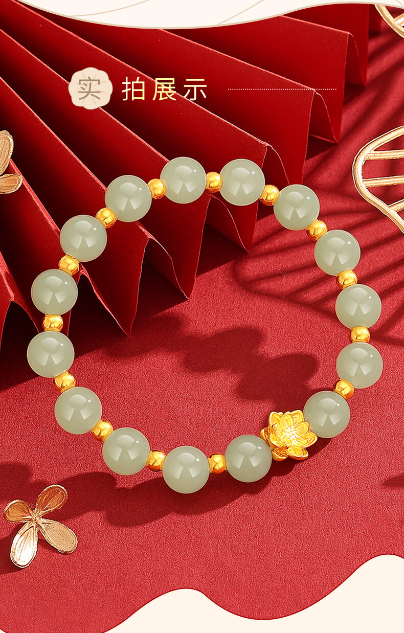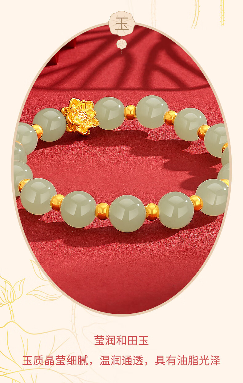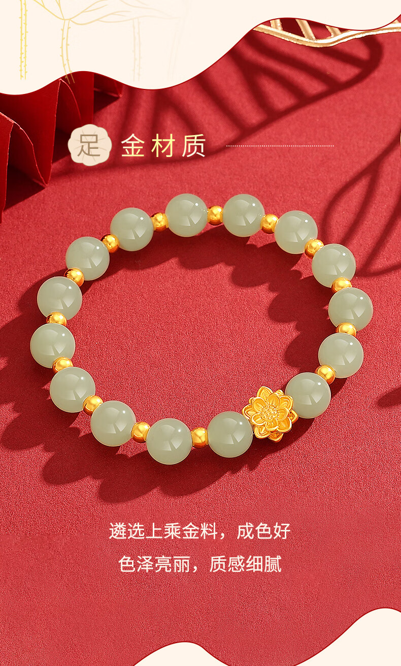 Chow Tai Sang Gold Bracelet Pure Gold Lotus Transfer Beads and Hetian Jade Gold Bracelet for Mom and Girlfriend Christmas Birthday Gift Lotus and Hetian Jade Bracelet Pure Gold About 0.7g~0.8g + Gift Box