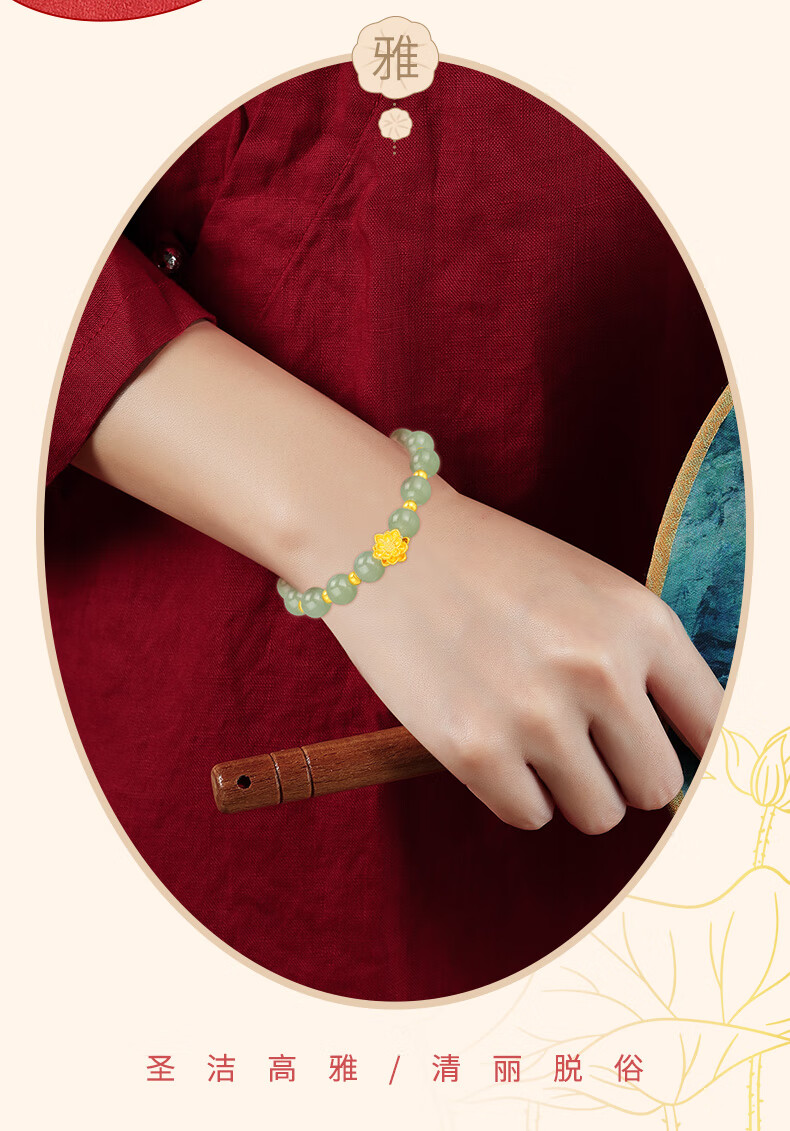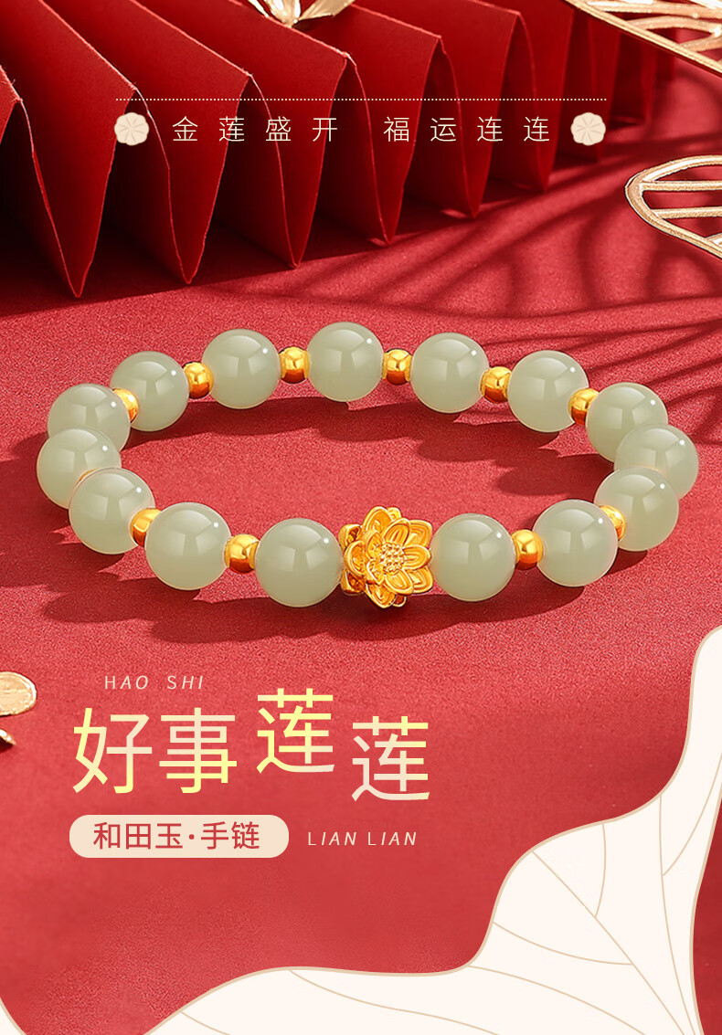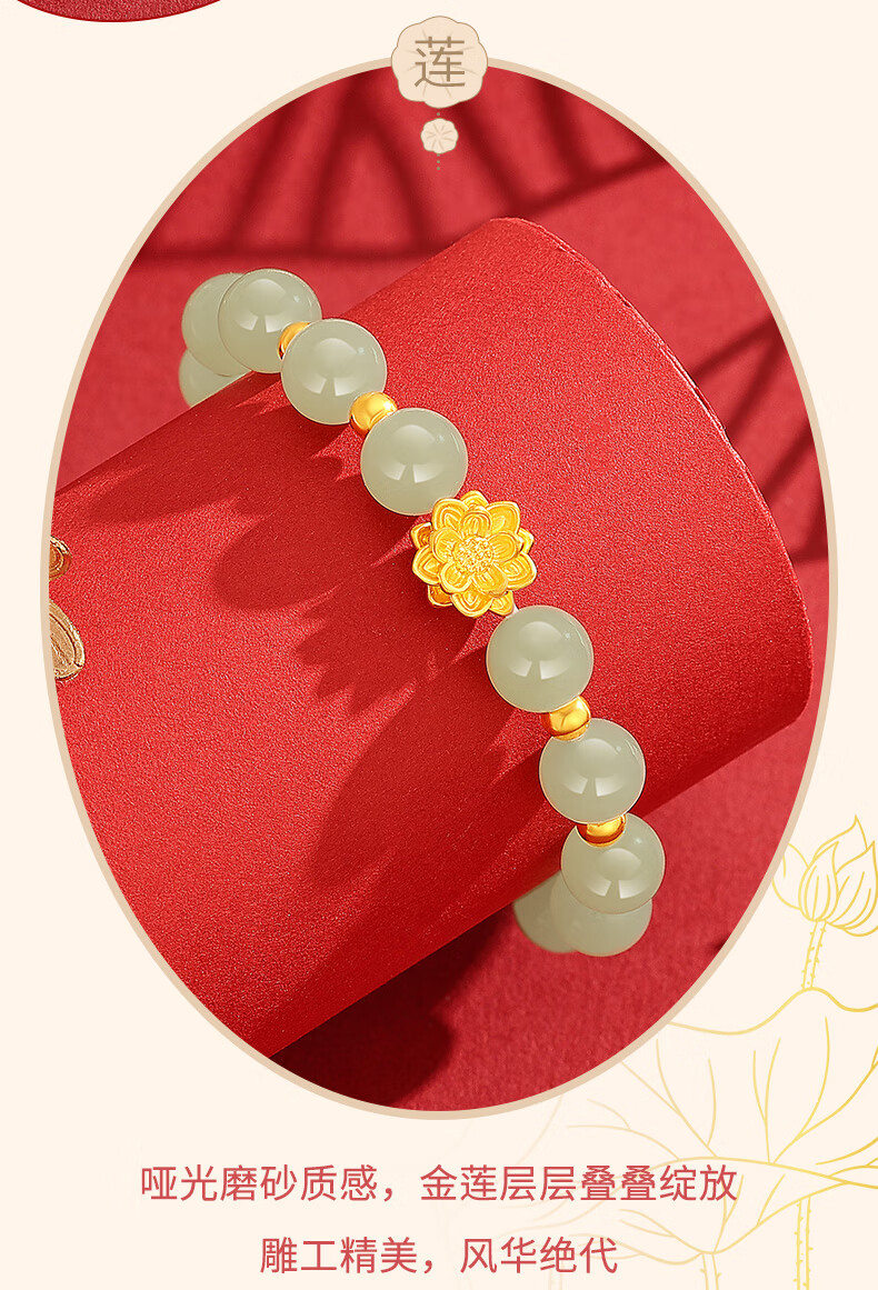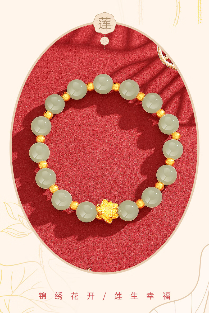 Chow Tai Sang Gold Bracelet Pure Gold Lotus Transfer Beads and Hetian Jade Gold Bracelet for Mom and Girlfriend Christmas Birthday Gift Lotus and Hetian Jade Bracelet Pure Gold About 0.7g~0.8g + Gift Box