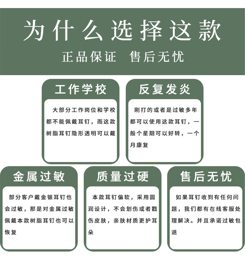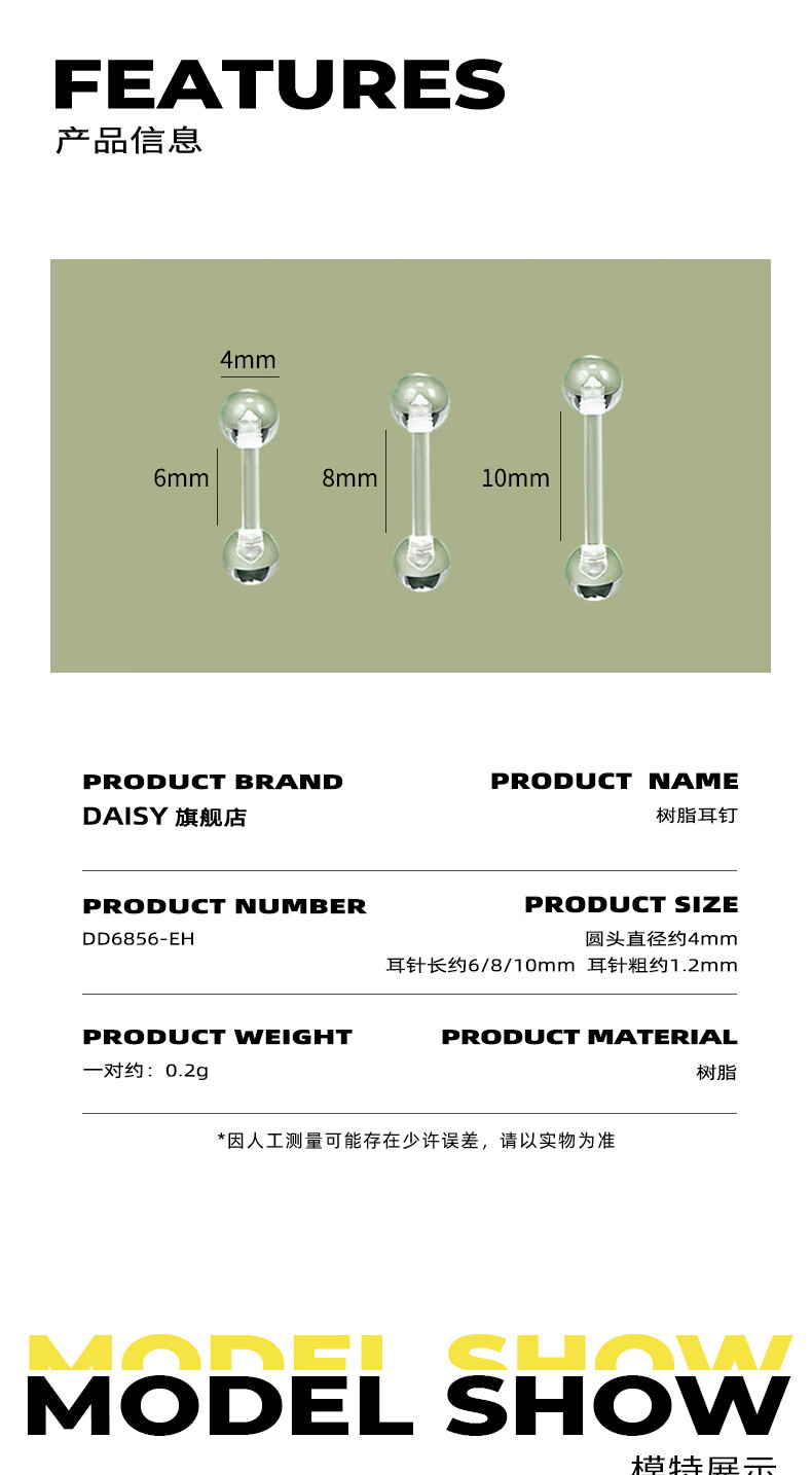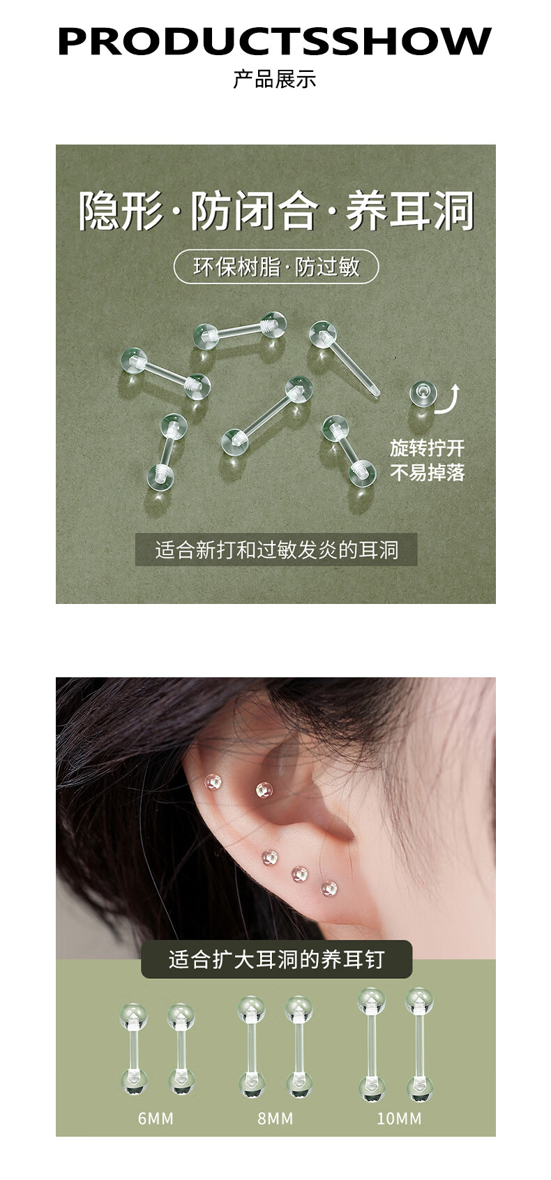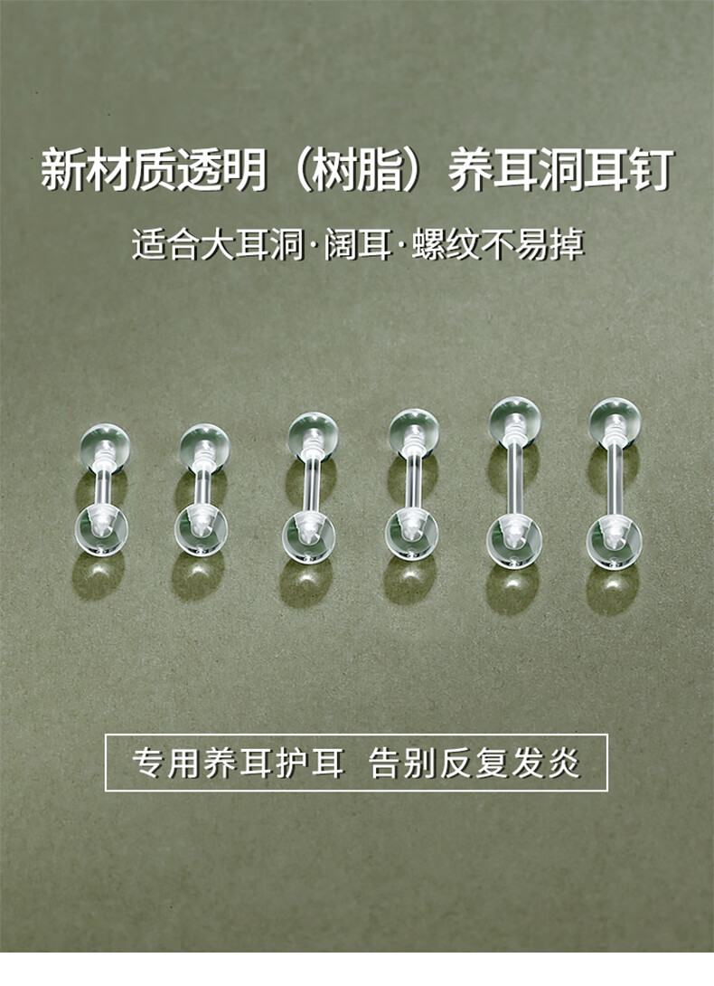 DAISY DREAM养耳洞树脂耳钉女防掉透明隐形耳棒耳骨钉扩耳防堵针学生免摘耳饰 【1对】6mm树脂耳钉