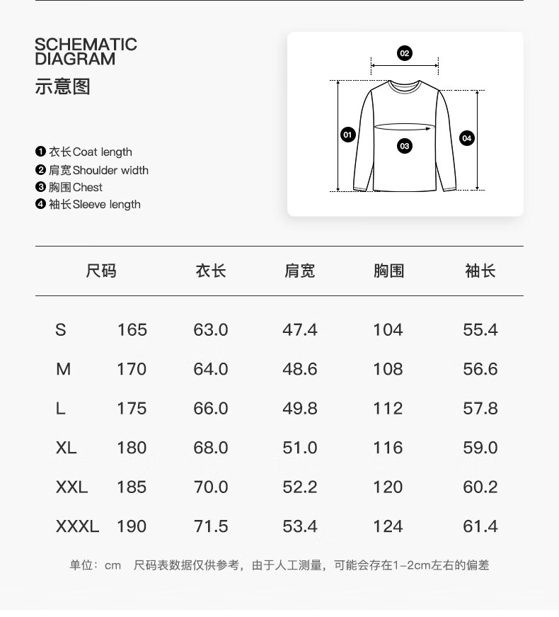 China (cm) 165 / 88-90 170 / 96-98 175 / 108-110 180 / 118-122 185 / 126-130