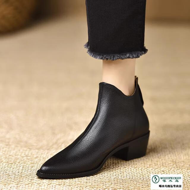 Woodpecker 4.5cm Genuine Leather Pointed Toe Thick Heel Short Boots for Women Comfortable Soft Sheepskin 2025 Autumn Ankle Boots Short Ankle Boots Khaki 37