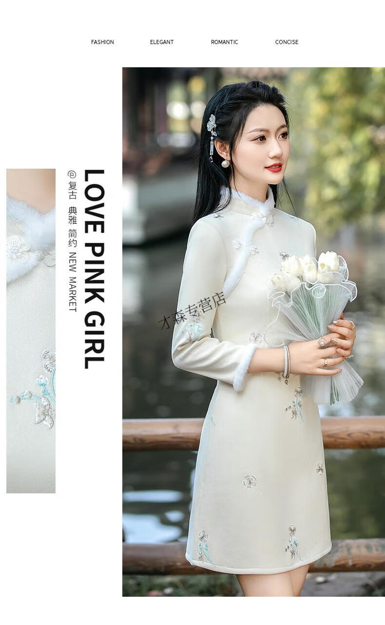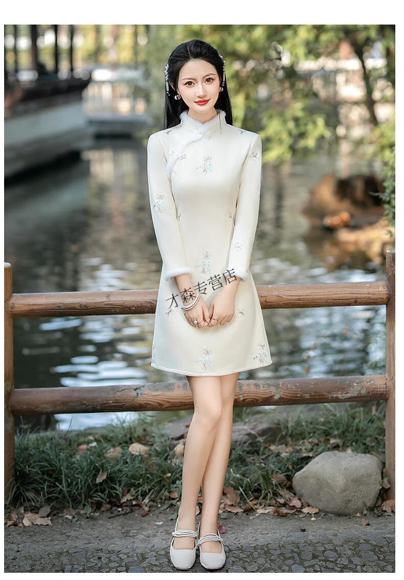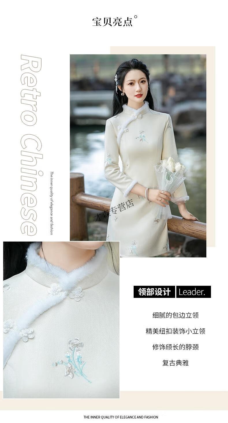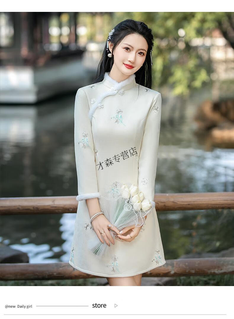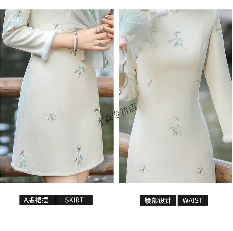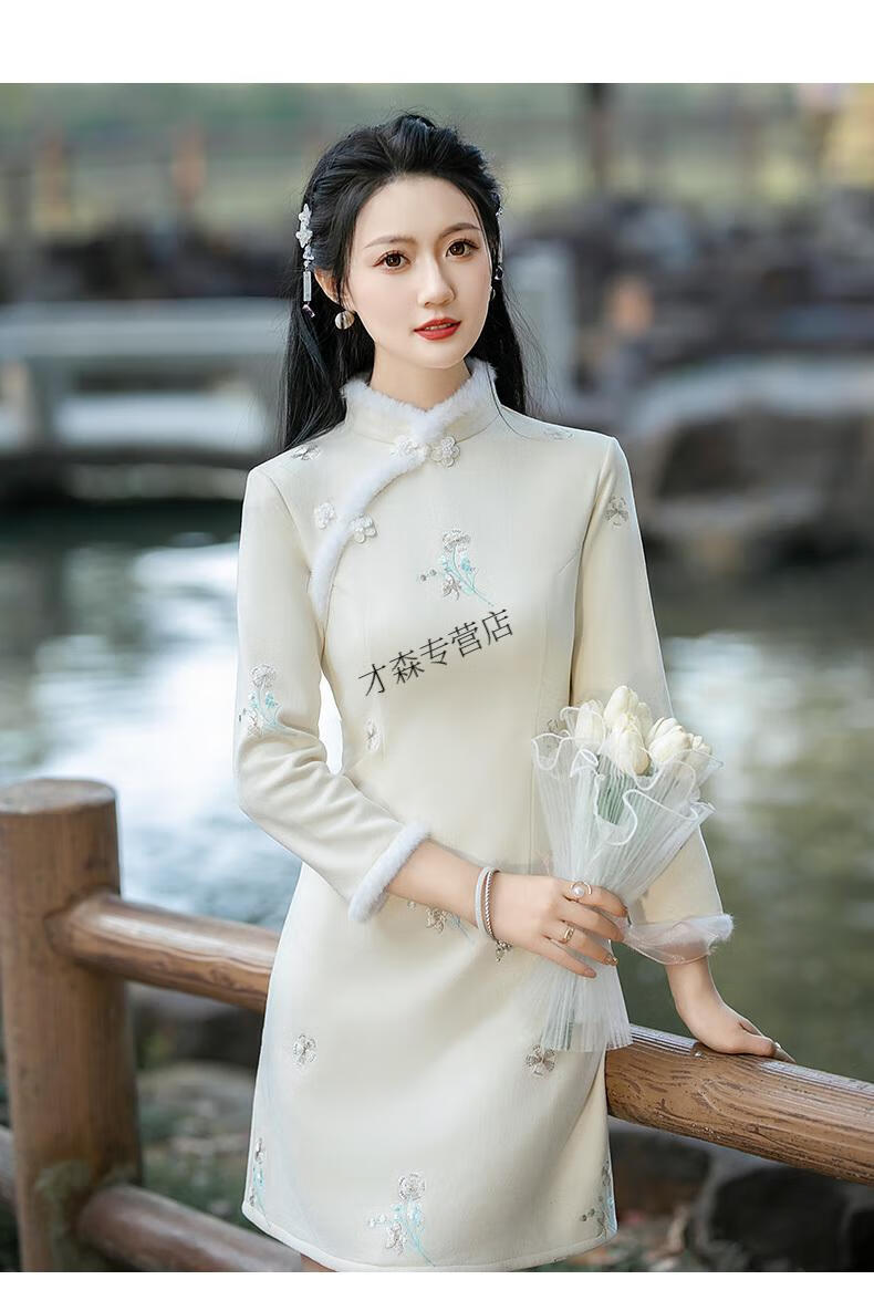 Pierre Cardin velvet thickened embroidery 150 small a version improved cheongsam 2025 winter new long-sleeved literary youthful style beige embroidery suede plus velvet M 85-95Jin Jin is equal to 0.5 kg